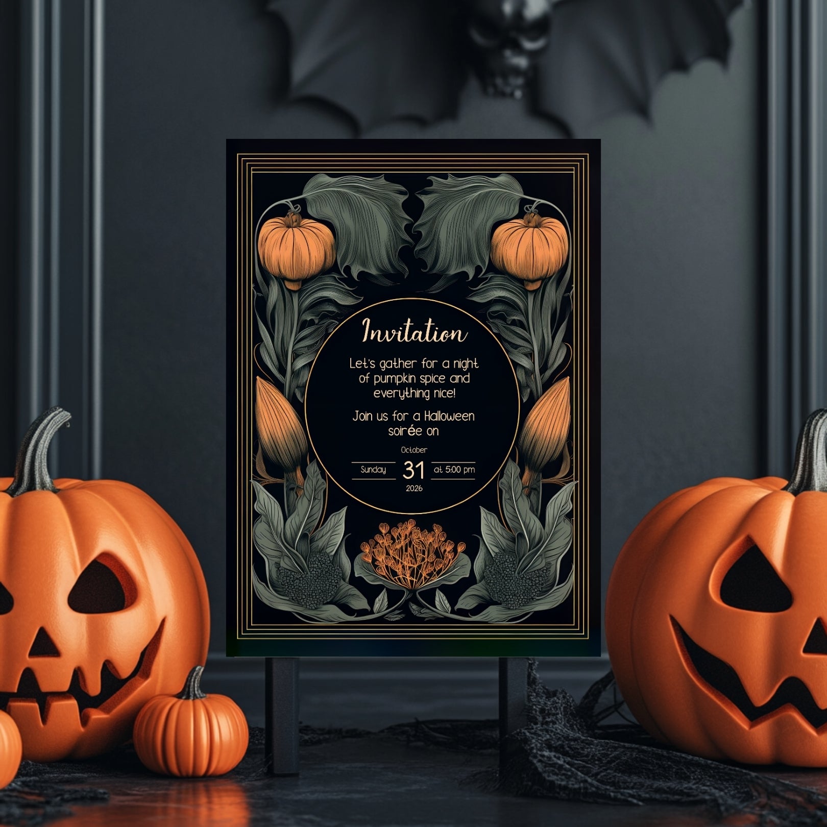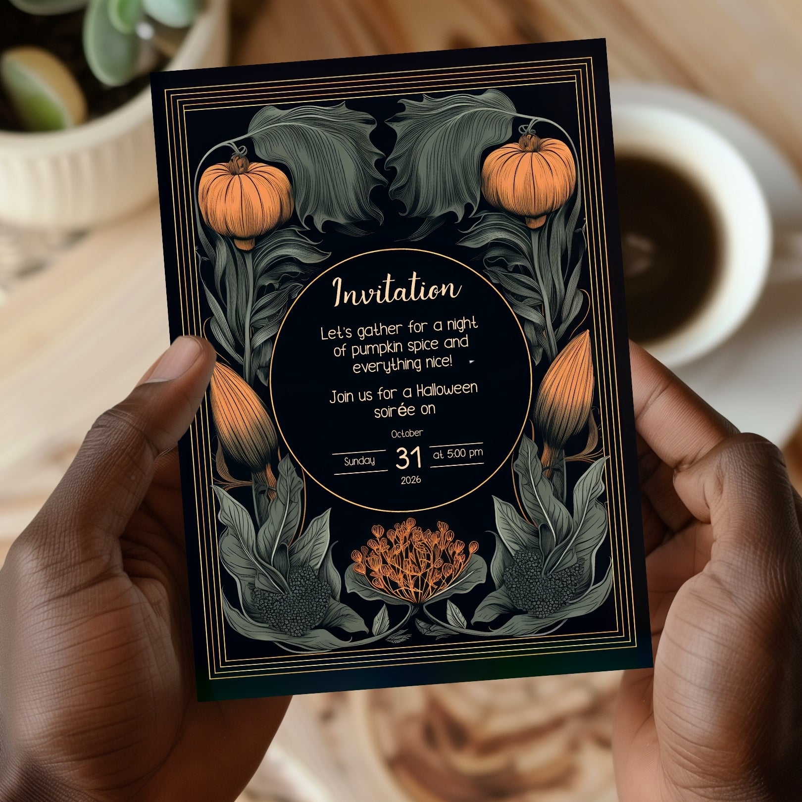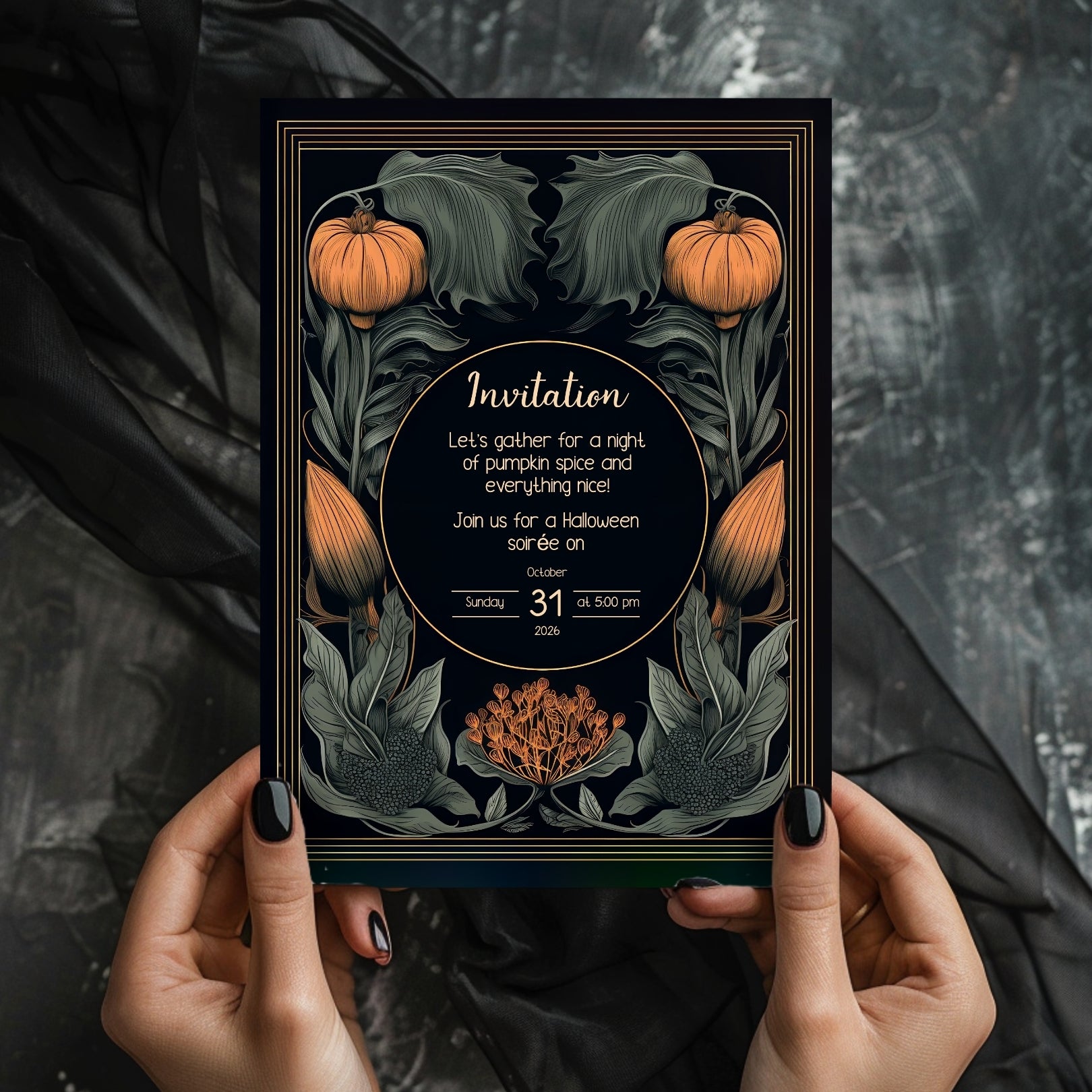 Celebrate Halloween with the warmth of autumn and a touch of gothic elegance with this Autumn Gothic Halloween invitation. Featuring rich motifs of pumpkins, ornate florals, and lush leaves, this invitation perfectly captures the essence of the season while adding a sophisticated, spooky twist. The warm tones of orange, green, and gold contrast beautifully against the dark background, creating a design that is both inviting and elegant.