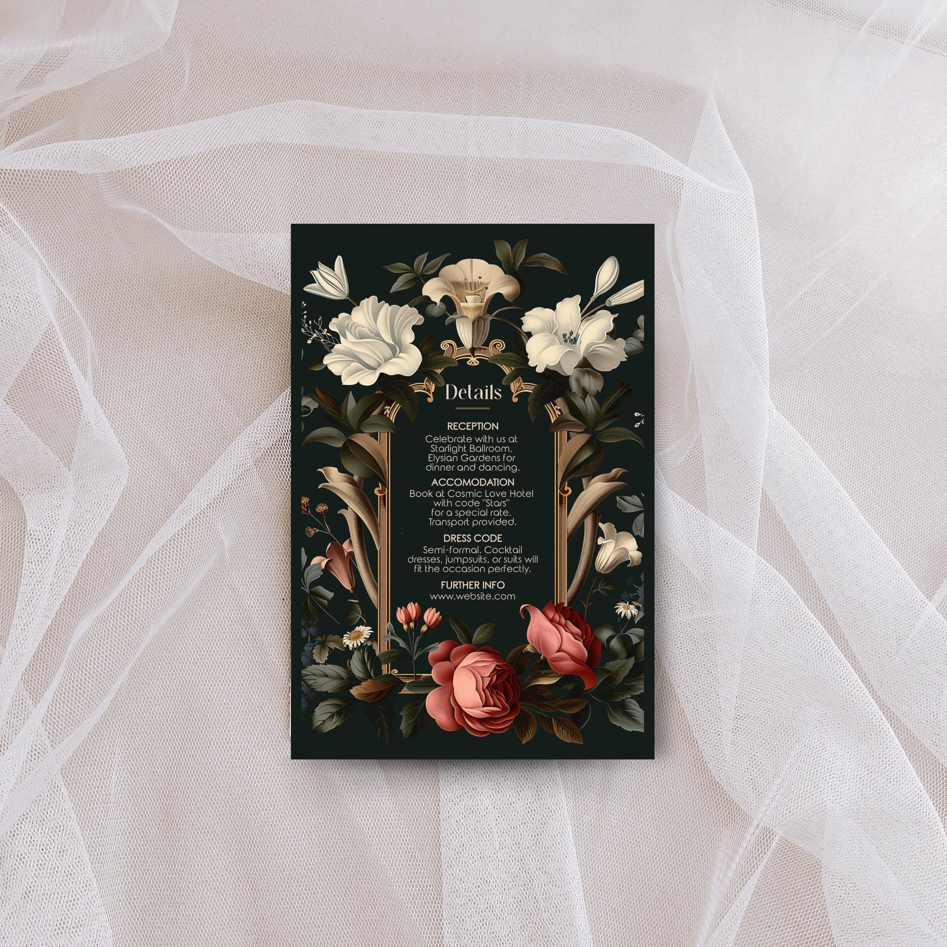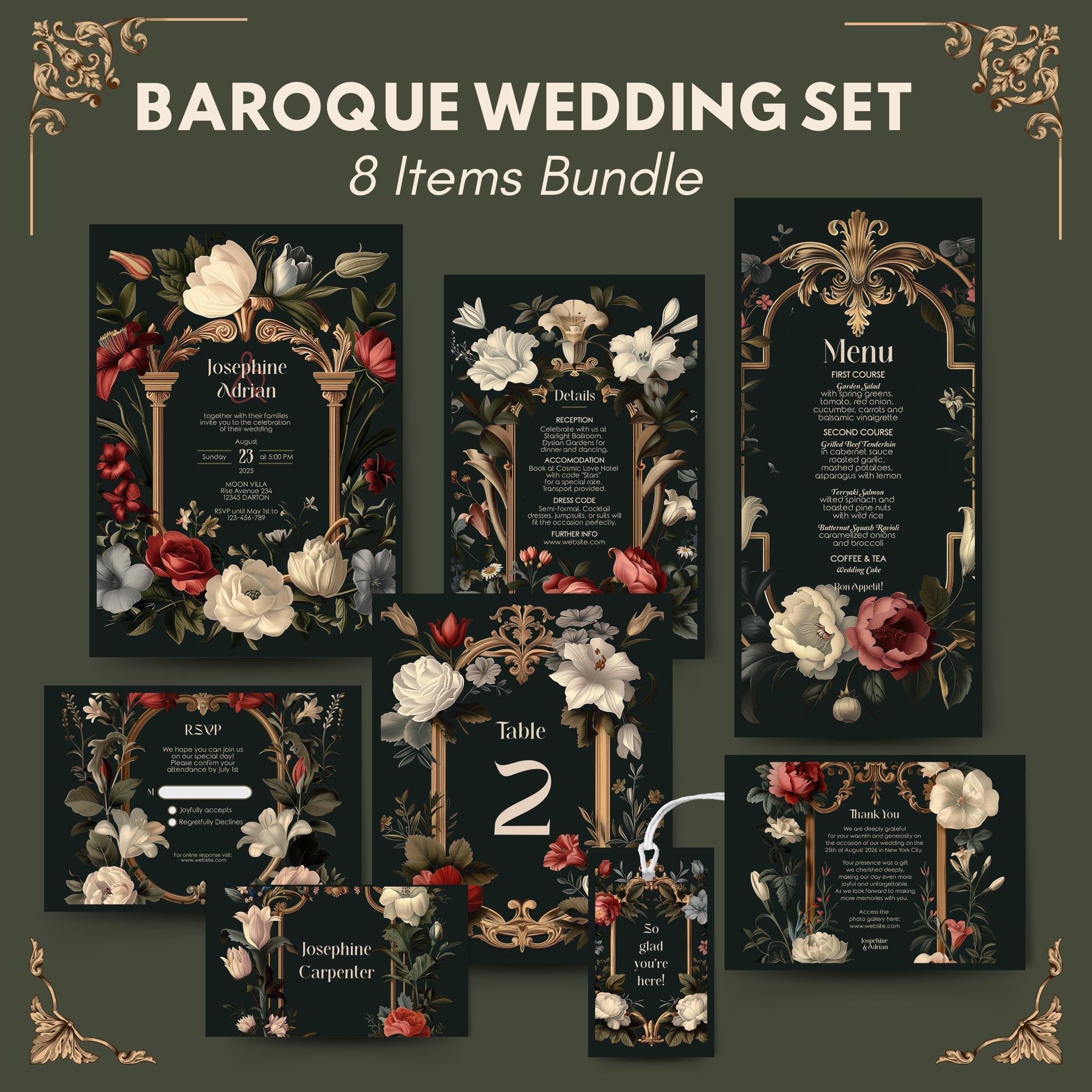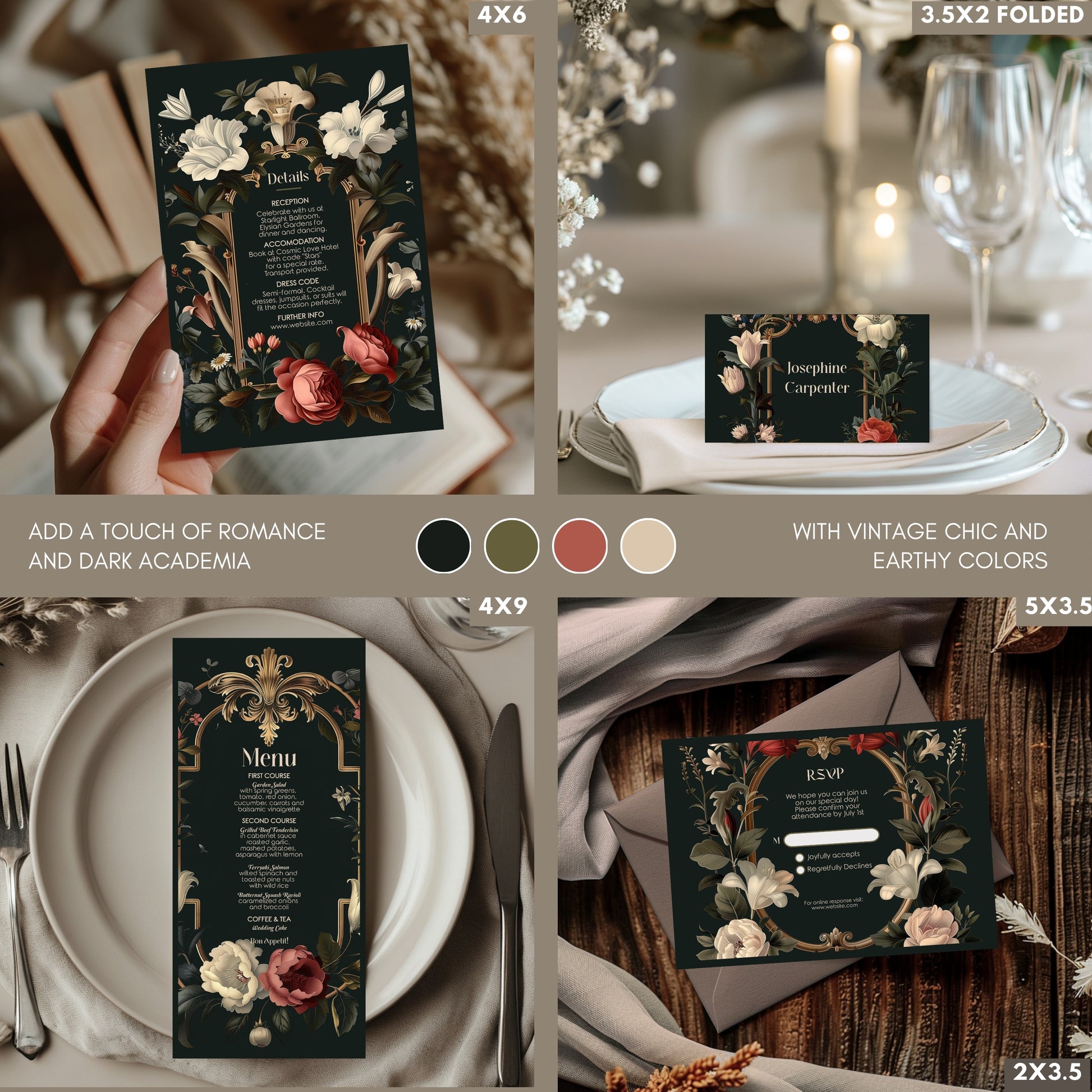 Baroque Wedding Invitation Set - Dark Vintage Botanical Garden, Gold Frame, Editable 8 items
