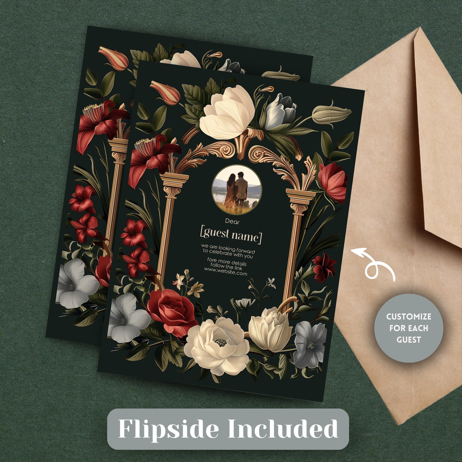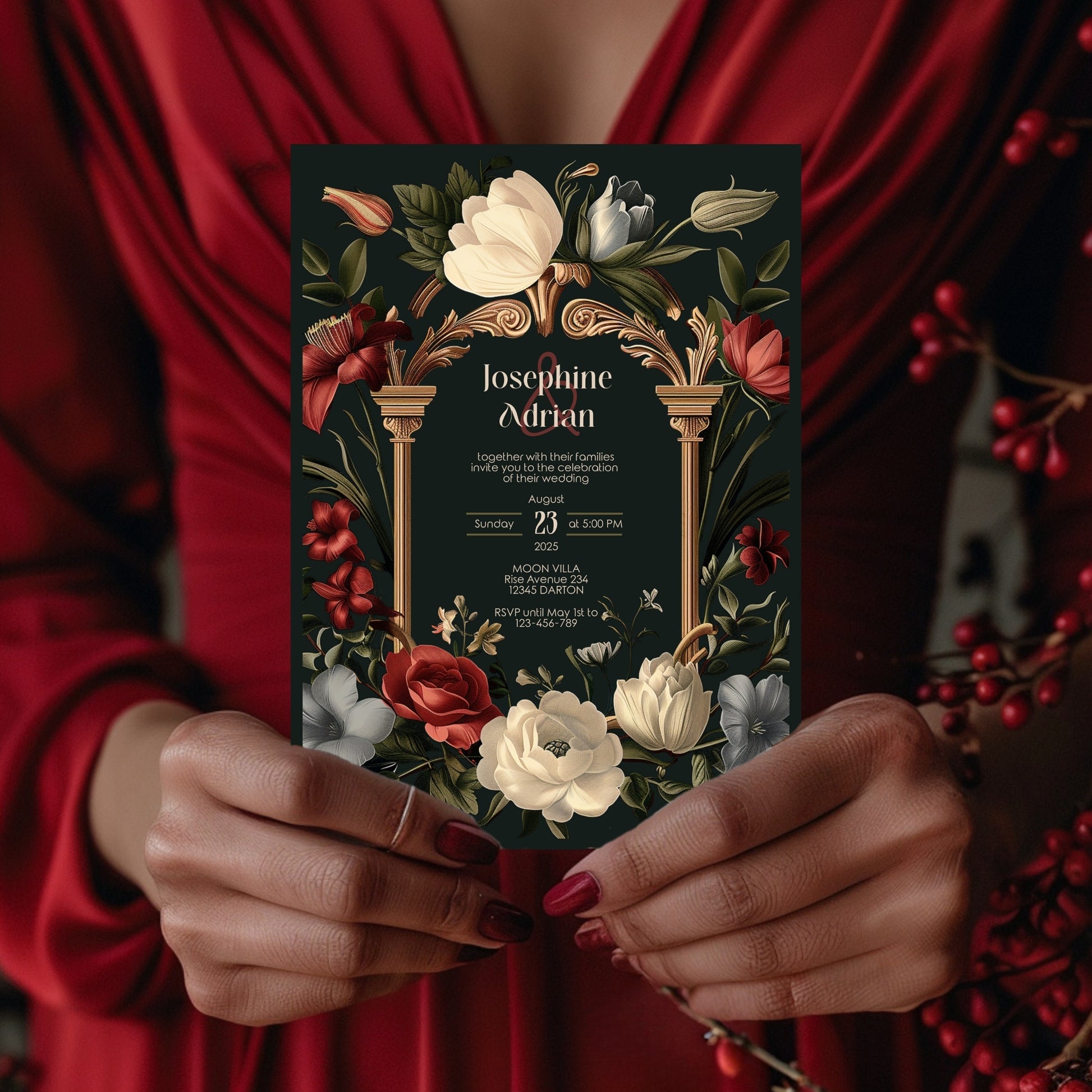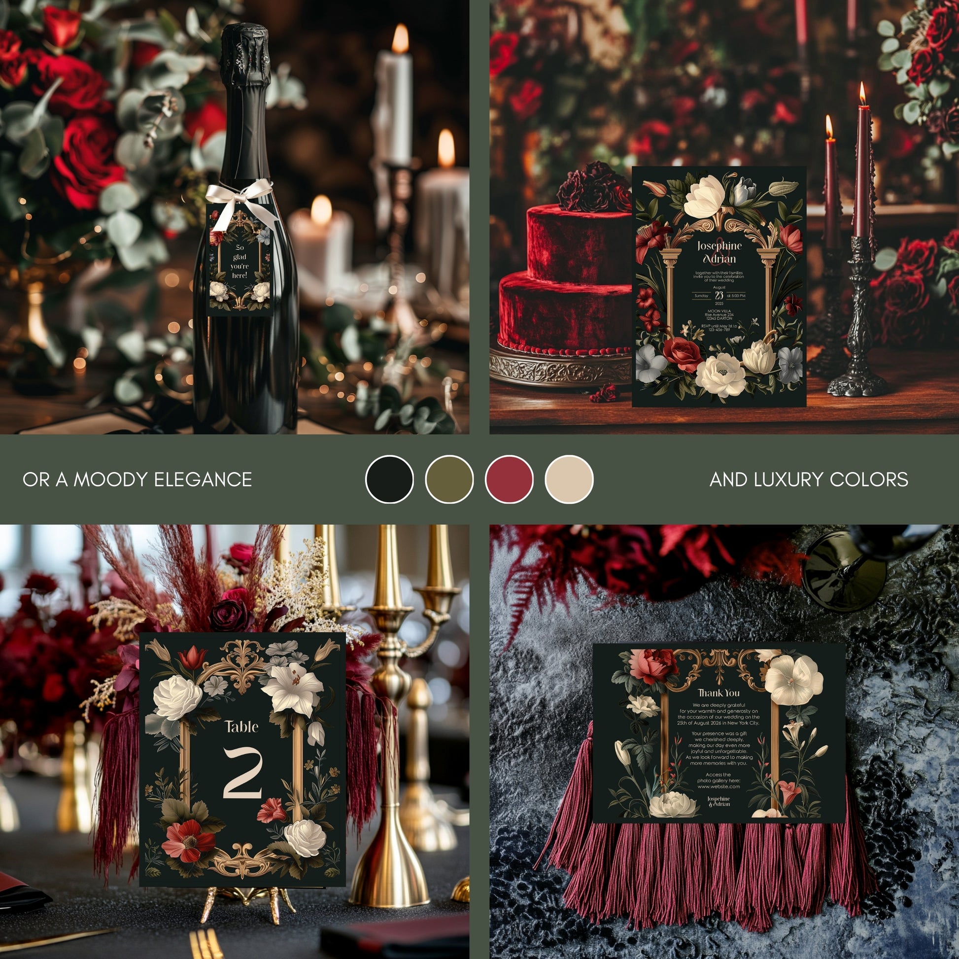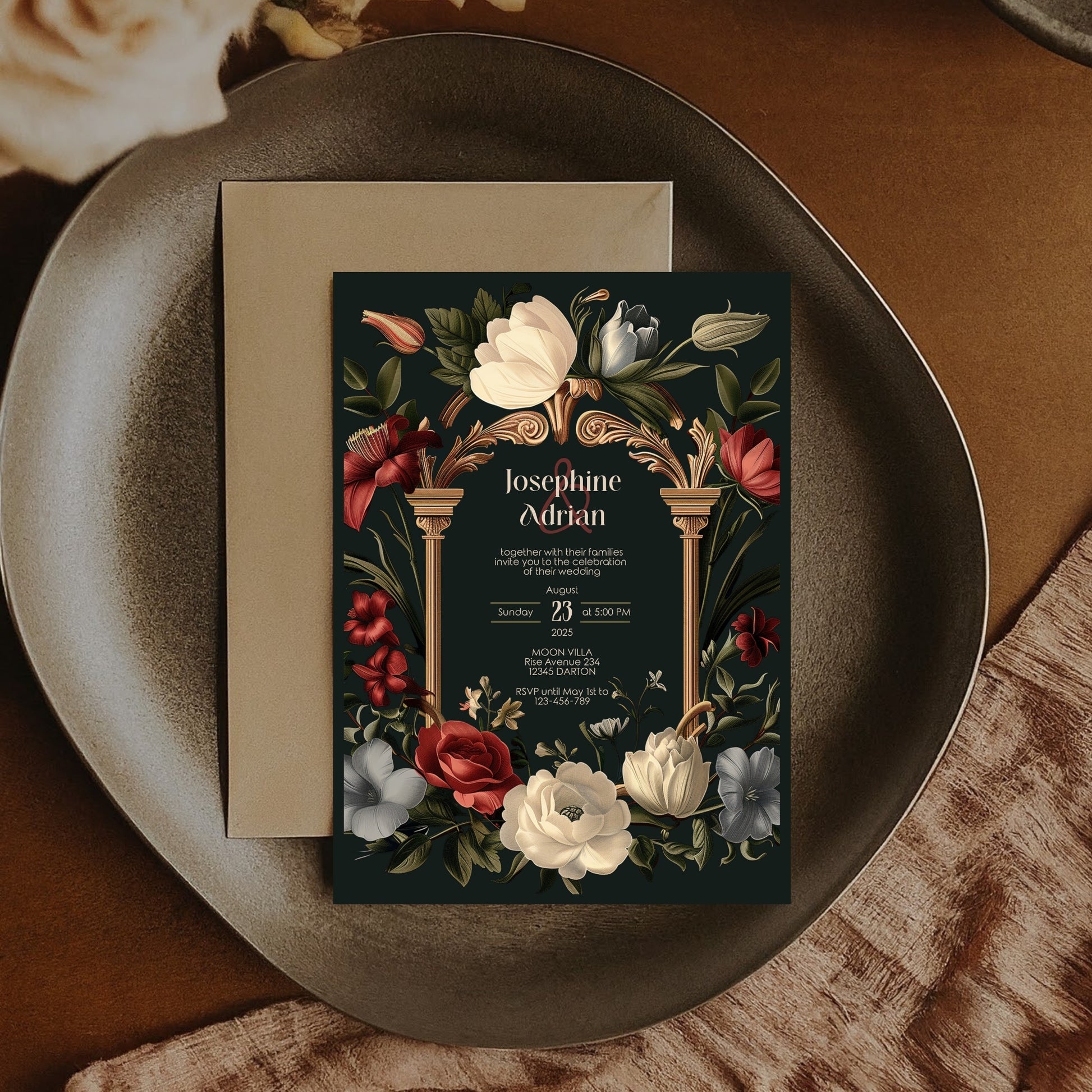 Baroque Wedding Invitation Set - Dark Vintage Botanical Garden, Gold Frame, Editable 8 items
