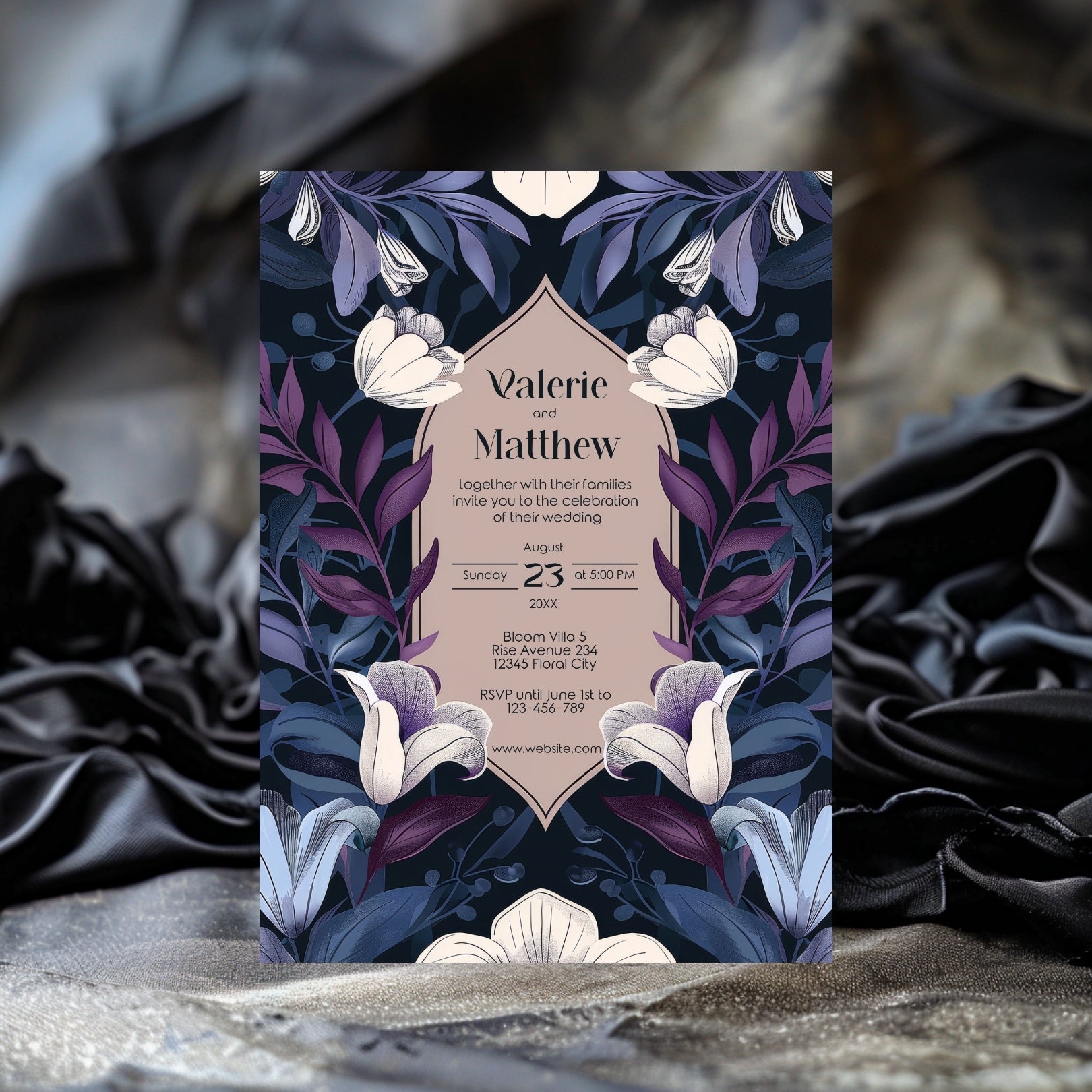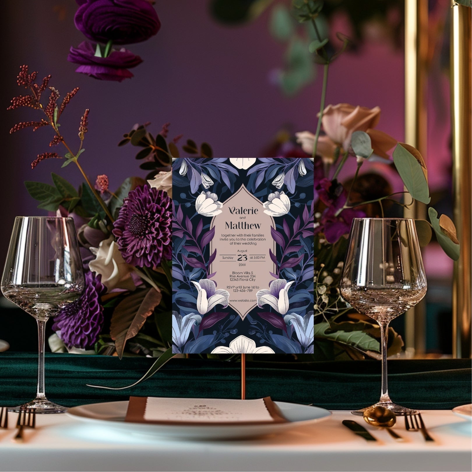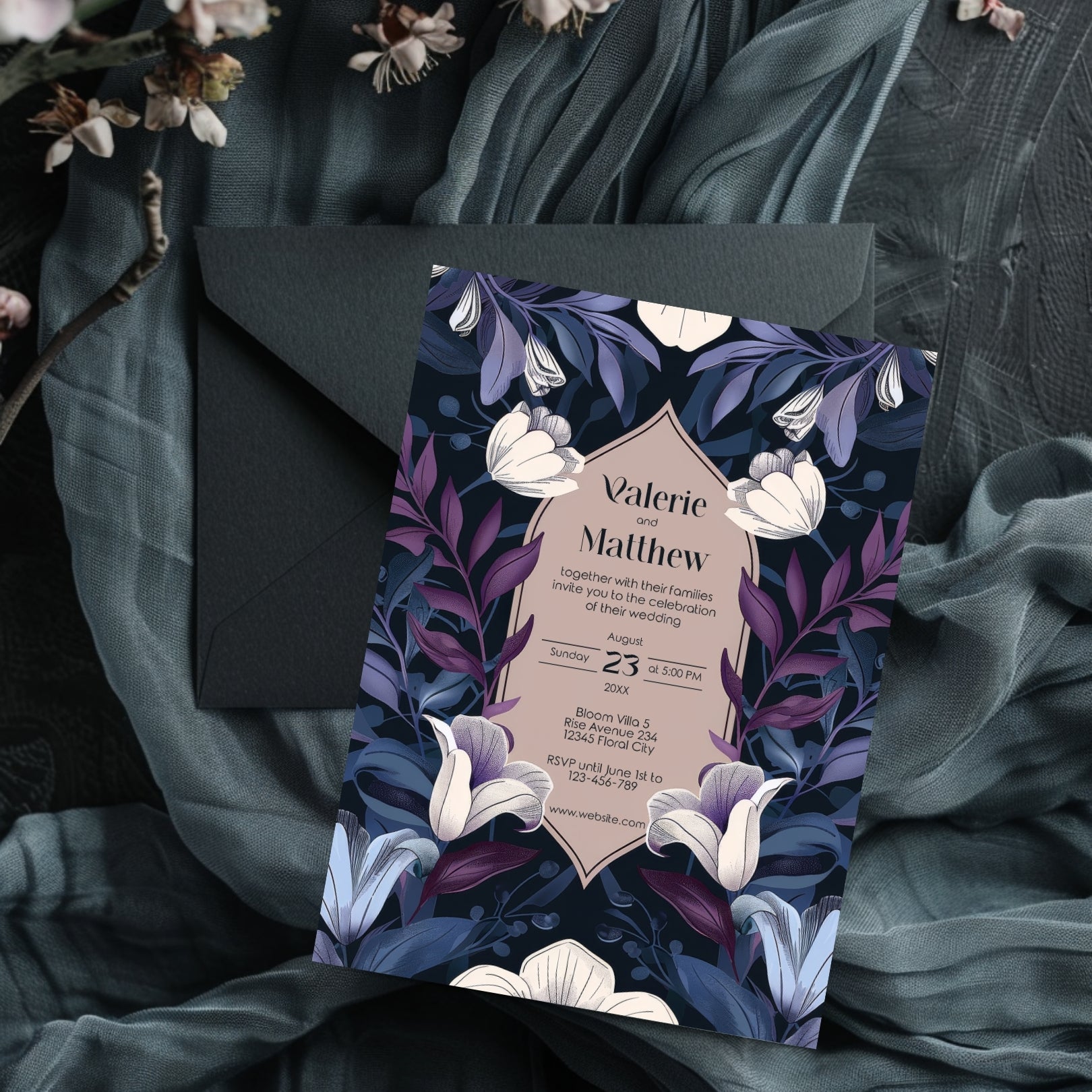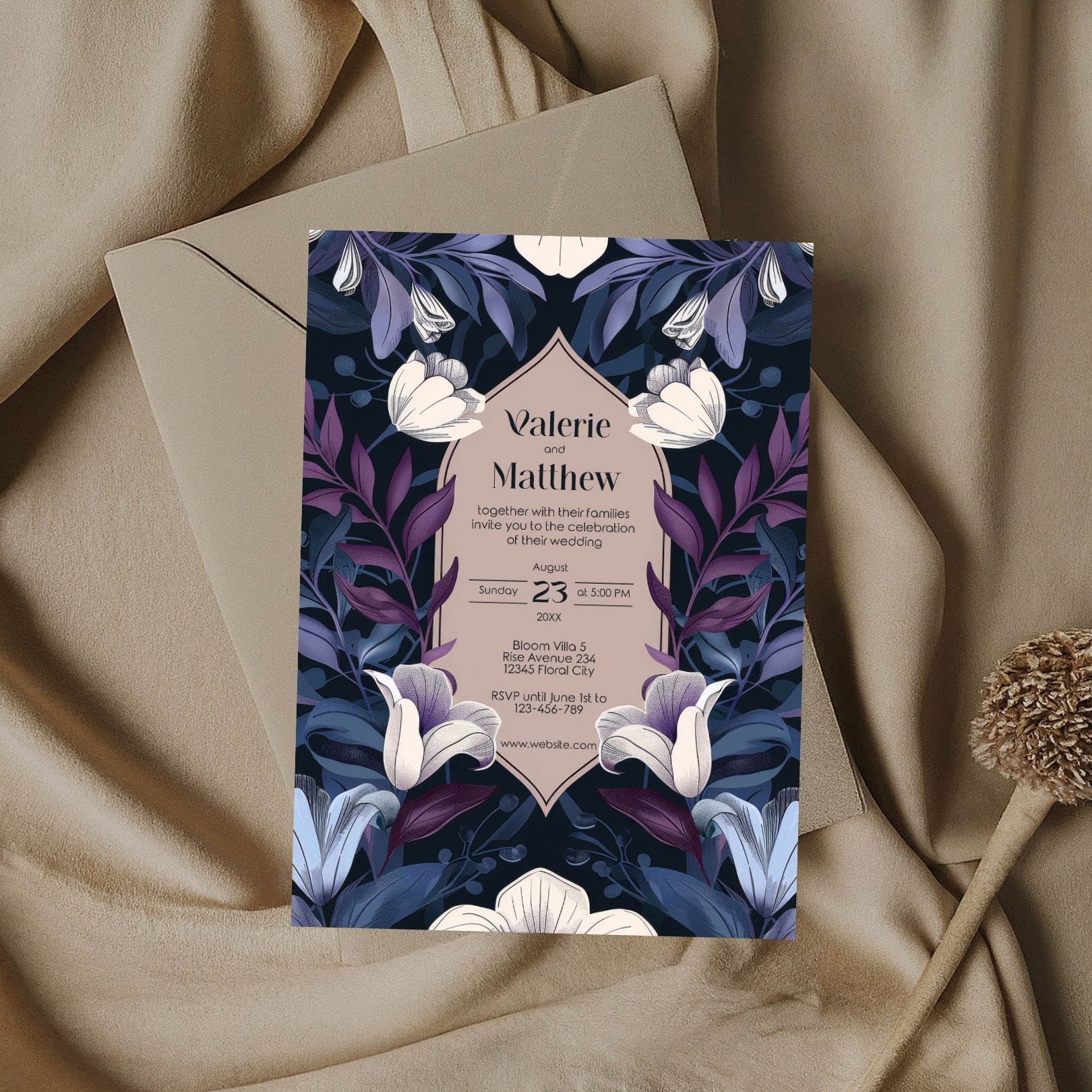 This beautifully designed wedding invitation blends modern botanical elements with the elegance of Art Nouveau style. Featuring rich, deep tones of navy and purple, accented by delicate beige florals, this invitation is perfect for couples seeking a romantic and vintage-inspired feel for their big day. The central arch layout highlights your wedding details, surrounded by lush floral motifs that evoke sophistication and elegance.