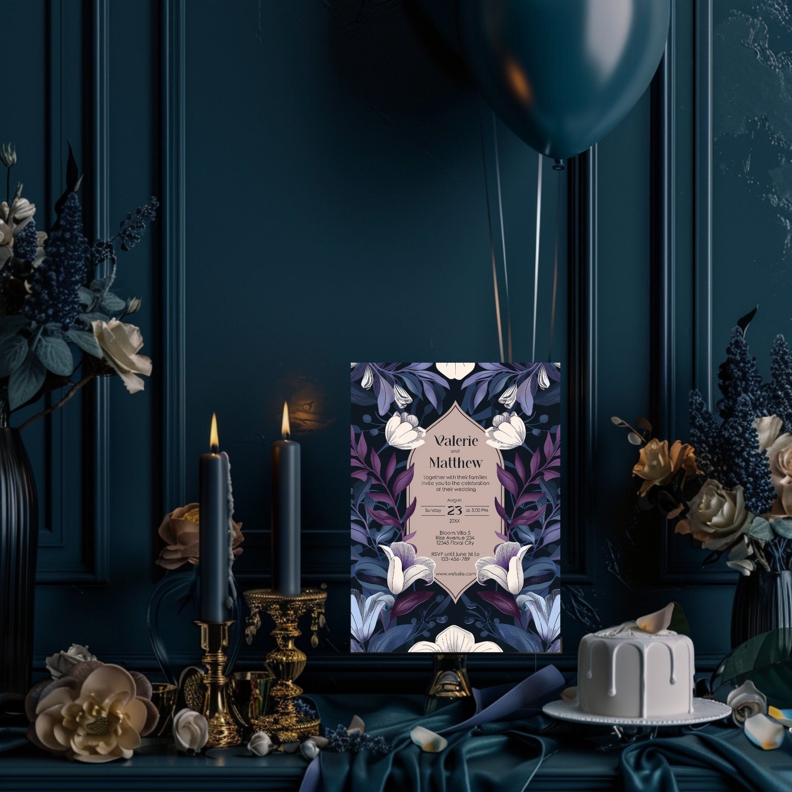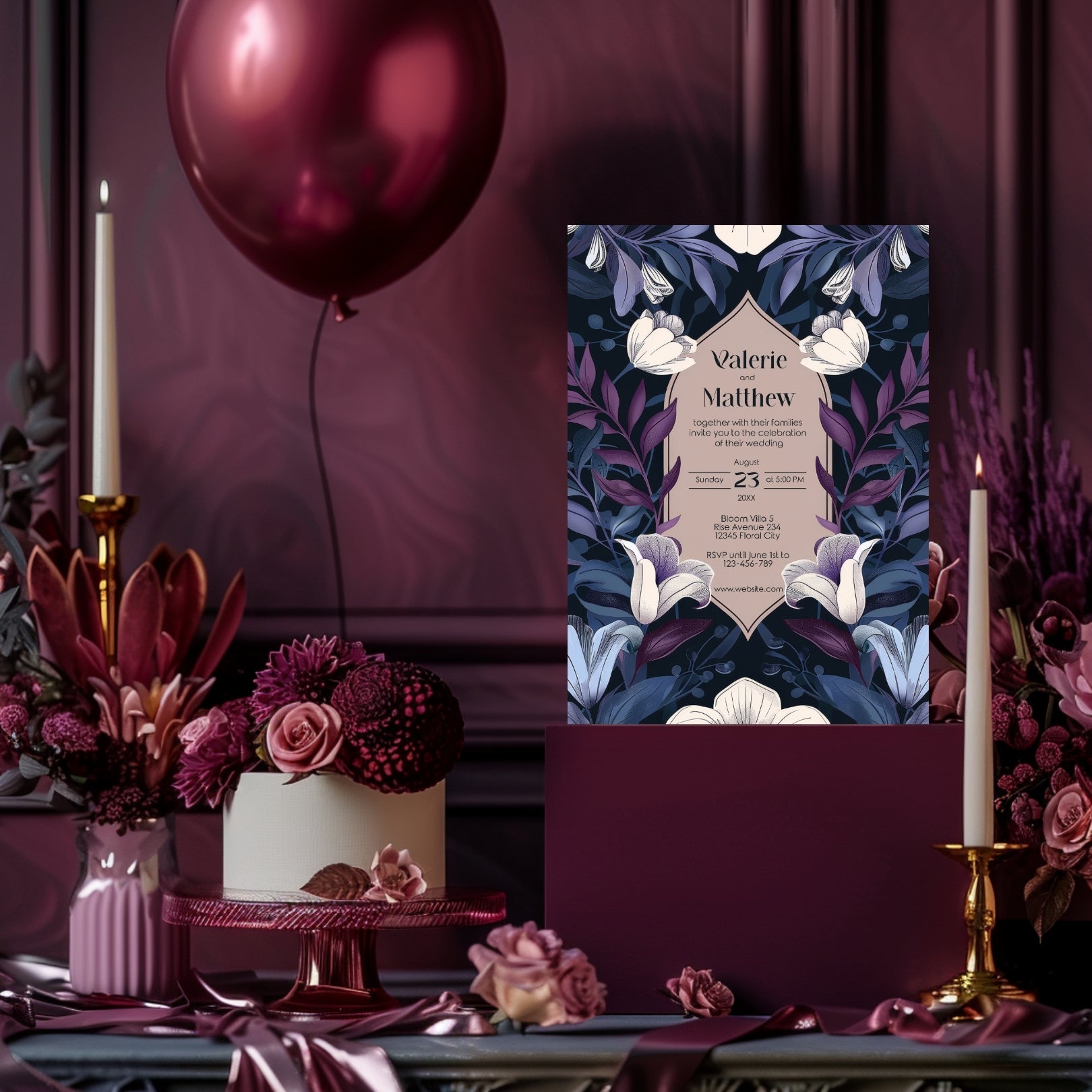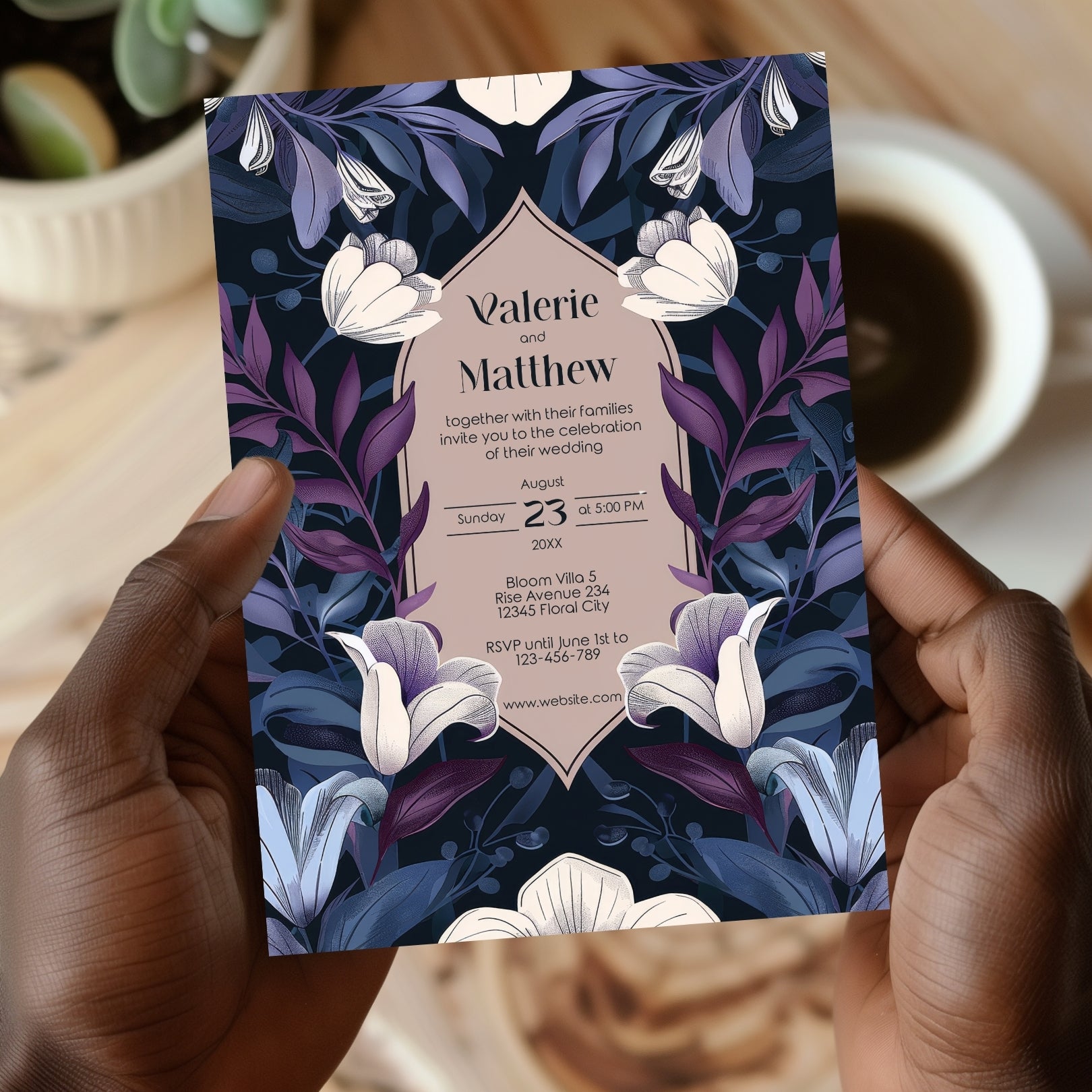 This beautifully designed wedding invitation blends modern botanical elements with the elegance of Art Nouveau style. Featuring rich, deep tones of navy and purple, accented by delicate beige florals, this invitation is perfect for couples seeking a romantic and vintage-inspired feel for their big day. The central arch layout highlights your wedding details, surrounded by lush floral motifs that evoke sophistication and elegance.