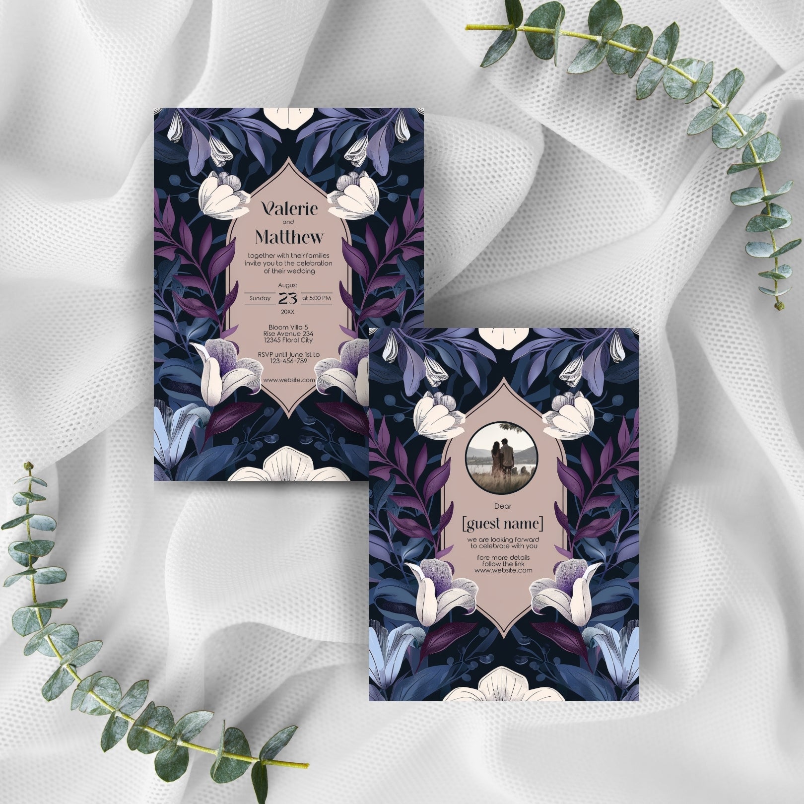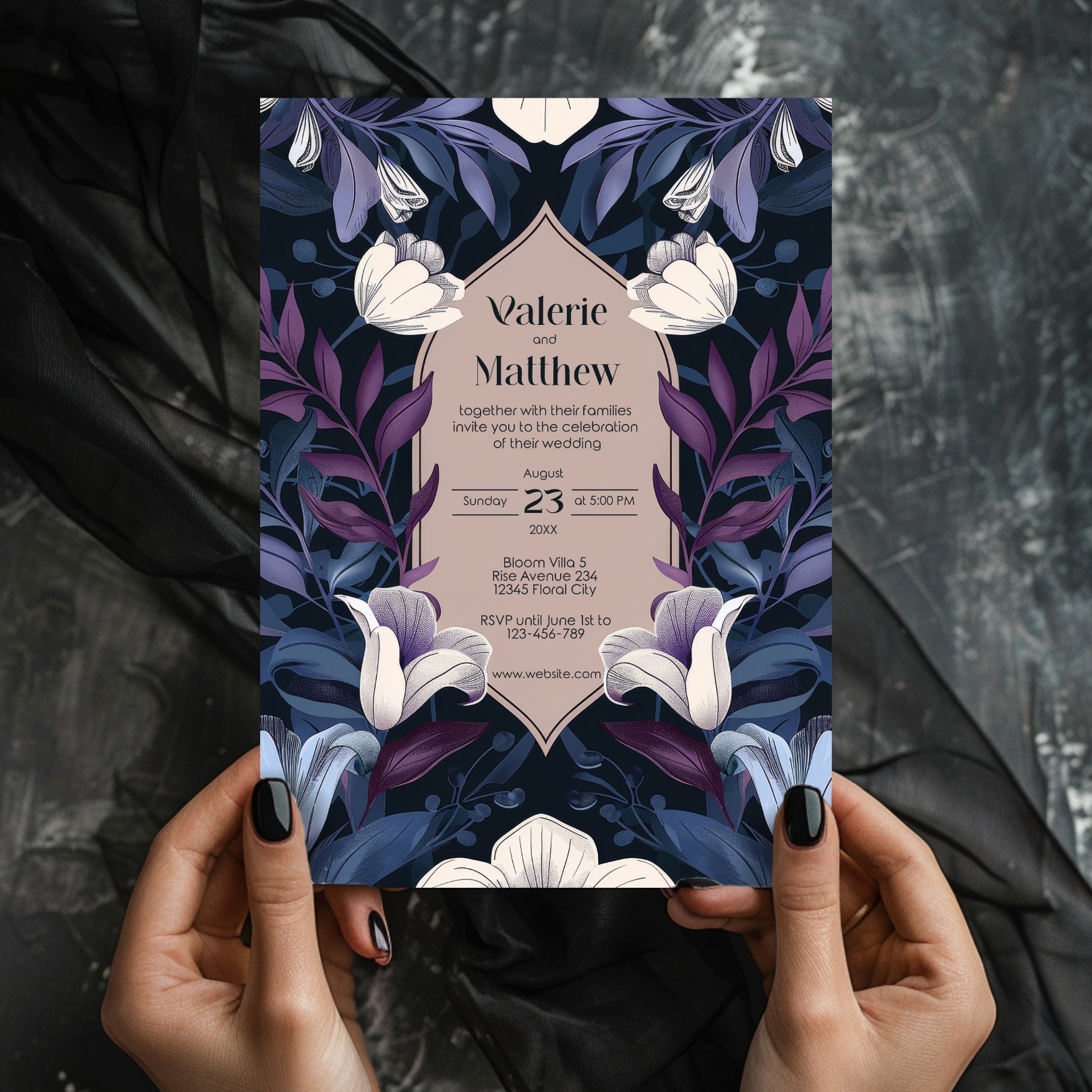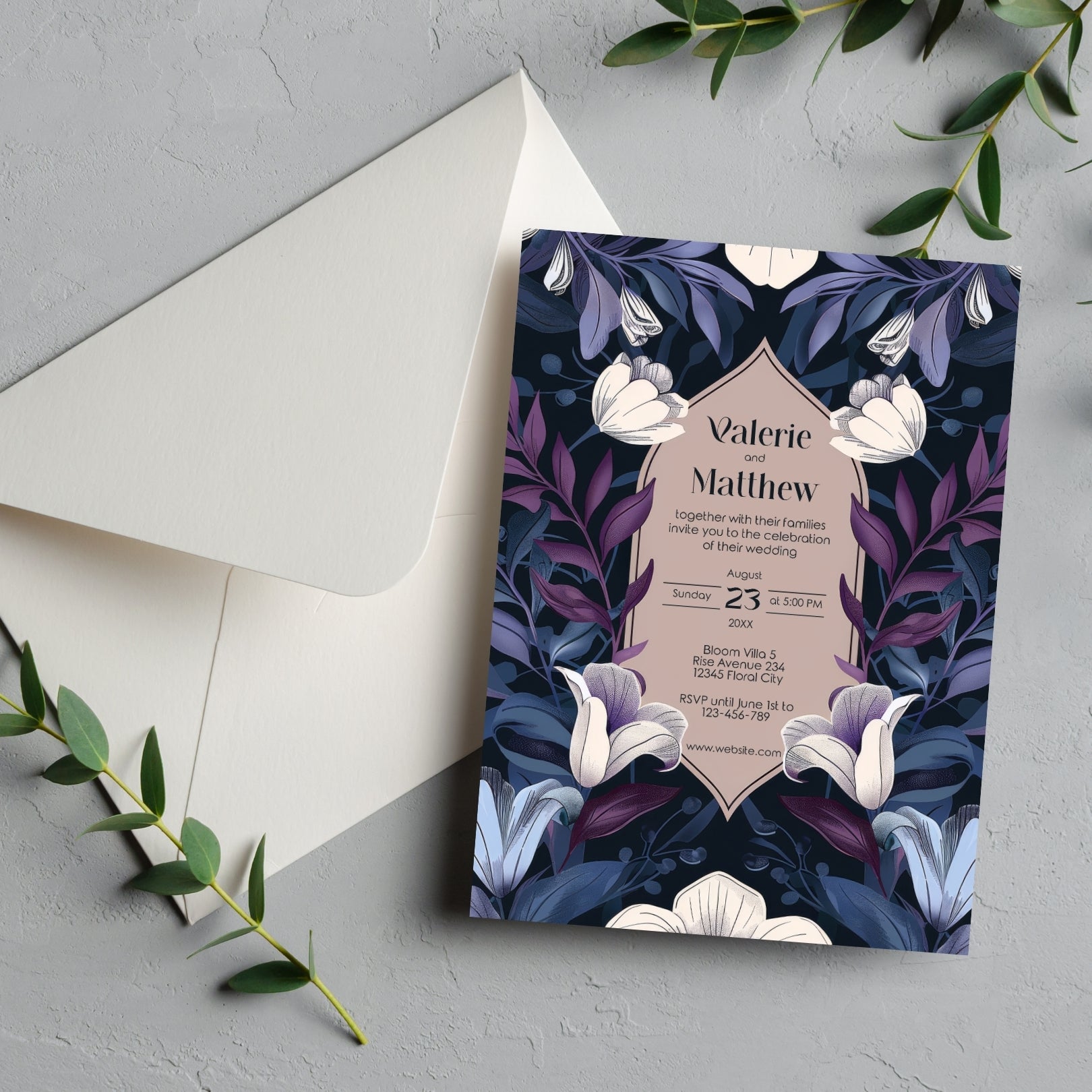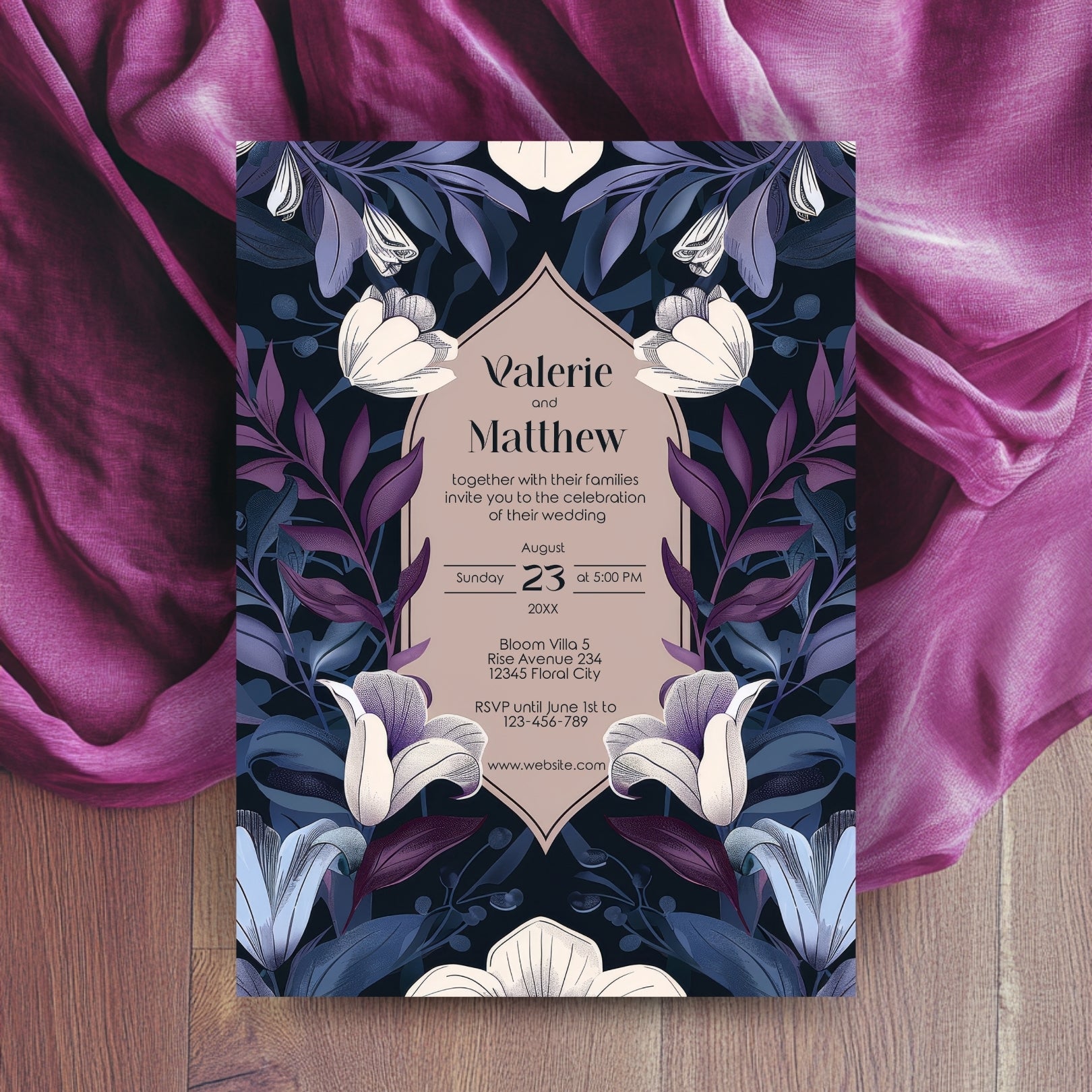This beautifully designed wedding invitation blends modern botanical elements with the elegance of Art Nouveau style. Featuring rich, deep tones of navy and purple, accented by delicate beige florals, this invitation is perfect for couples seeking a romantic and vintage-inspired feel for their big day. The central arch layout highlights your wedding details, surrounded by lush floral motifs that evoke sophistication and elegance.