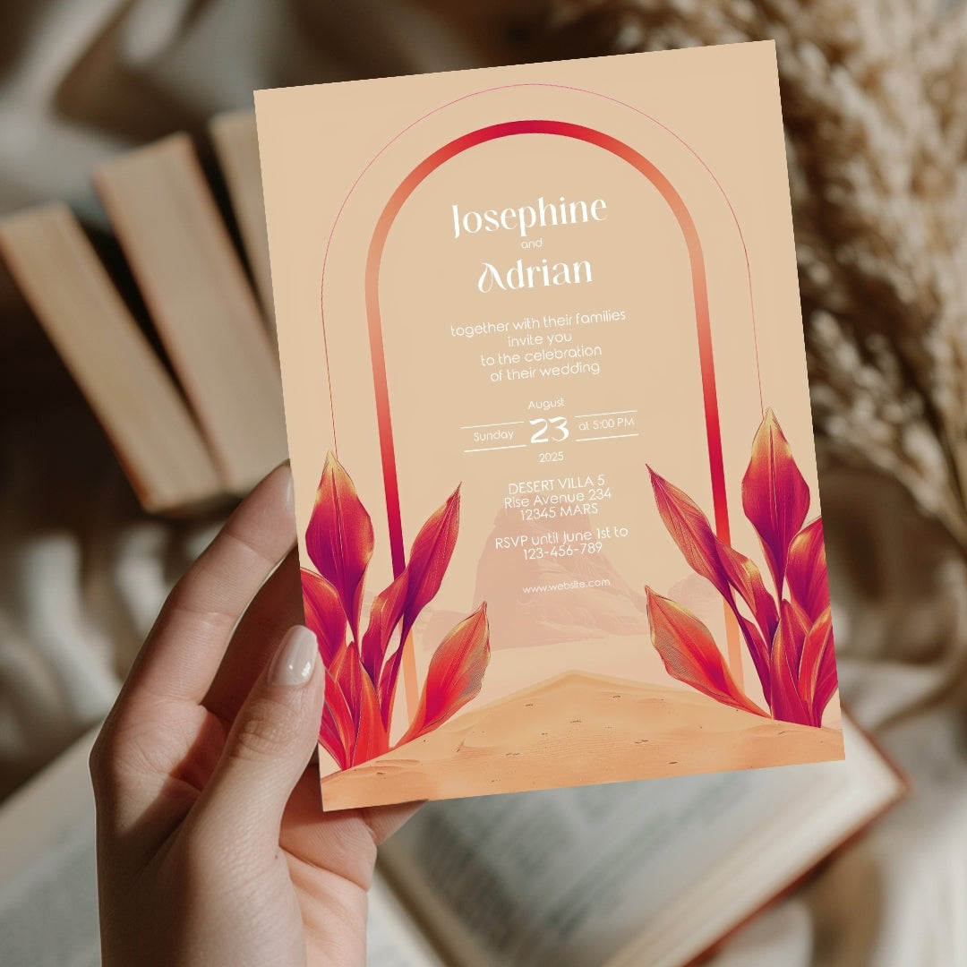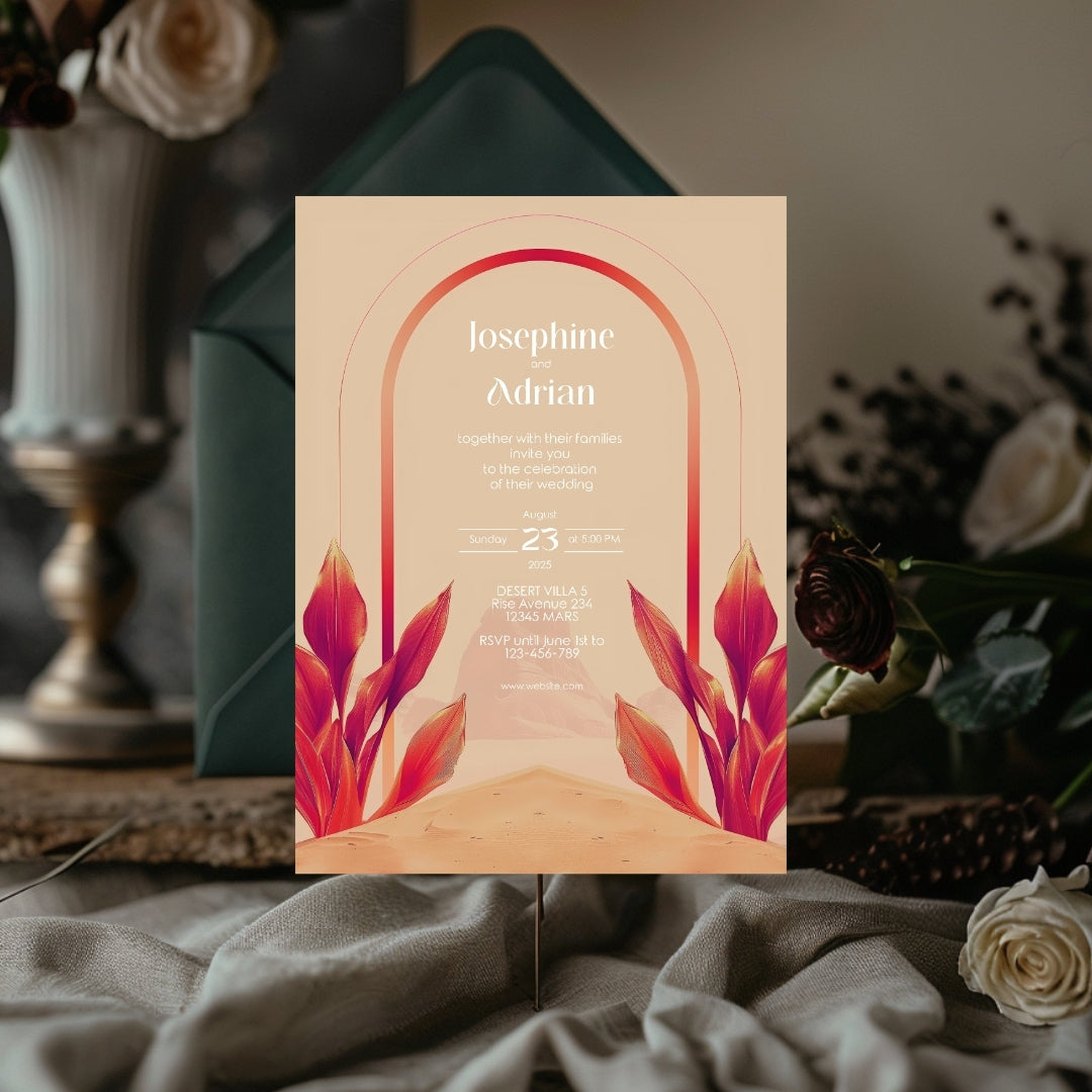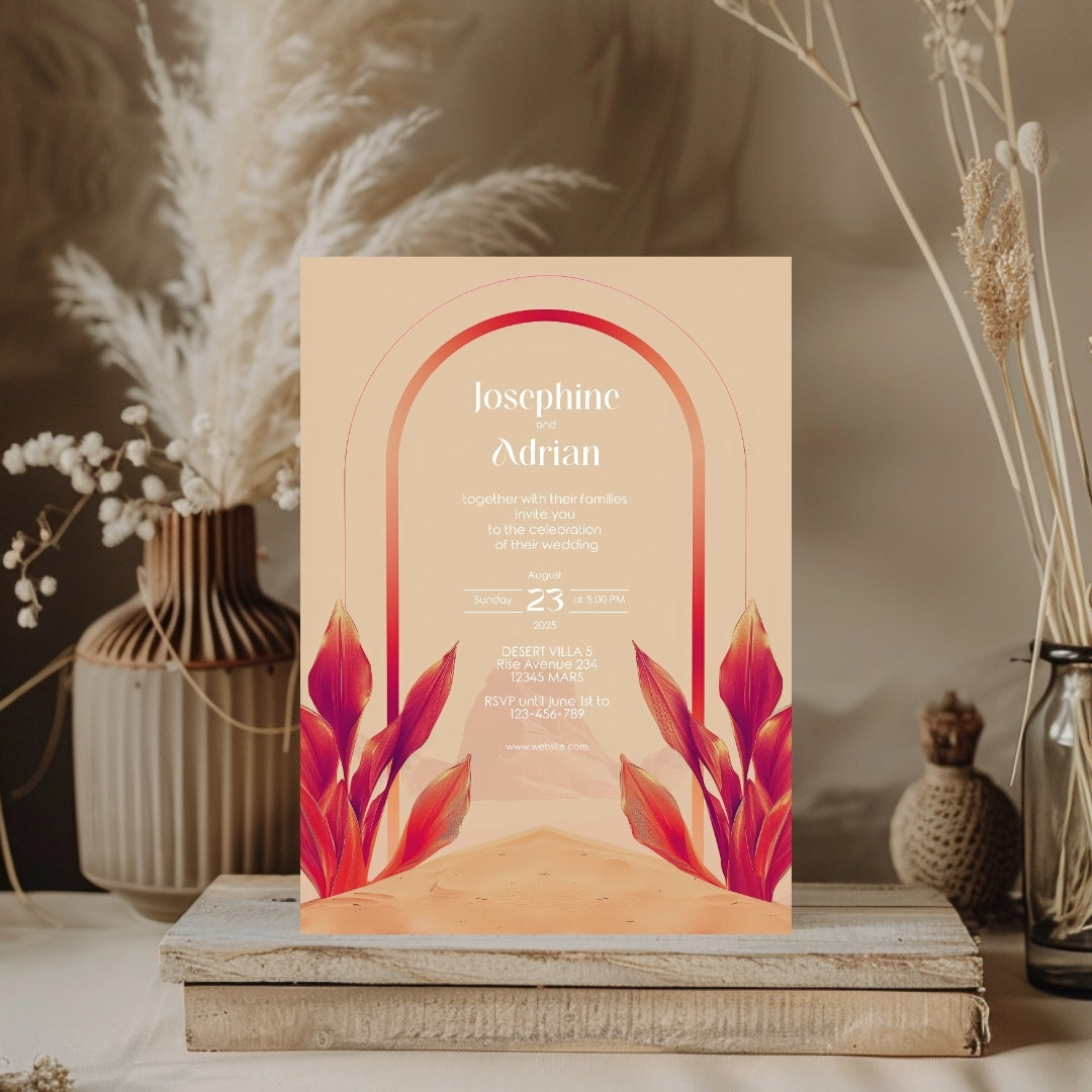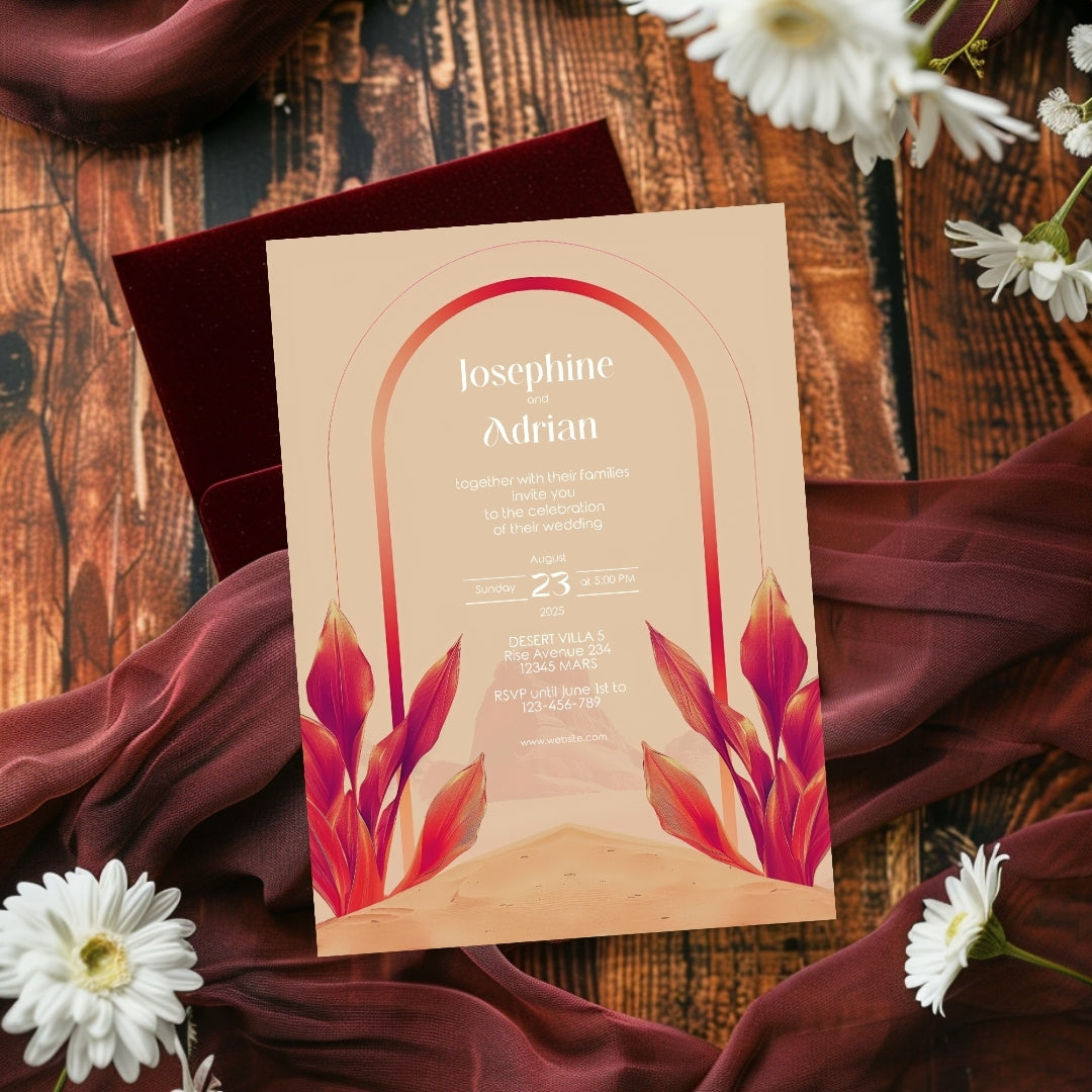 This Elegant Oriental Red Desert Wedding Invitation captures the serene beauty of a desert oasis, making it the perfect announcement for your special day. Designed with a romantic beige arch and rich red botanical elements, it resonates with warmth and sophistication, ideal for occasions like weddings, anniversaries, or enchanting desert-themed parties. The deep reds and lush florals against a soothing desert background set a tone of intimate elegance. Fully customizable through Corjl, this digital template offers you the flexibility to add a personal touch, whether you choose to print it for a traditional touch or send it electronically for modern convenience.