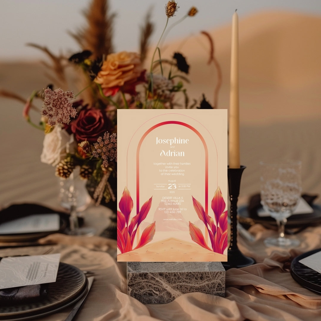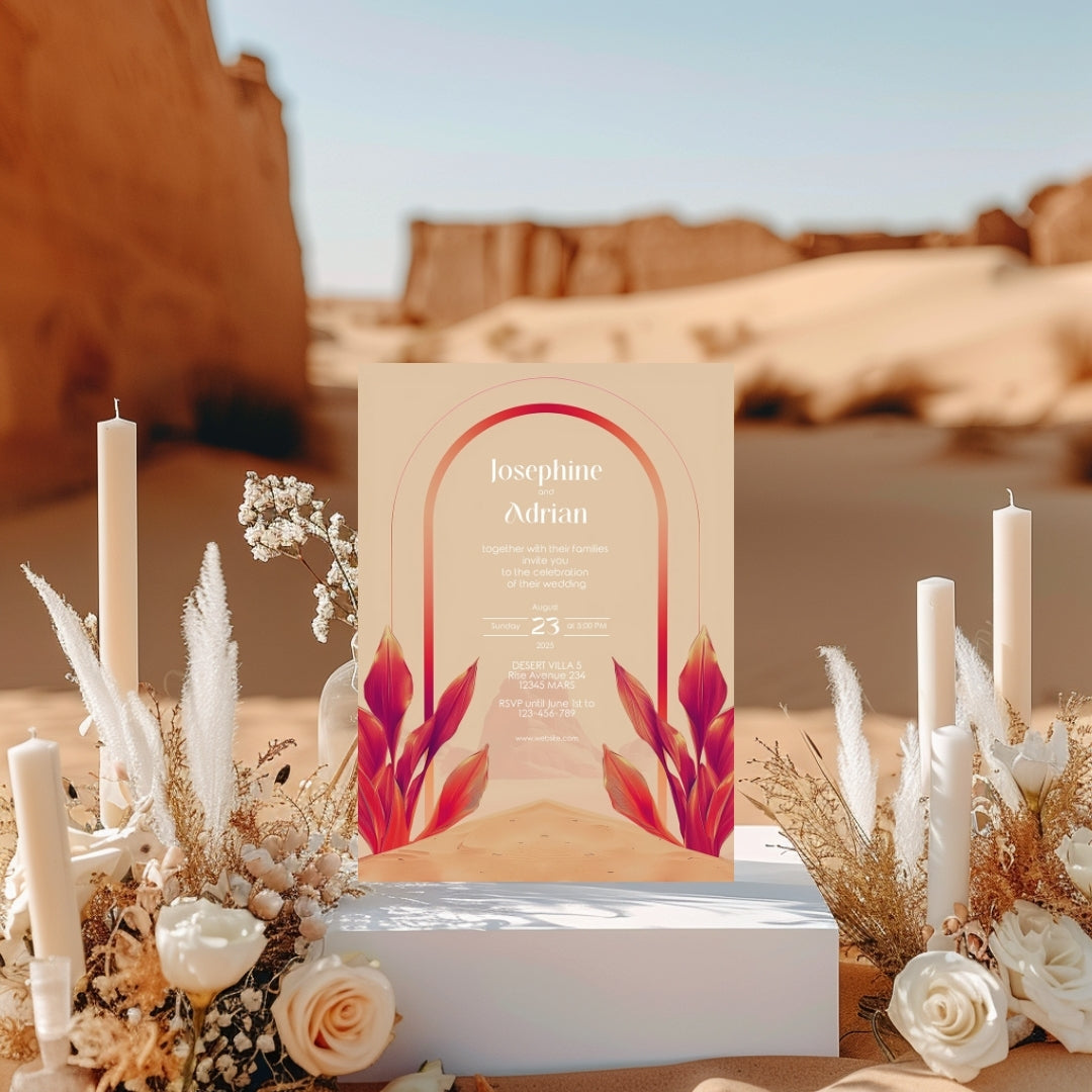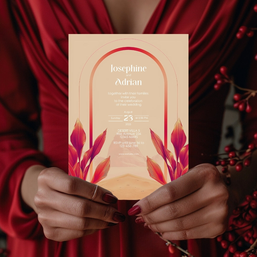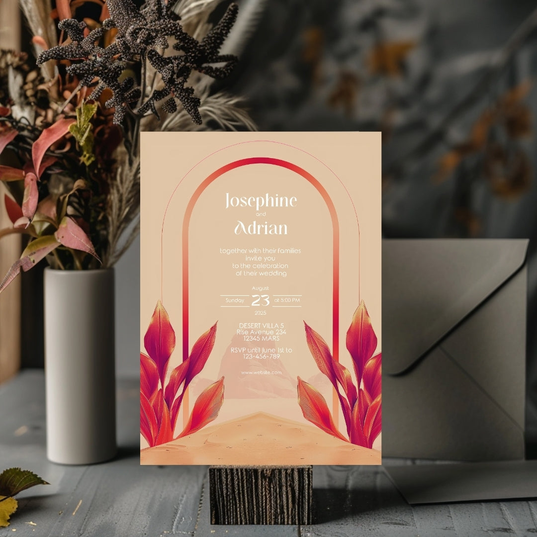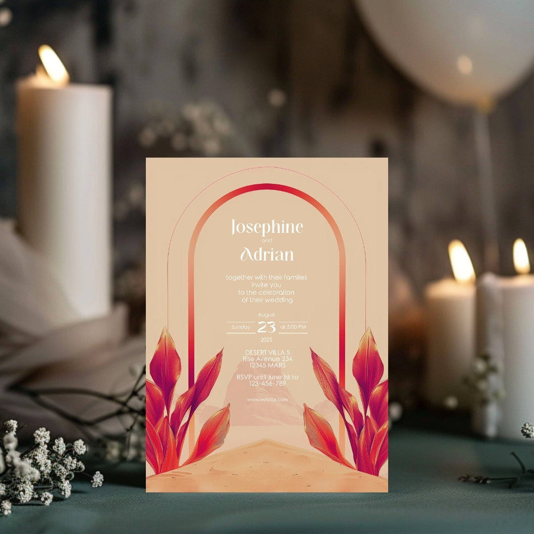 This Elegant Oriental Red Desert Wedding Invitation captures the serene beauty of a desert oasis, making it the perfect announcement for your special day. Designed with a romantic beige arch and rich red botanical elements, it resonates with warmth and sophistication, ideal for occasions like weddings, anniversaries, or enchanting desert-themed parties. The deep reds and lush florals against a soothing desert background set a tone of intimate elegance. Fully customizable through Corjl, this digital template offers you the flexibility to add a personal touch, whether you choose to print it for a traditional touch or send it electronically for modern convenience.