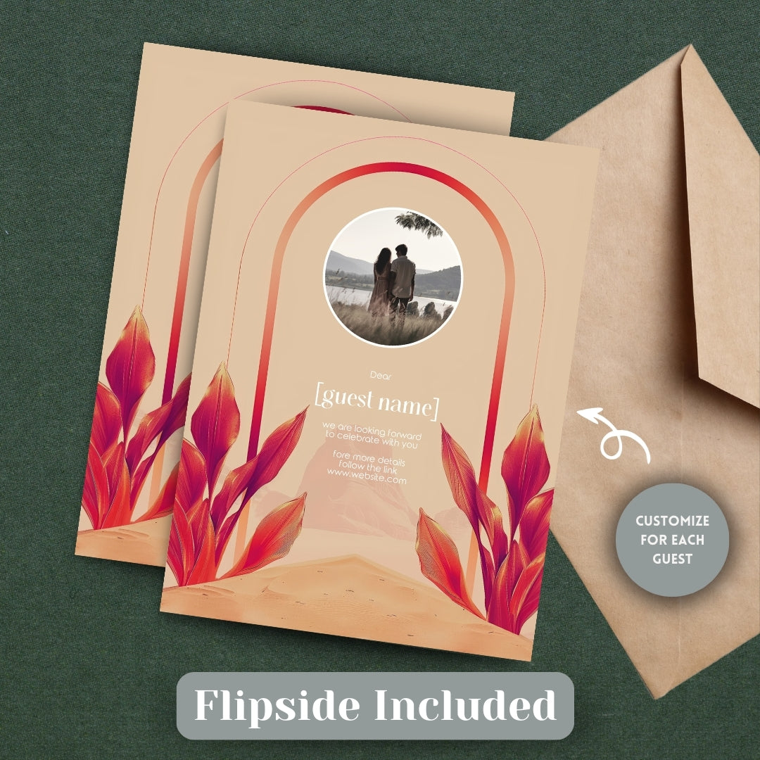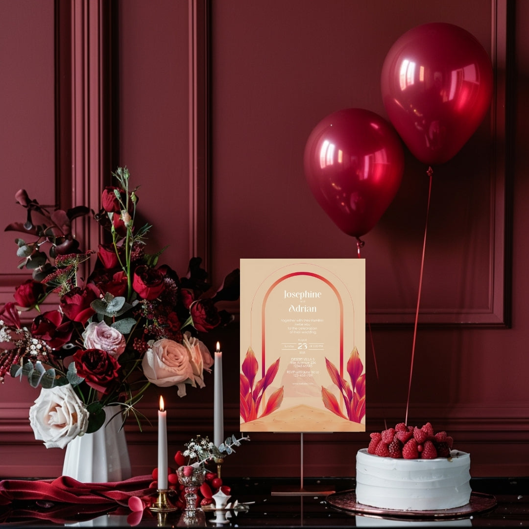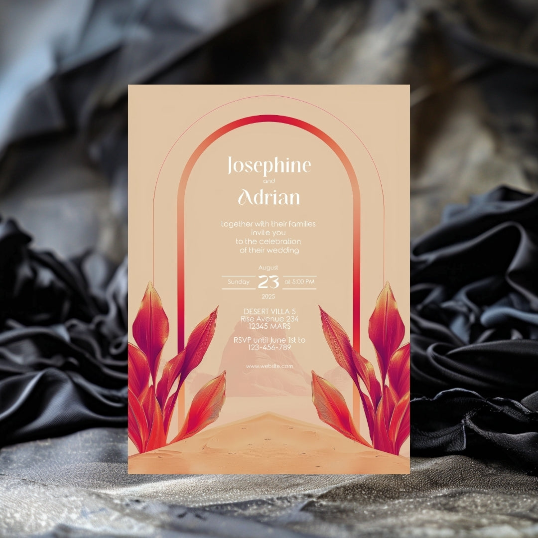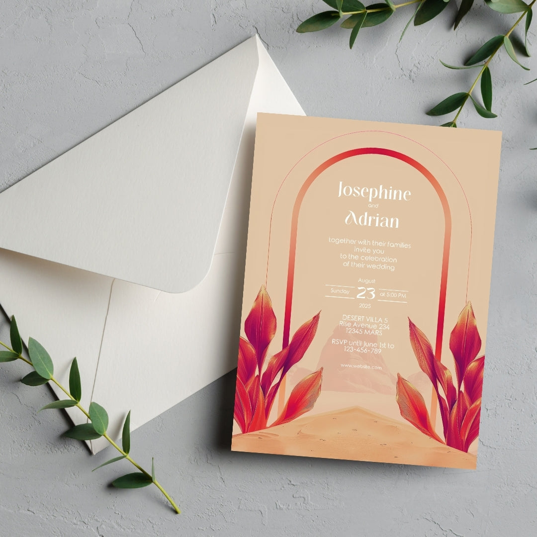 This Elegant Oriental Red Desert Wedding Invitation captures the serene beauty of a desert oasis, making it the perfect announcement for your special day. Designed with a romantic beige arch and rich red botanical elements, it resonates with warmth and sophistication, ideal for occasions like weddings, anniversaries, or enchanting desert-themed parties. The deep reds and lush florals against a soothing desert background set a tone of intimate elegance. Fully customizable through Corjl, this digital template offers you the flexibility to add a personal touch, whether you choose to print it for a traditional touch or send it electronically for modern convenience.
