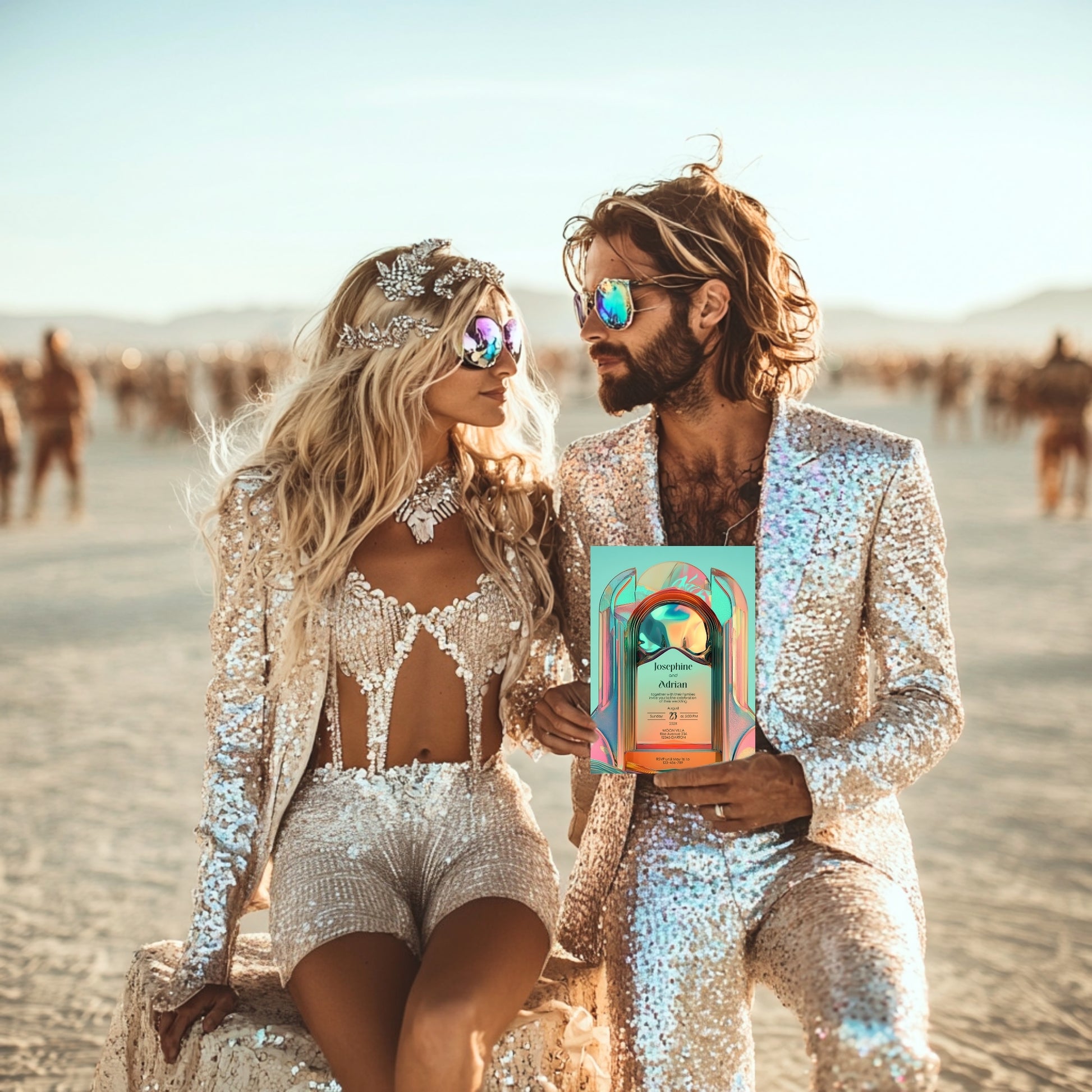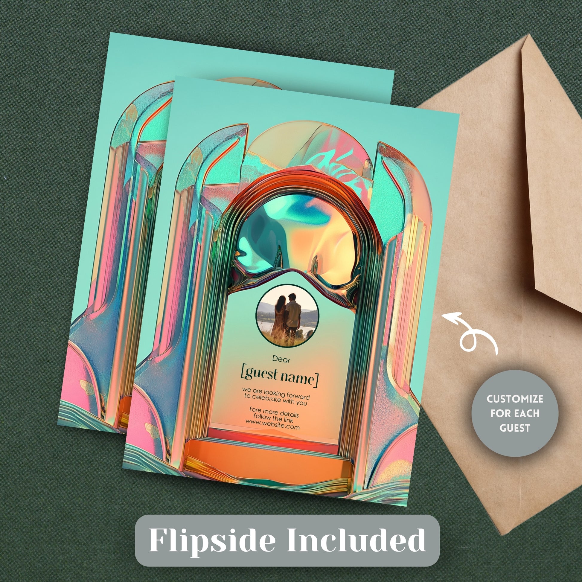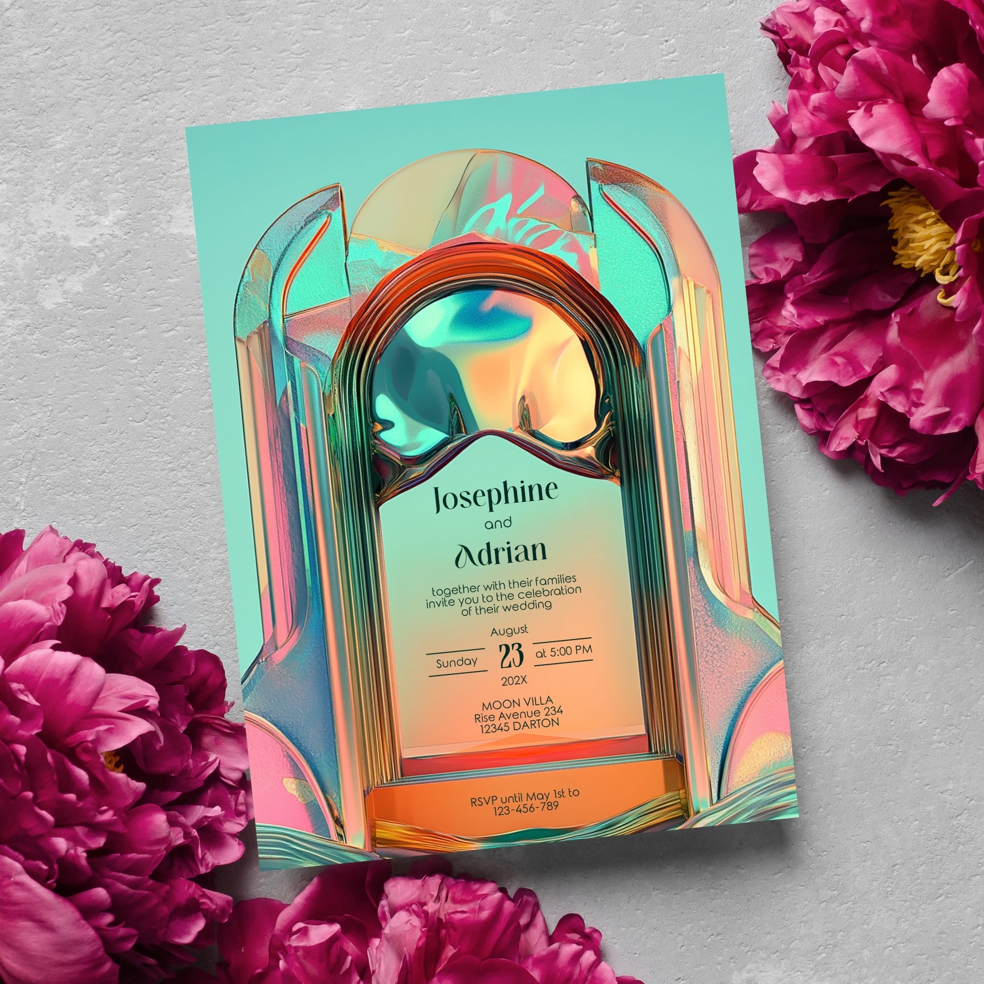 Transform your wedding into a bold celebration of art and love with this Festival-Inspired Iridescent Wedding Invitation. Featuring a stunning reflective arch with vibrant hues of teal, pink, gold, and orange, this design draws inspiration from futuristic art installations and transformative gatherings. Perfect for couples seeking a unique and artistic wedding vibe, this avant-garde template allows for full customization, ensuring your event is as unforgettable as your love.