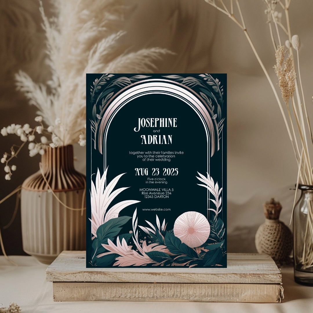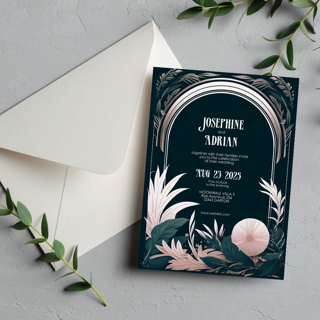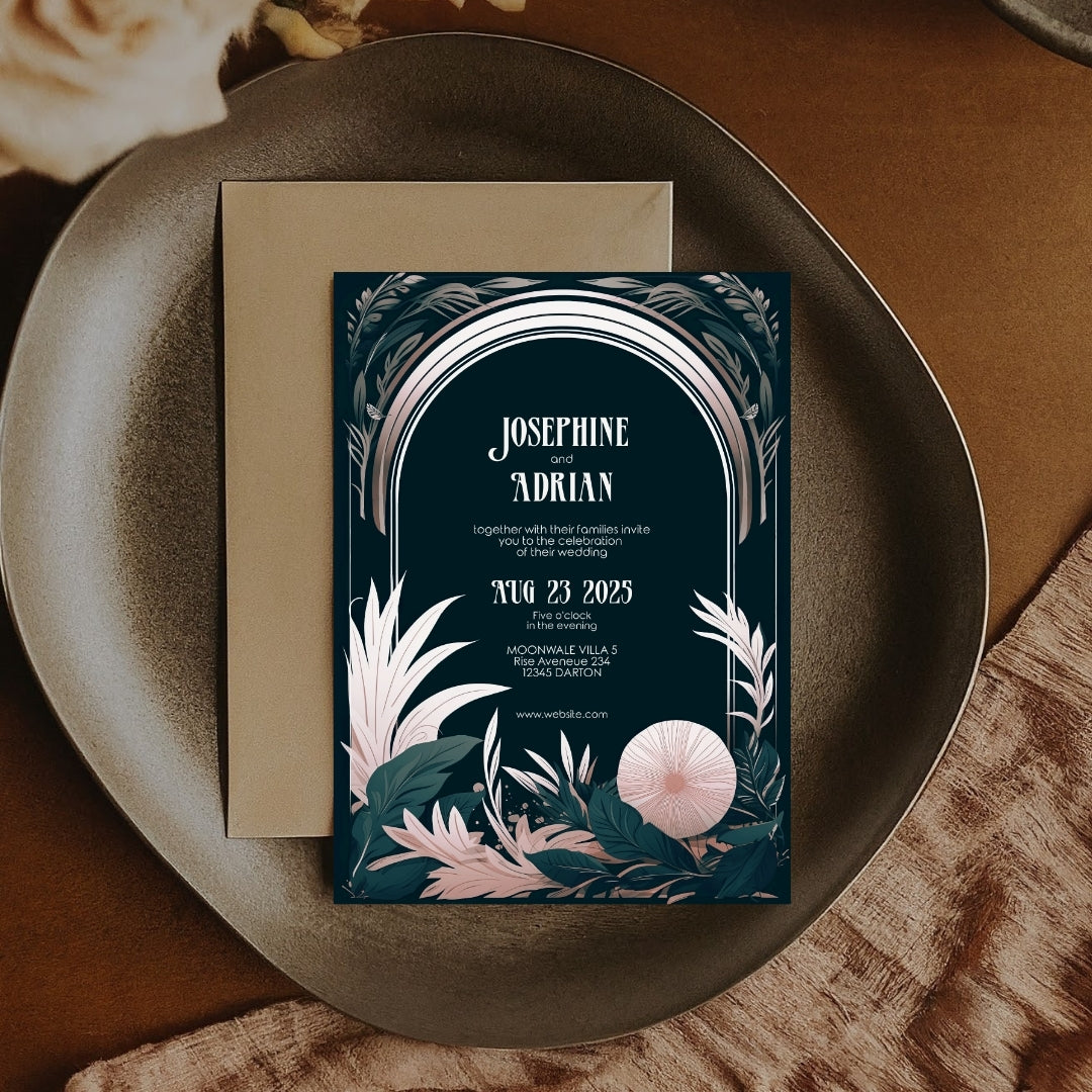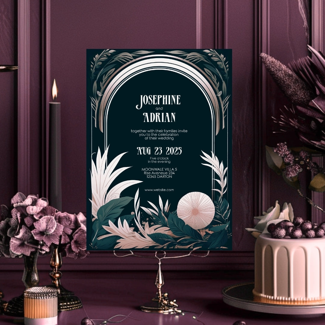 Let the stars and moon align on your special day with this Celestial Art Nouveau - Art Deco blend invitation. The ethereal design elements, combined with an elegant and mystical color palette, set the stage for a heavenly matrimony. This digital invitation template, perfect for a wedding, anniversary, or a celestial-themed event, is easily personalized with Corjl, allowing you to add a touch of the cosmos to your special occasion.