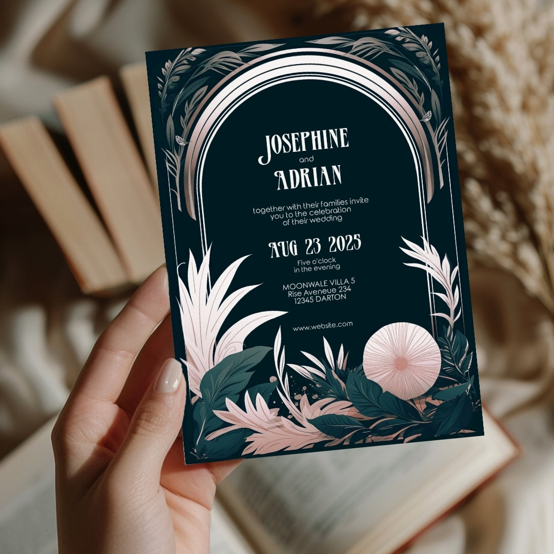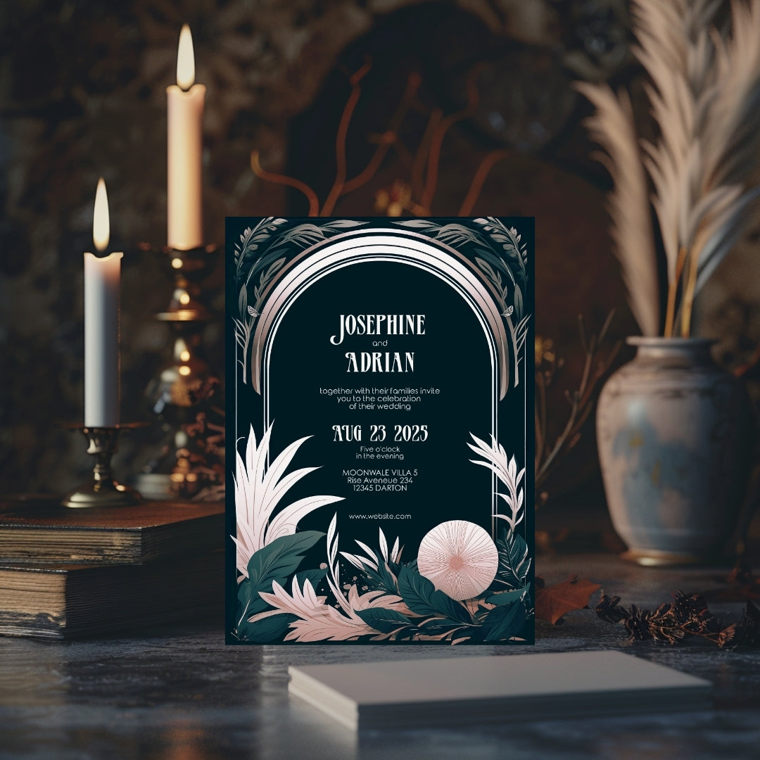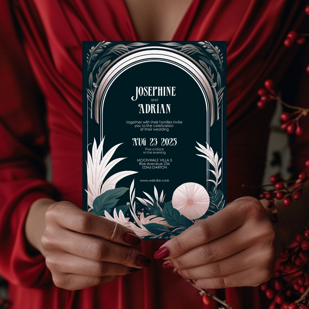 Let the stars and moon align on your special day with this Celestial Art Nouveau - Art Deco blend invitation. The ethereal design elements, combined with an elegant and mystical color palette, set the stage for a heavenly matrimony. This digital invitation template, perfect for a wedding, anniversary, or a celestial-themed event, is easily personalized with Corjl, allowing you to add a touch of the cosmos to your special occasion.
