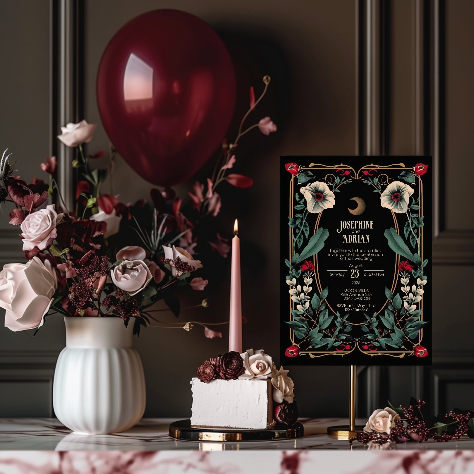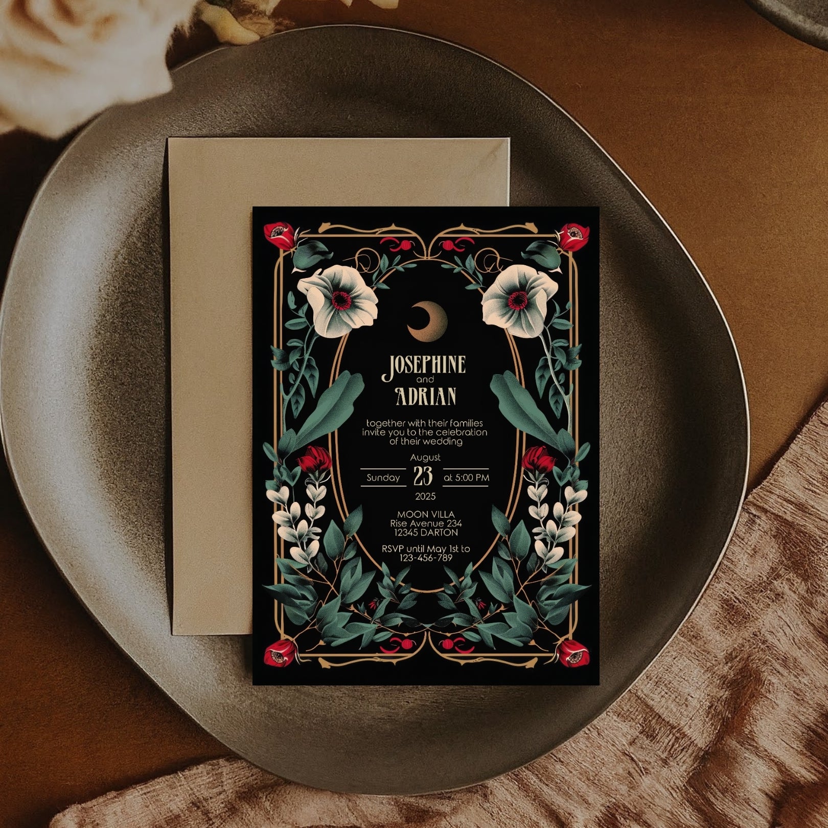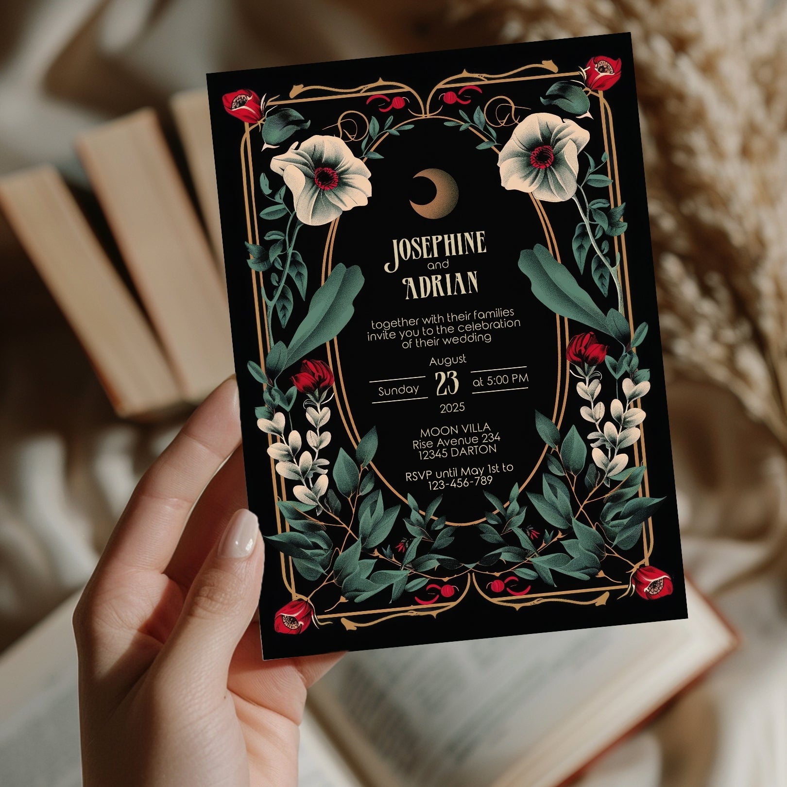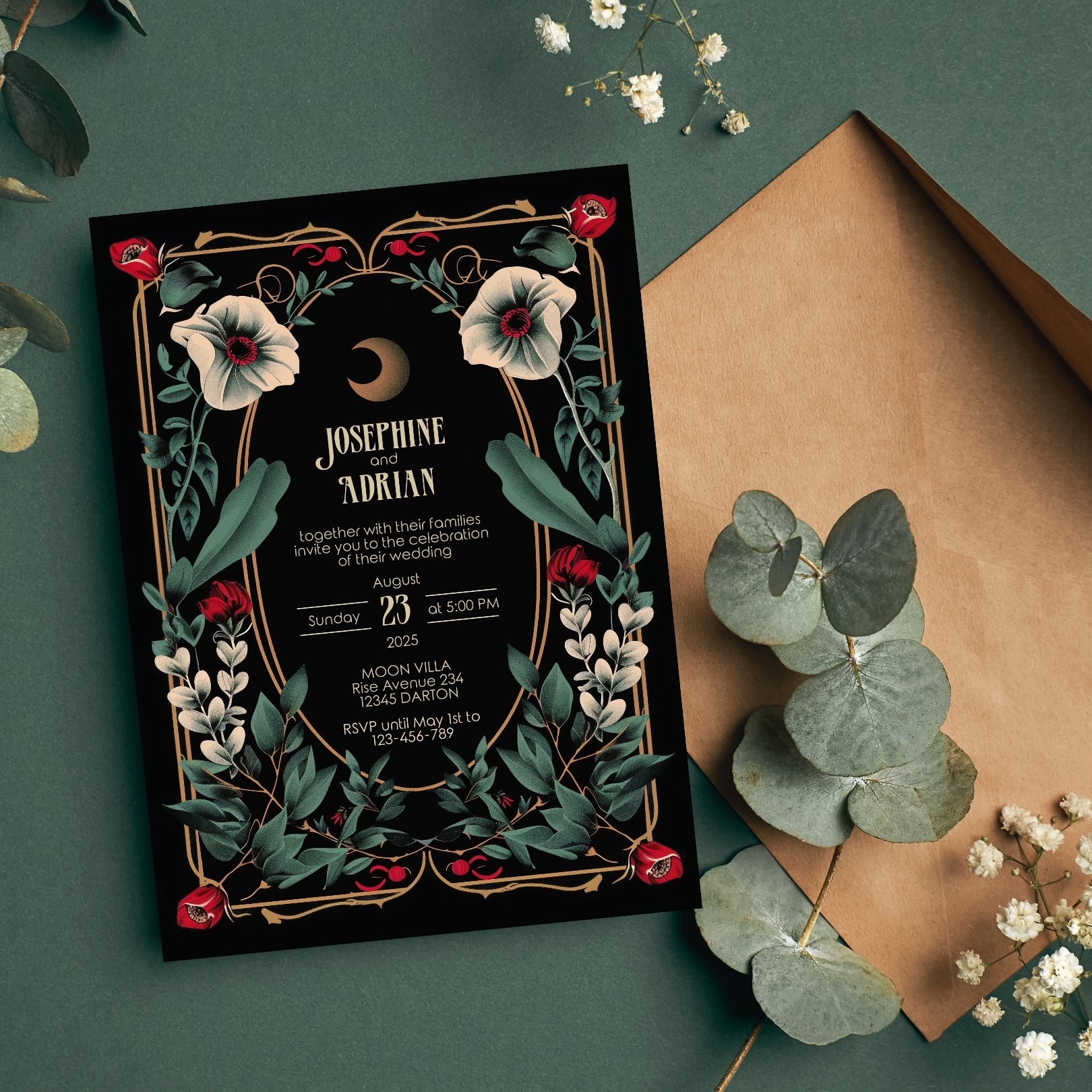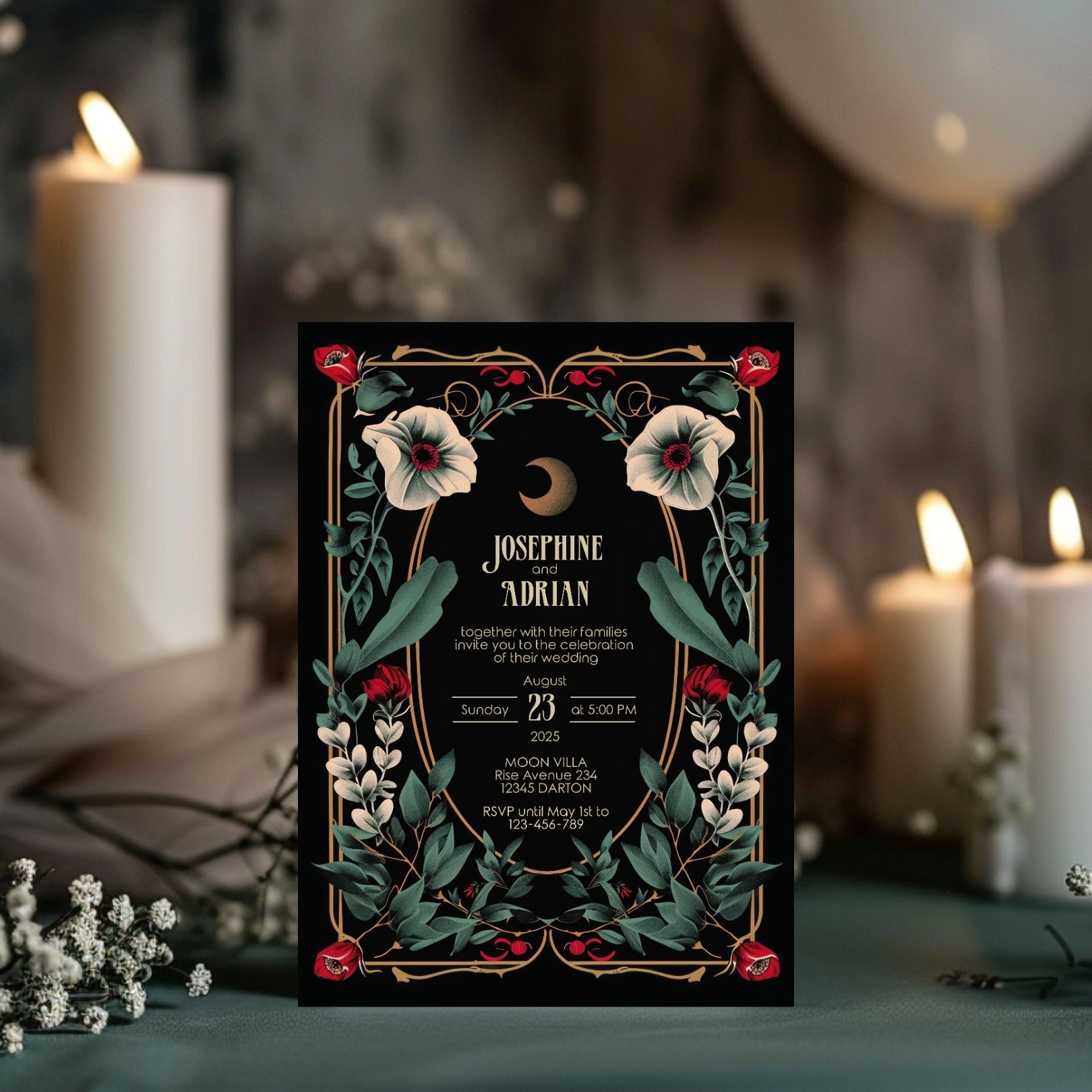🌟 Enchant Your Event with our Gothic Floral Art Deco Invitation! Perfect for weddings, birthdays, anniversaries, or any special event, this unique digital template features dramatic black and gold elements, accented with deep red and white flowers. 🌟