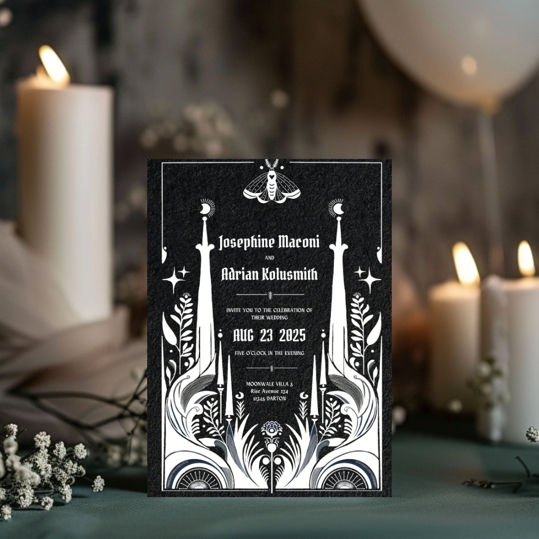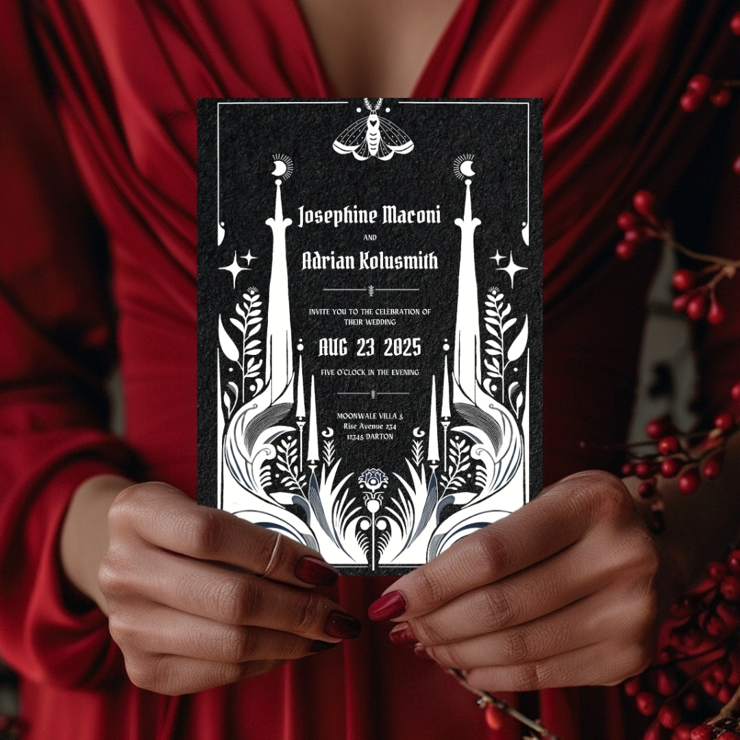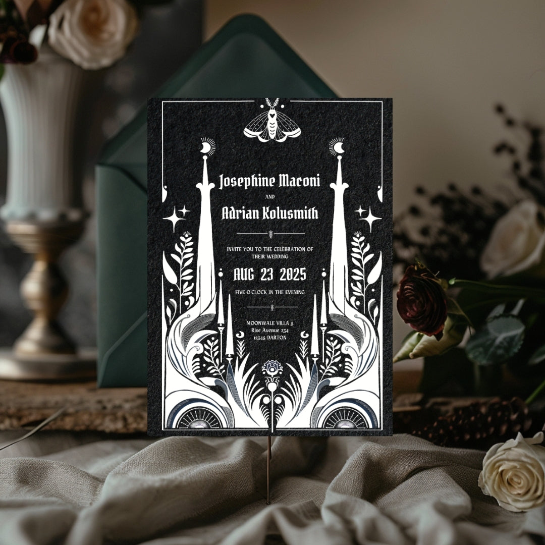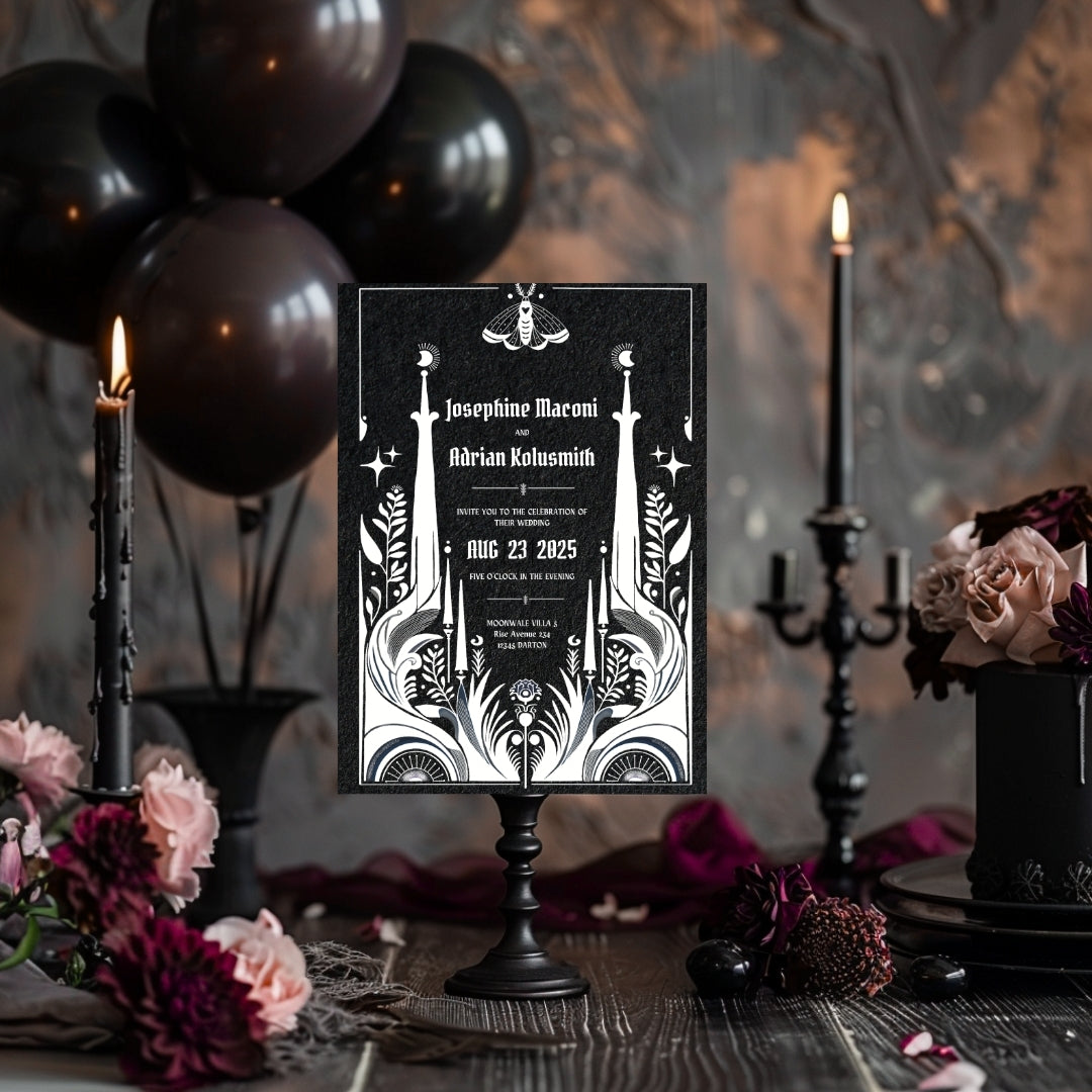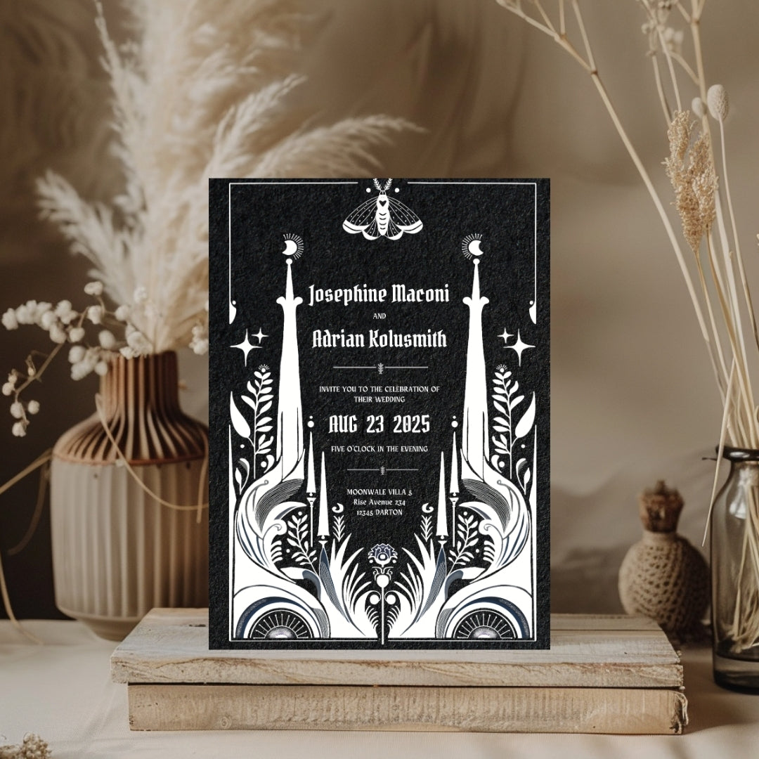 Welcome to a world where your love story comes to life in the most enchanting way possible. Our custom wedding invitation template is the perfect blend of gothic mystique, modern elegance, and art deco flair, designed to set the tone for your special day with a touch of magic.