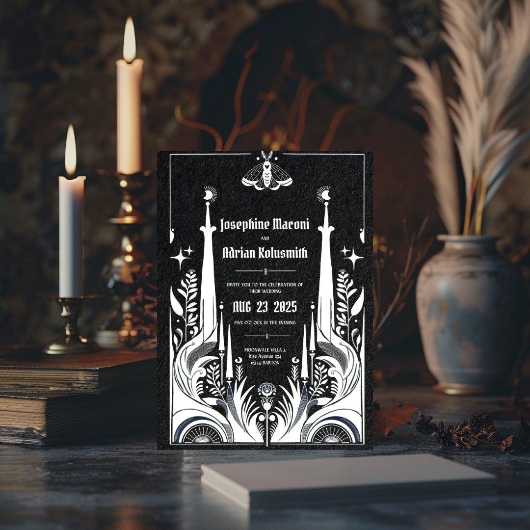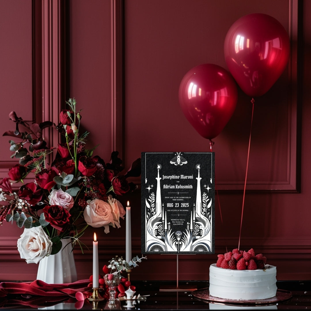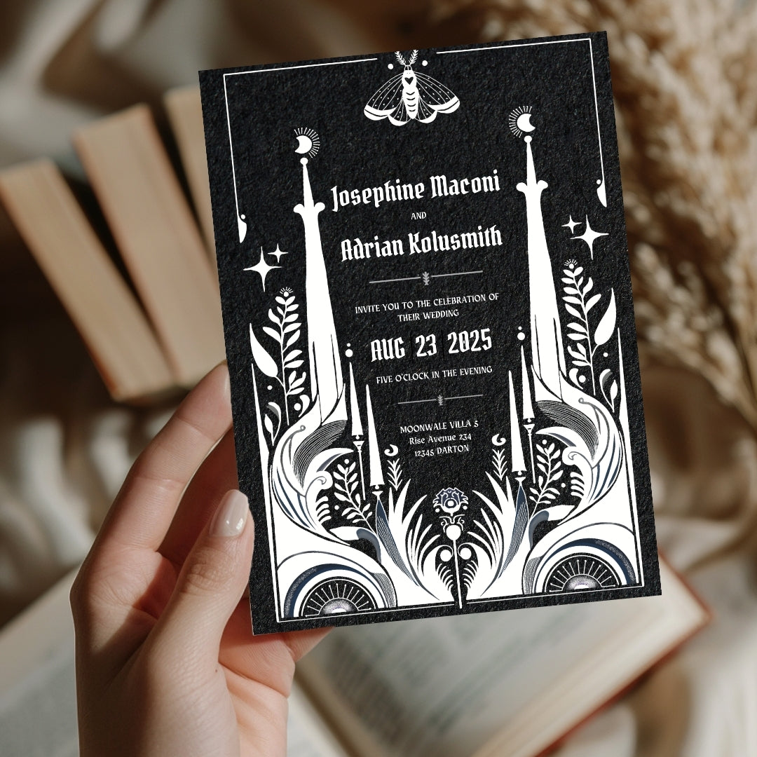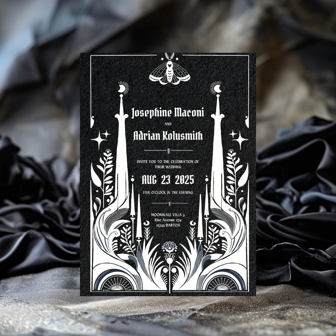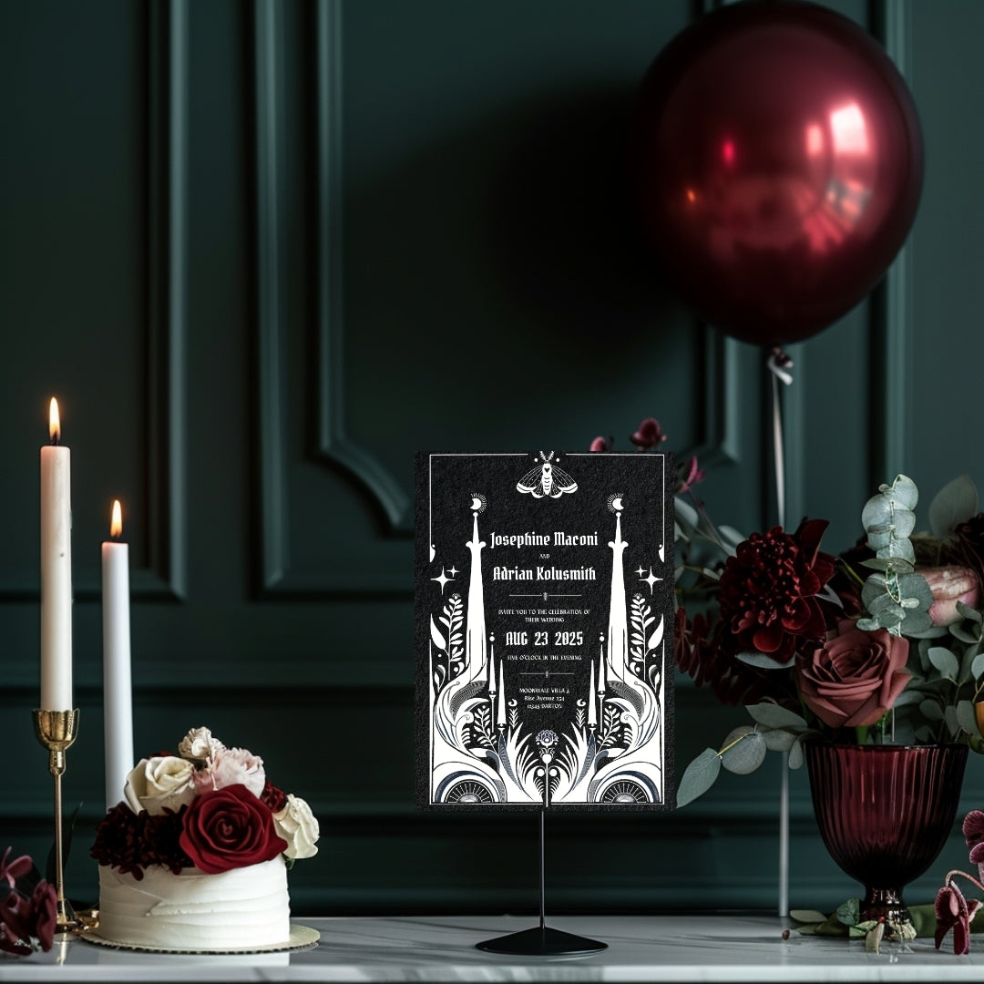 Welcome to a world where your love story comes to life in the most enchanting way possible. Our custom wedding invitation template is the perfect blend of gothic mystique, modern elegance, and art deco flair, designed to set the tone for your special day with a touch of magic.