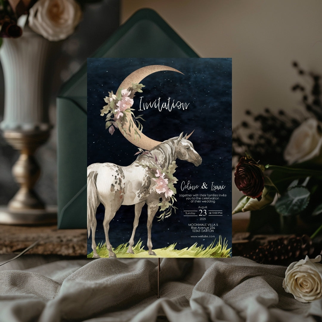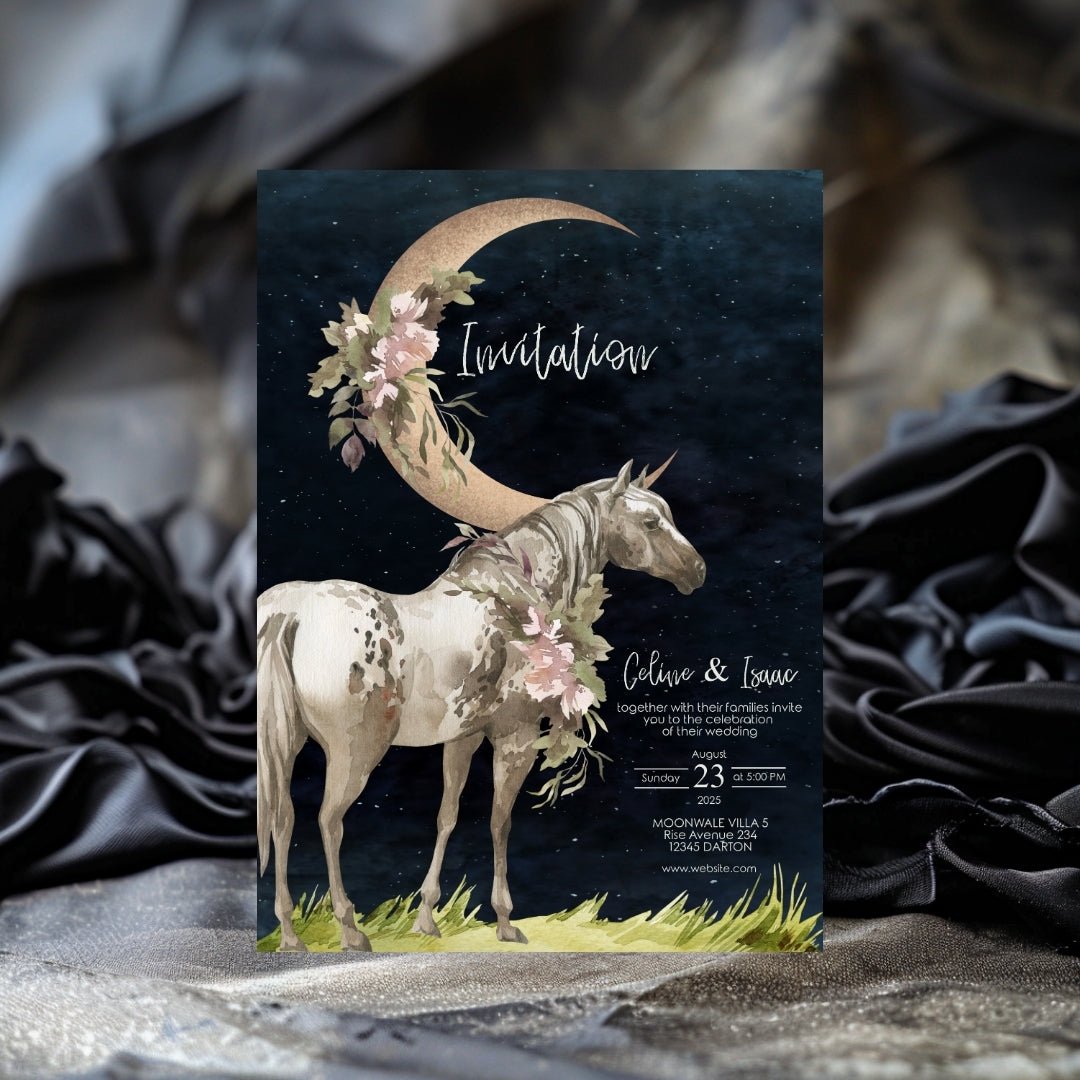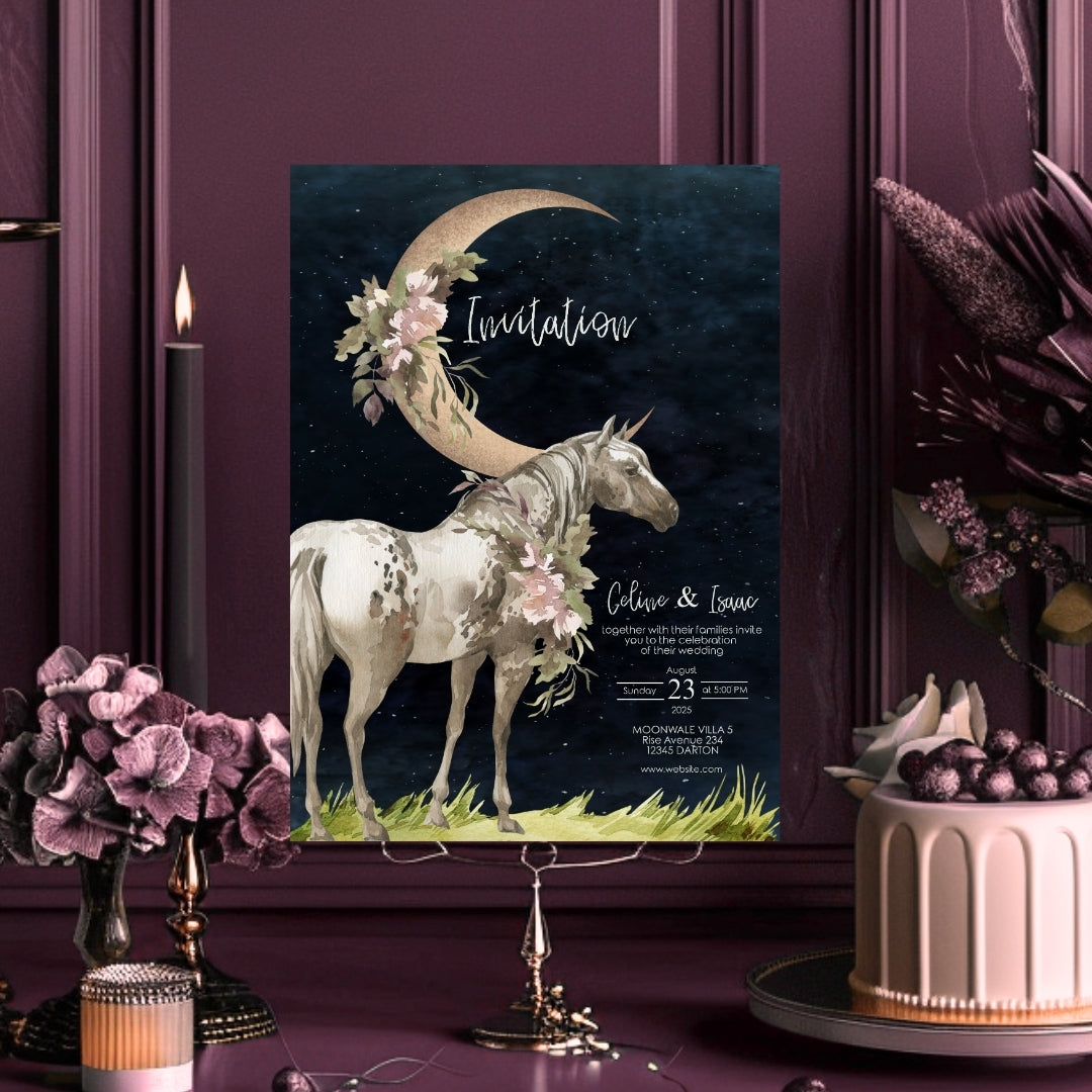 Unveil the magic of your momentous day with our Enchanted Celestial Horse Romance Invitation. This digital template transcends the ordinary, inviting your guests into a mystical world where love intertwines with the cosmic elegance of a moonlit sky. Adorned with the mythical beauty of a unicorn and delicate florals, it's perfect for a wedding, anniversary, or any enchanting celebration. Personalize this celestial story through Corjl, offering a seamless way to edit, download, and print or share digitally.