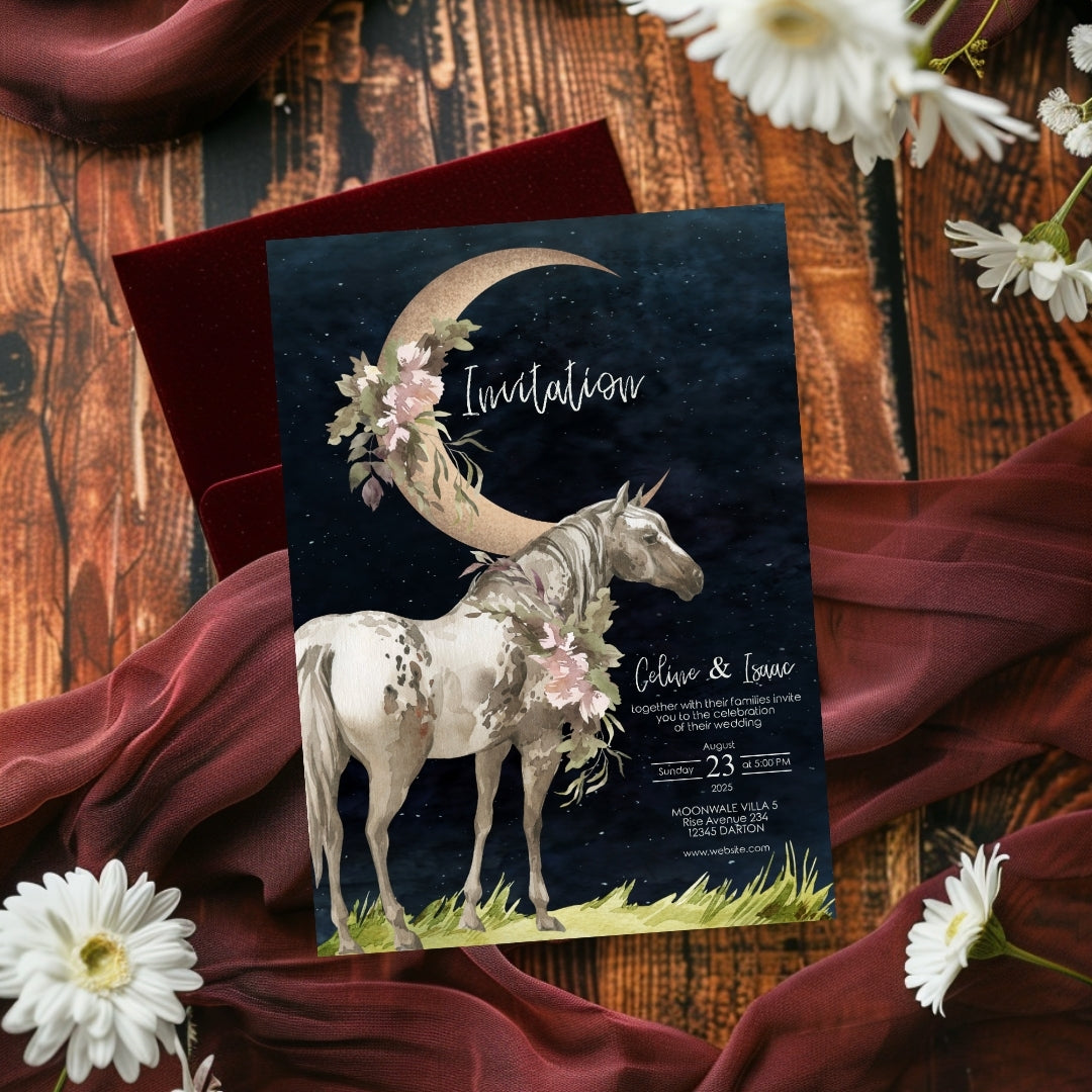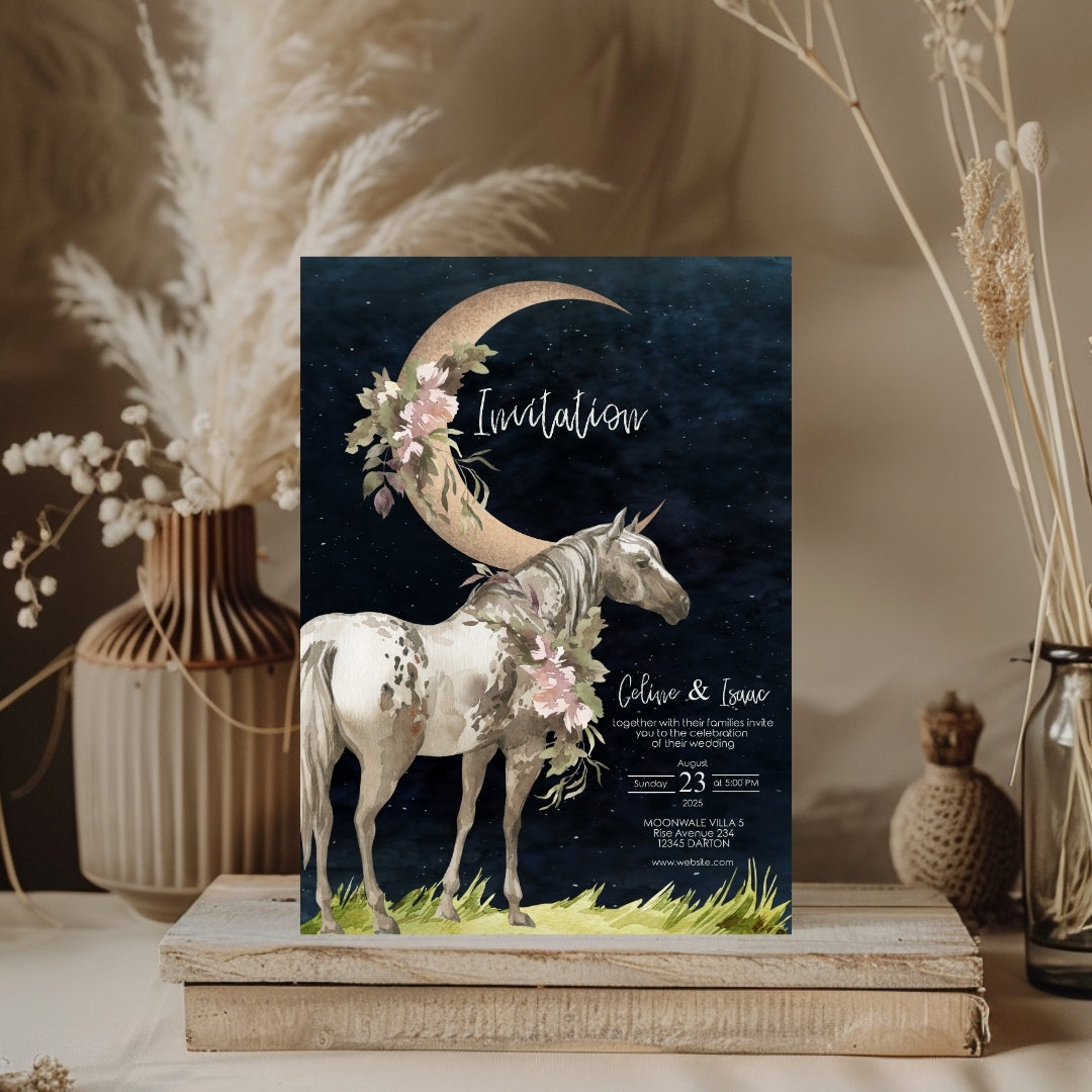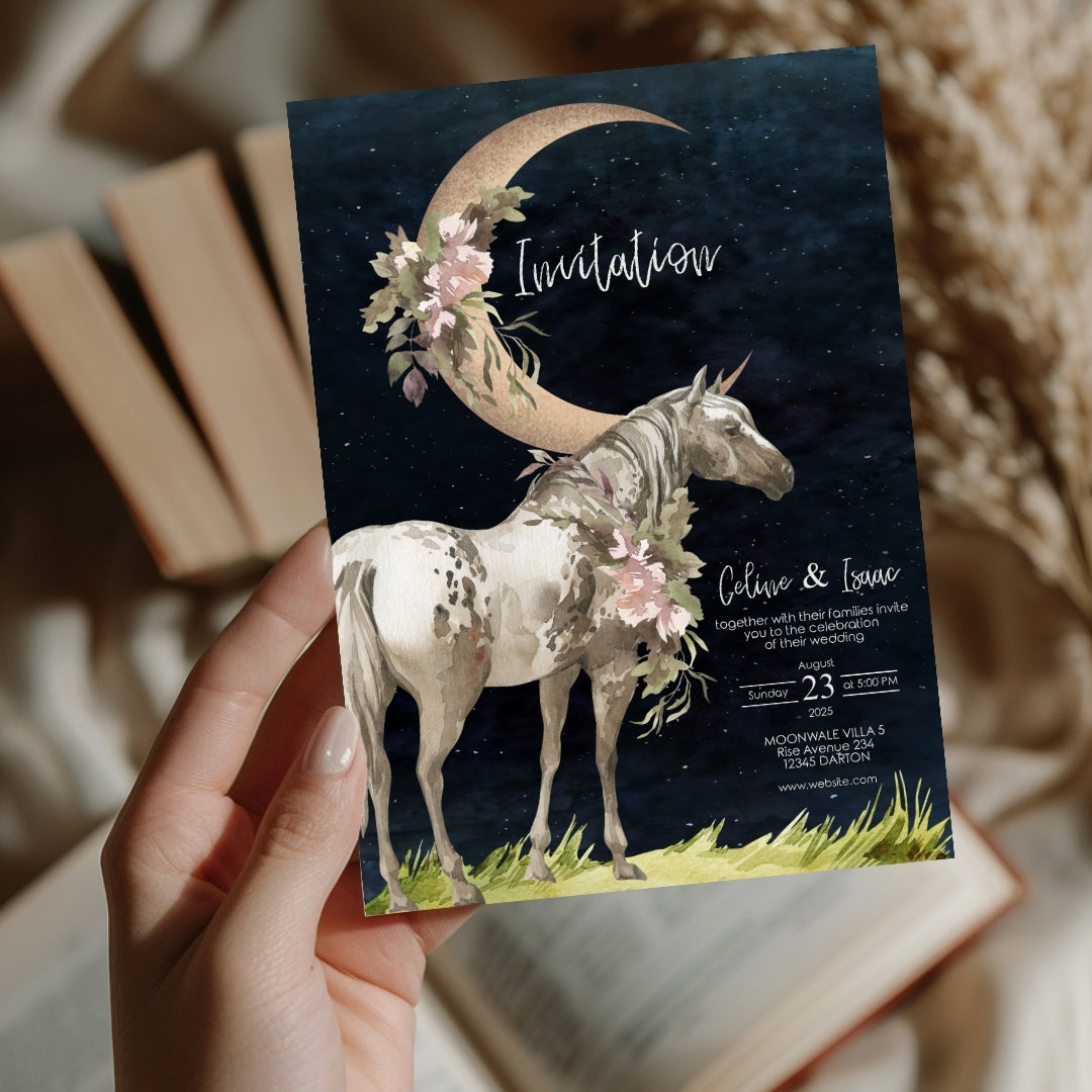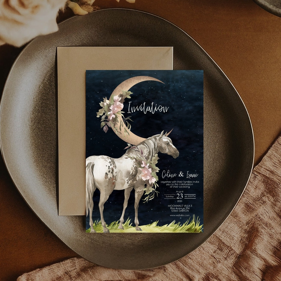 Unveil the magic of your momentous day with our Enchanted Celestial Horse Romance Invitation. This digital template transcends the ordinary, inviting your guests into a mystical world where love intertwines with the cosmic elegance of a moonlit sky. Adorned with the mythical beauty of a unicorn and delicate florals, it's perfect for a wedding, anniversary, or any enchanting celebration. Personalize this celestial story through Corjl, offering a seamless way to edit, download, and print or share digitally.