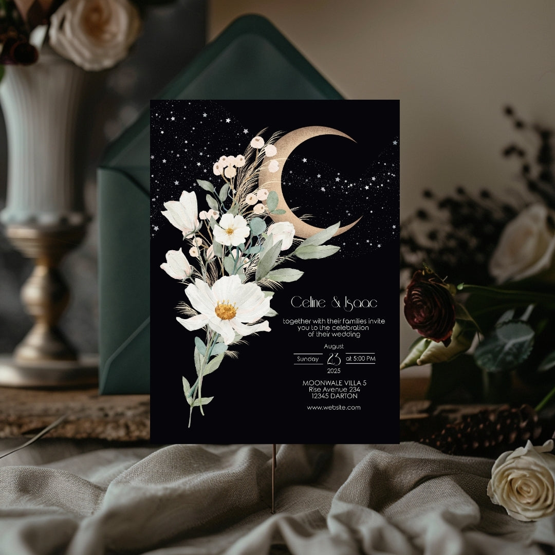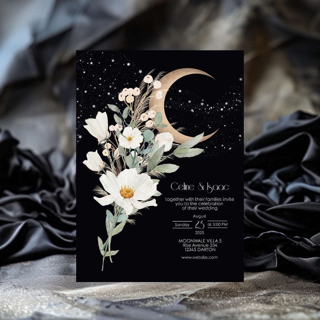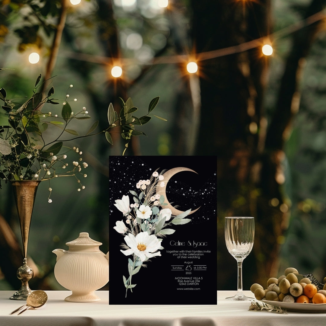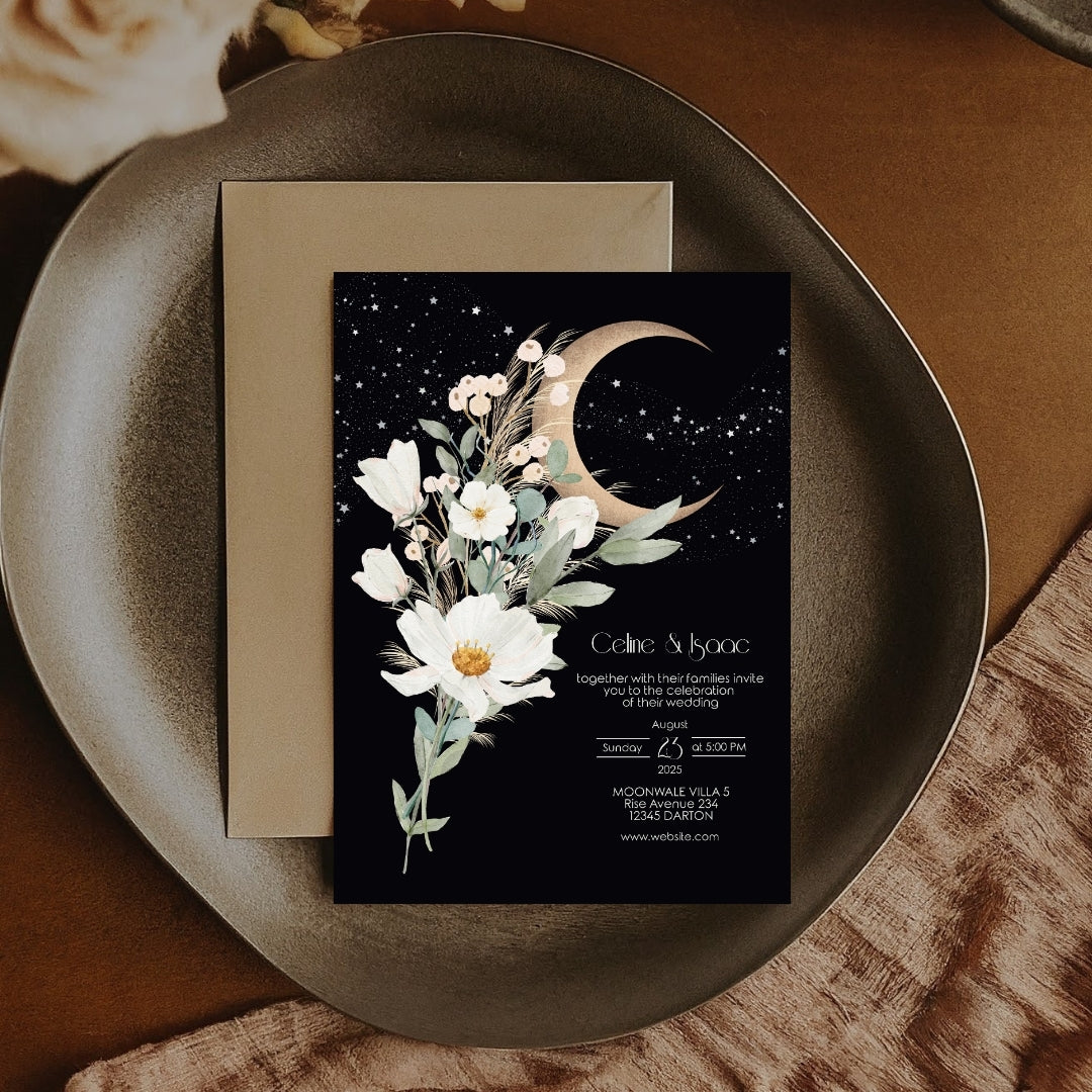 Step into a midnight realm of elegance with this Celestial Floral Minimalist Wedding Invitation. Designed for those who find beauty in the night sky, this template captures the romance of starlit evenings and the serene beauty of nature. Ideal for weddings, anniversaries, birthdays, or any event that calls for a touch of celestial charm, it's the perfect announcement for your special occasion. Featuring a moonlit backdrop adorned with a sophisticated floral arrangement, your guests will be captivated by the enchantment of your event before it even begins. Easily customizable through Corjl, you can personalize this invitation to match your unique story.