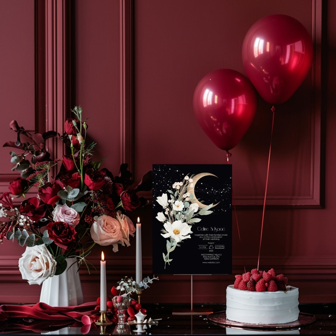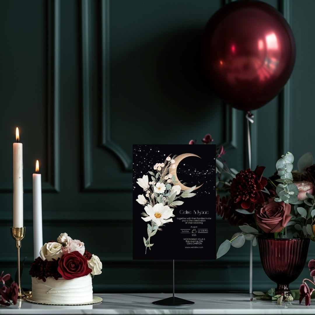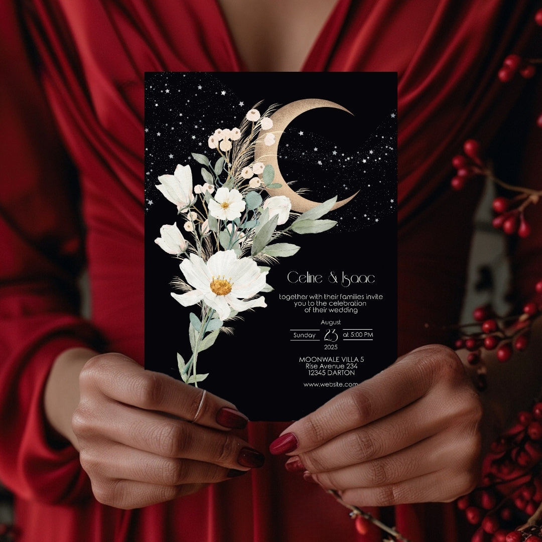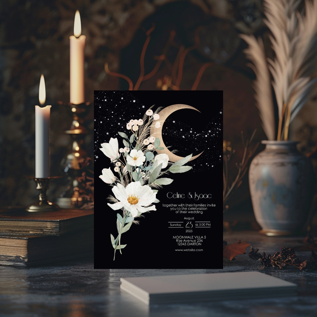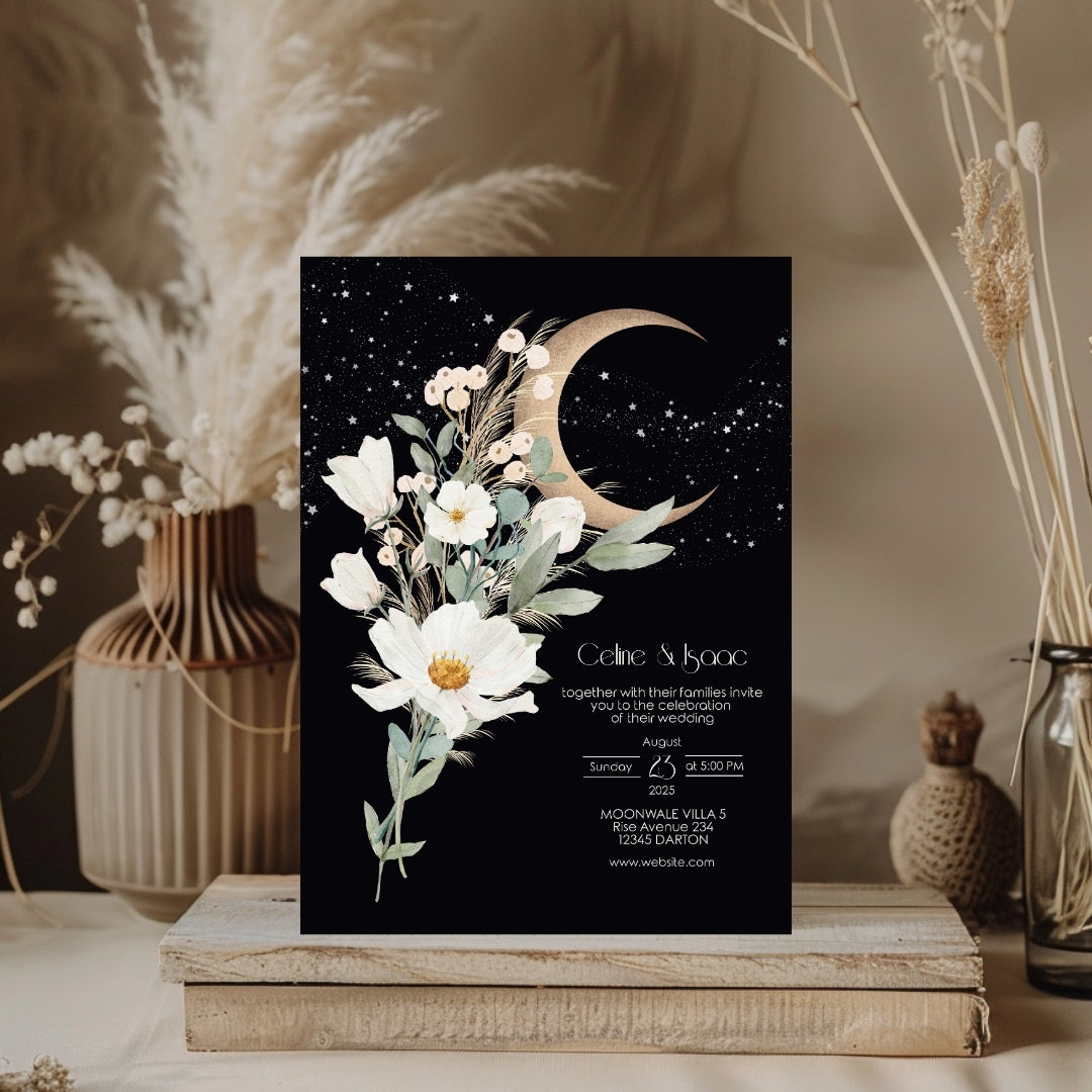 Step into a midnight realm of elegance with this Celestial Floral Minimalist Wedding Invitation. Designed for those who find beauty in the night sky, this template captures the romance of starlit evenings and the serene beauty of nature. Ideal for weddings, anniversaries, birthdays, or any event that calls for a touch of celestial charm, it's the perfect announcement for your special occasion. Featuring a moonlit backdrop adorned with a sophisticated floral arrangement, your guests will be captivated by the enchantment of your event before it even begins. Easily customizable through Corjl, you can personalize this invitation to match your unique story.