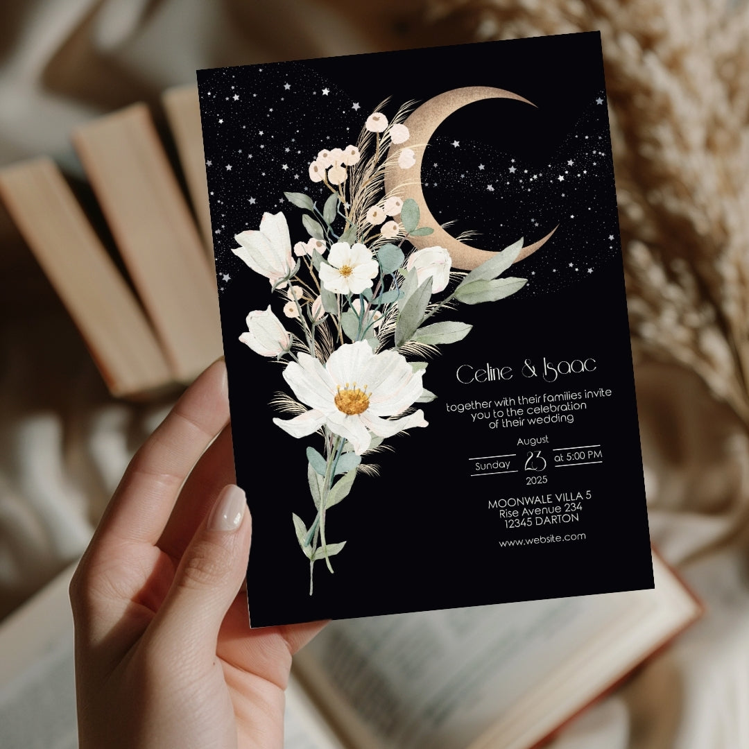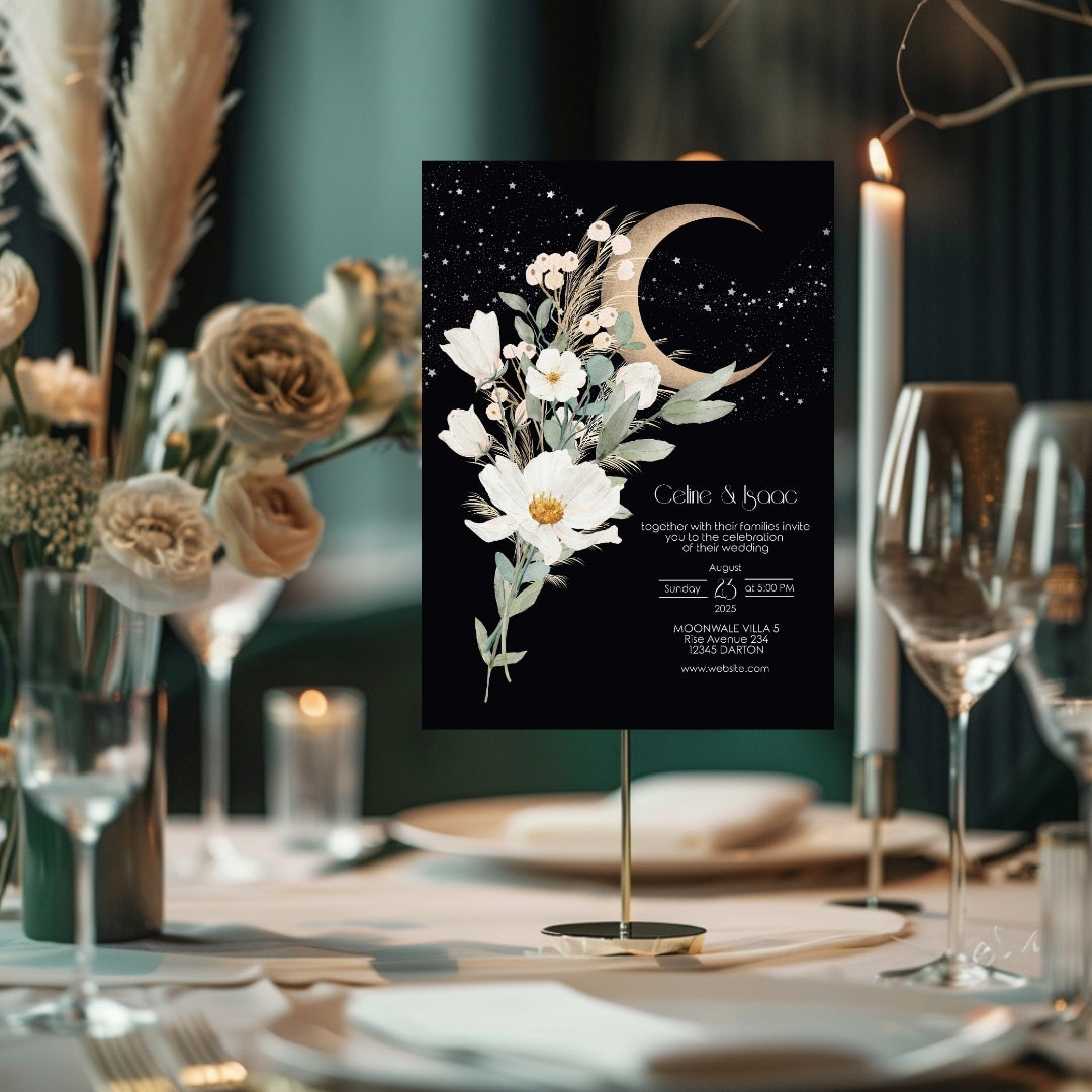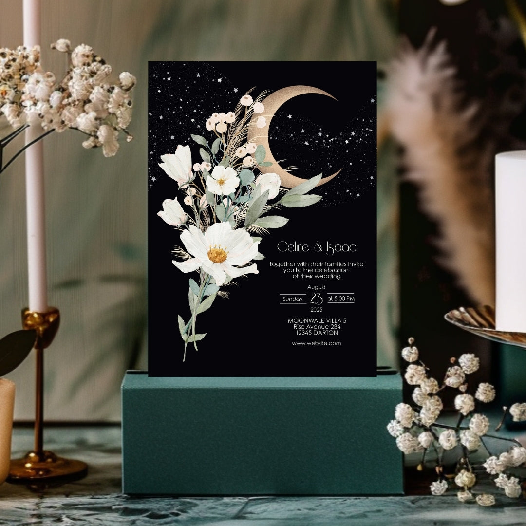 Celestial Moon White Floral Minimalist Wedding Invitation