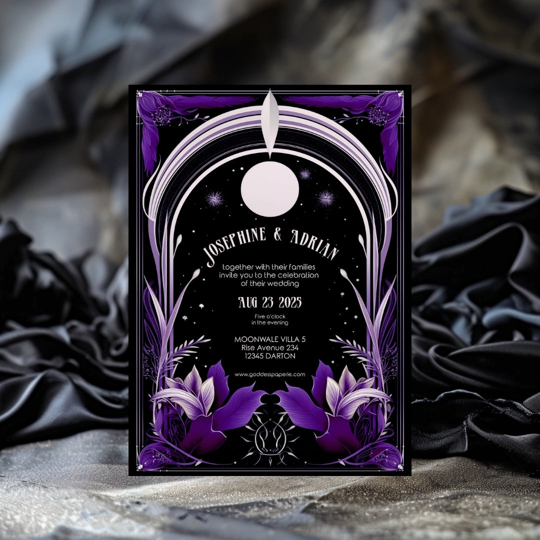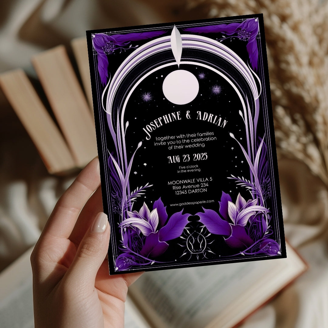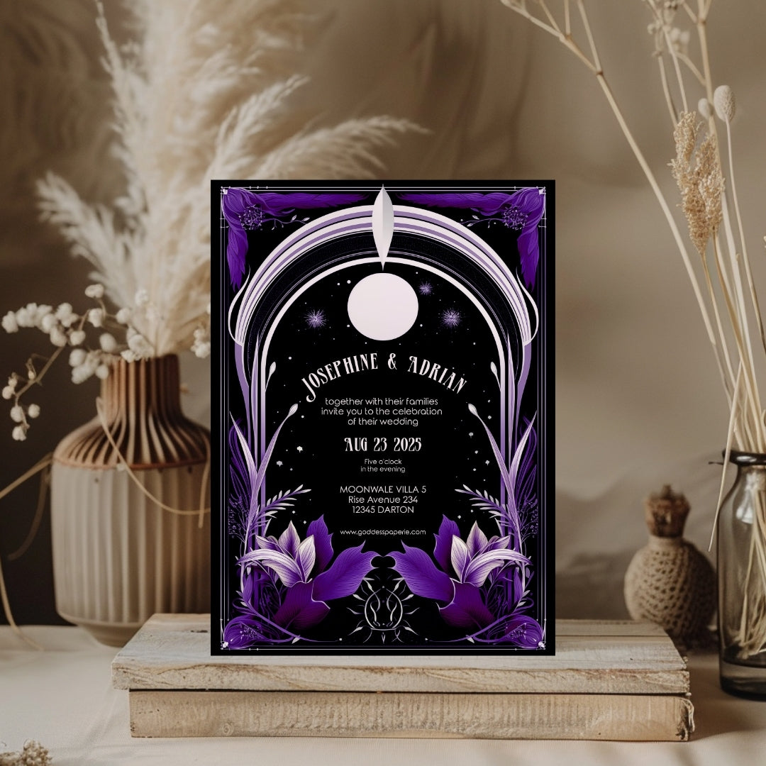 Discover the magic of your next big event with our Celestial Elegance Invitation Template. It's not just an invitation; it's a gateway to an unforgettable experience, whether you're celebrating your wedding, a bridal shower or other magical partys. This enchanting design, with its whisper of midnight, powerful purple and winks of stardust, sets the scene for romance, joy, and a touch of mystery.