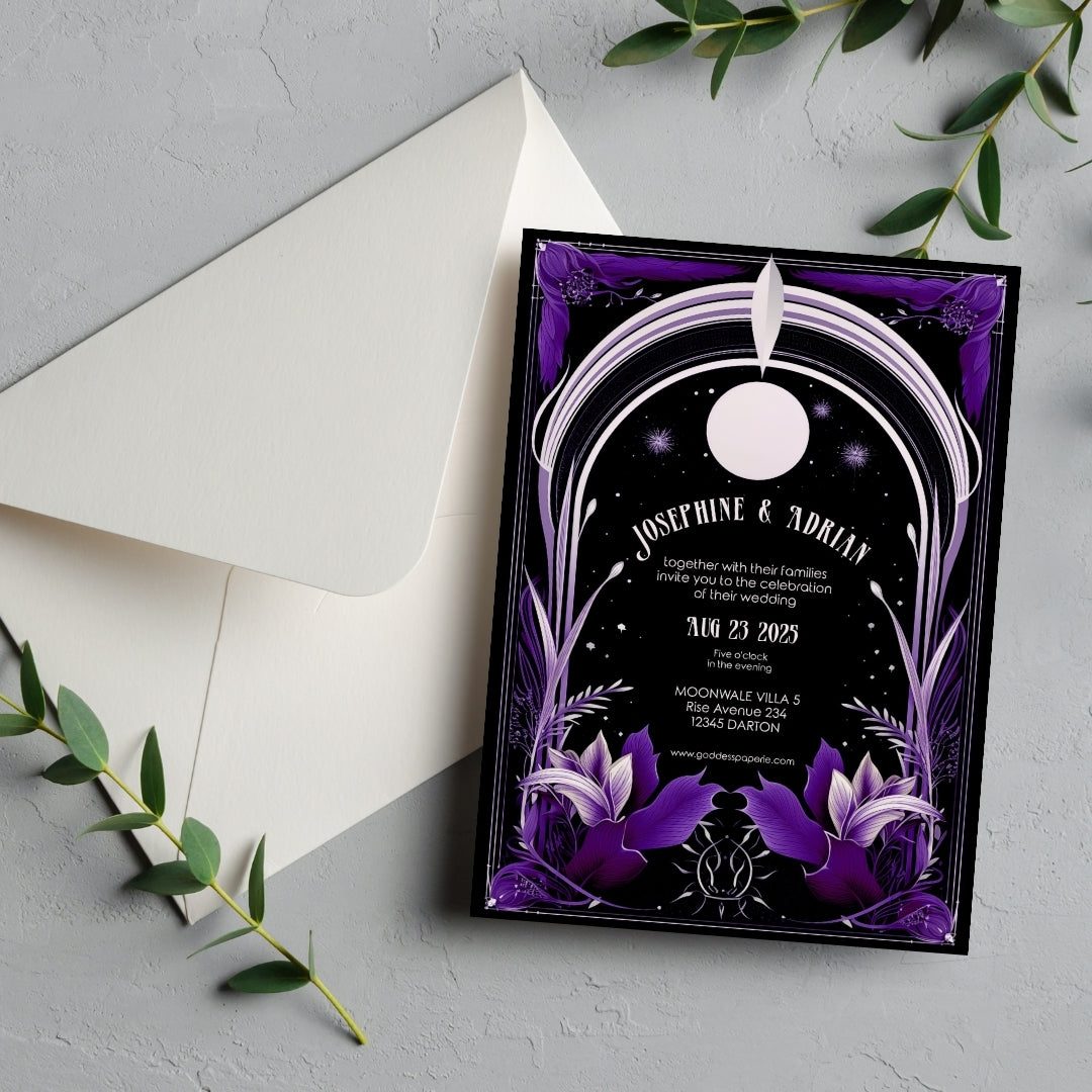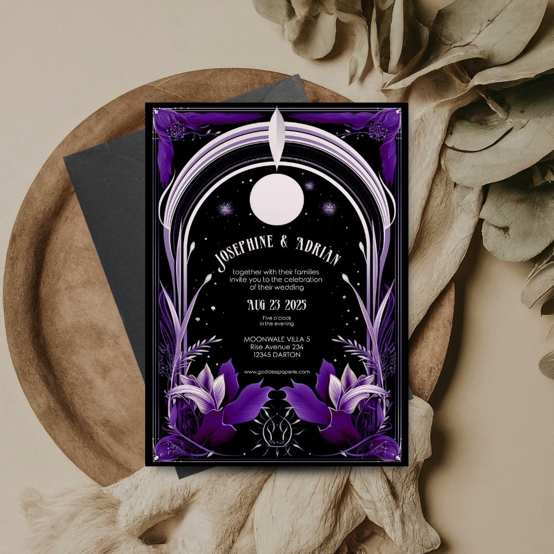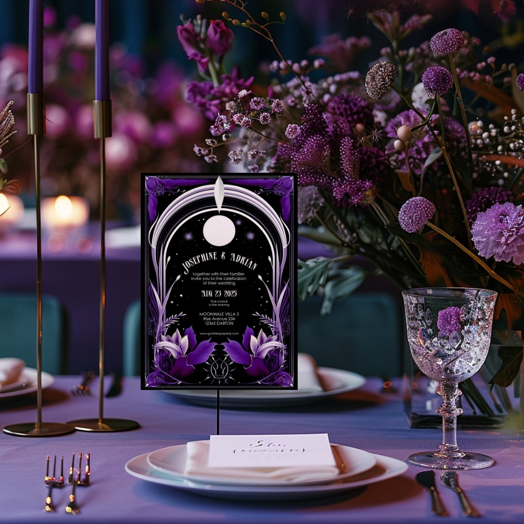 Discover the magic of your next big event with our Celestial Elegance Invitation Template. It's not just an invitation; it's a gateway to an unforgettable experience, whether you're celebrating your wedding, a bridal shower or other magical partys. This enchanting design, with its whisper of midnight, powerful purple and winks of stardust, sets the scene for romance, joy, and a touch of mystery.