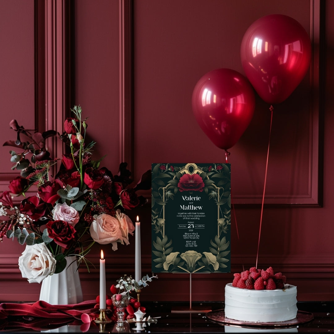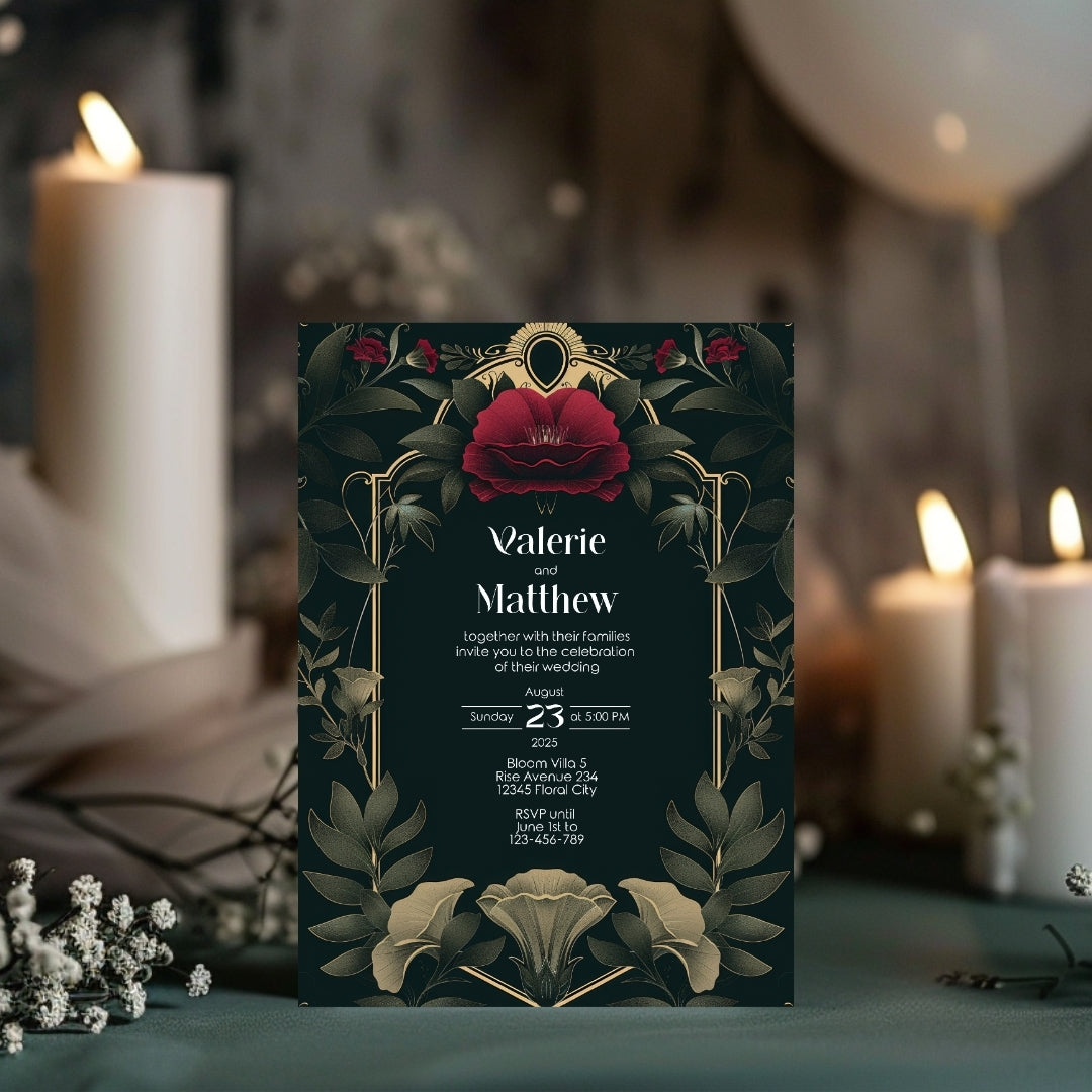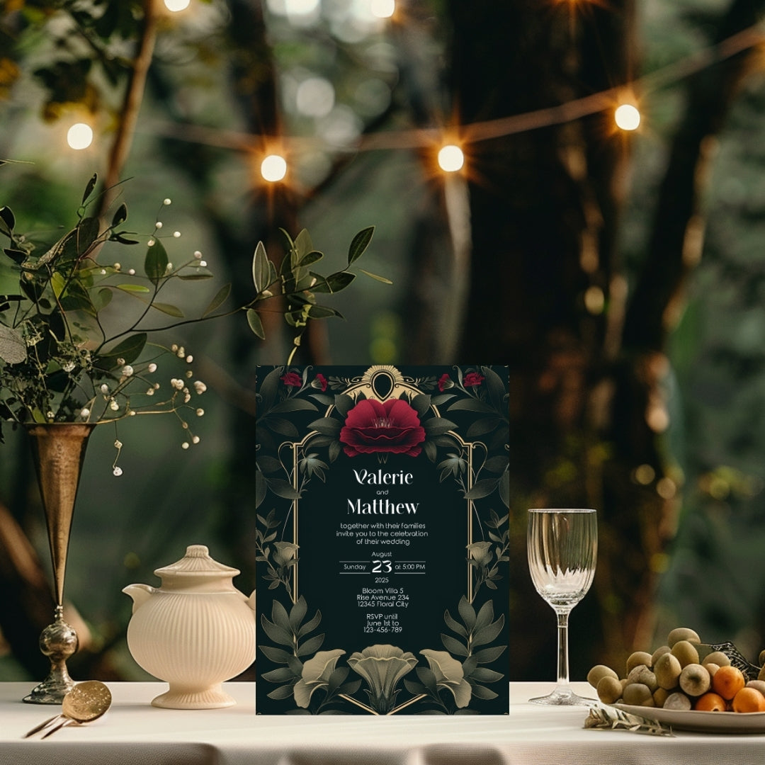 Invite your loved ones to witness the union of elegance and romance with our Art Deco Romance Wedding Invitation. This customizable digital template blends the iconic charm of the Art Deco era with the tender beauty of botanical accents, all set against a dramatic, dark background that makes the bold reds and soft golds truly pop. The central floral motif is a statement of love in full bloom, perfect for an elegant wedding, a heartfelt anniversary, or any celebration that calls for a touch of vintage sophistication. Personalize this template with ease on Corjl, crafting an invitation that's unique to your special day, and choose to share it as a high-quality print or a sophisticated digital invite. Begin your event with a promise of beauty and timeless charm, setting the stage for memories that will last a lifetime.