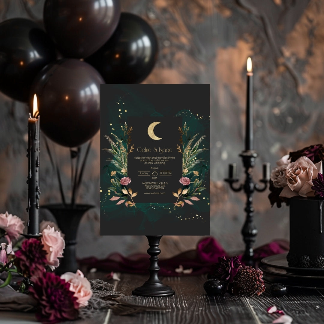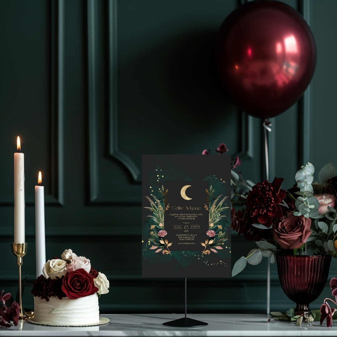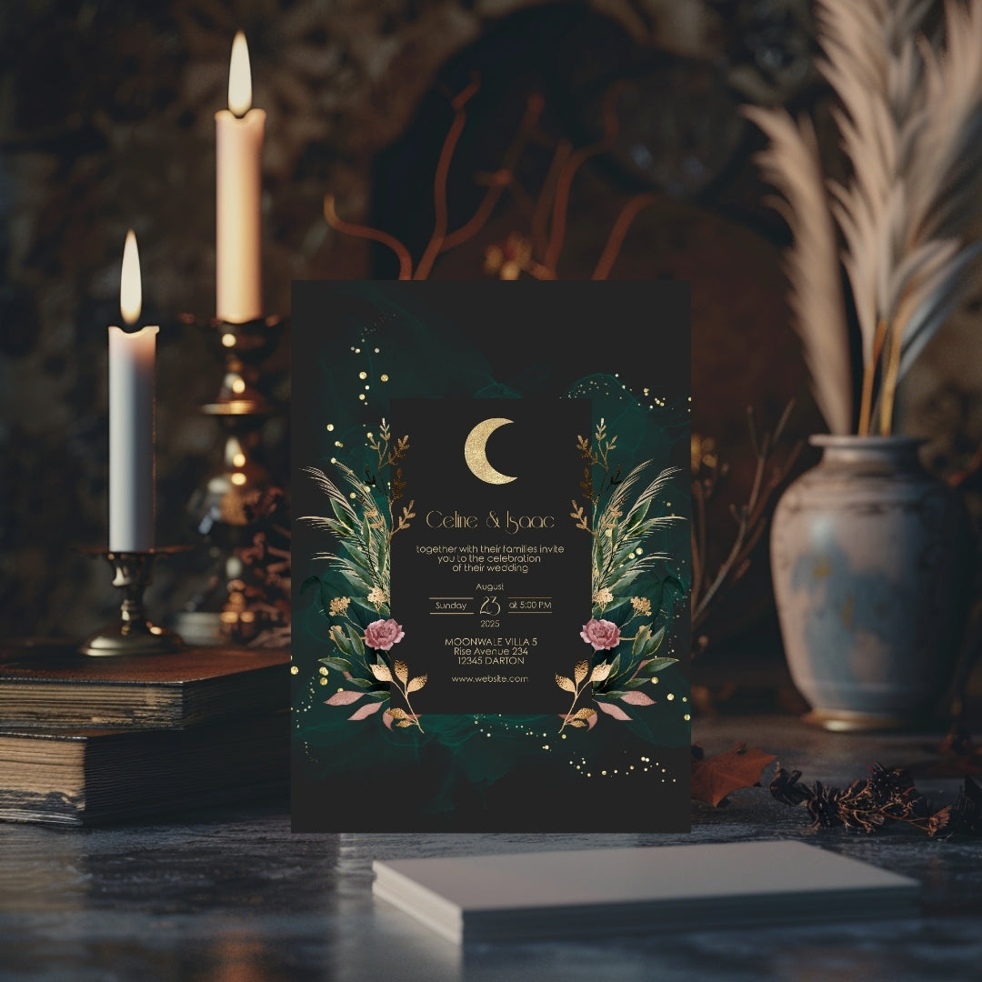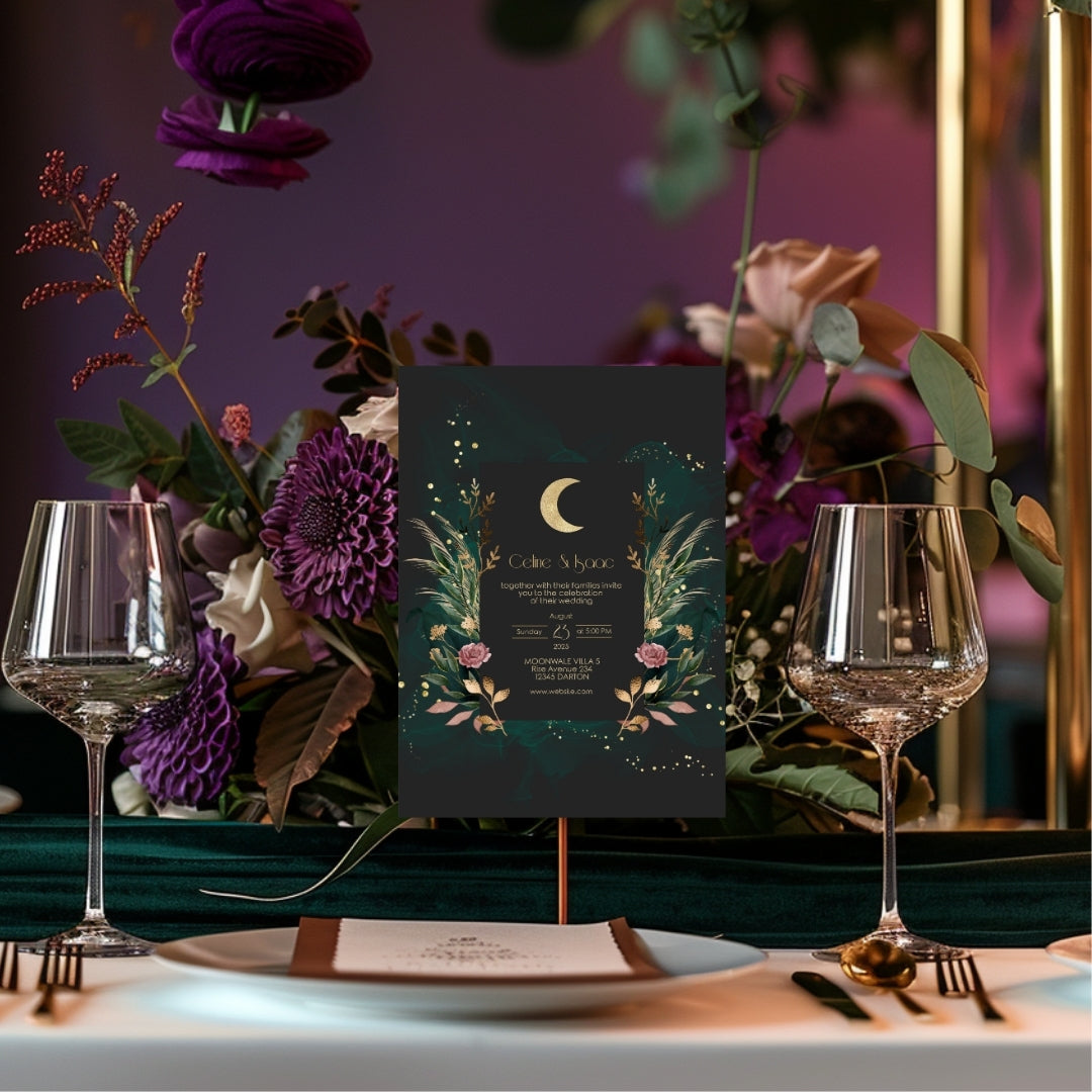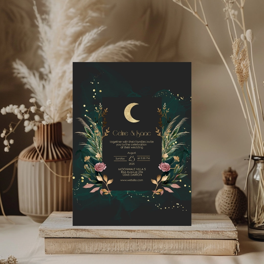 Immerse your guests in the magic of a starlit celebration with this Celestial Garden Night Wedding Invitation. Inspired by the enchanting beauty of a midnight garden under a crescent moon, this digital invitation template is the perfect announcement for your wedding, anniversary, milestone birthday, or any festive occasion that calls for a touch of celestial wonder. The lush botanical motifs, accented with shimmering gold touches on a deep night sky backdrop, craft a story of timeless romance. Easily customizable with Corjl, you can send this invitation digitally or print it to cherish as a beautiful keepsake.
