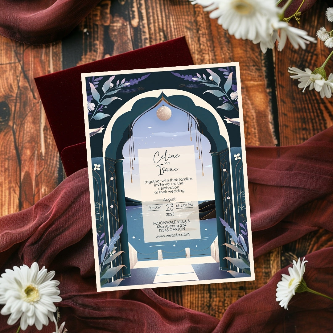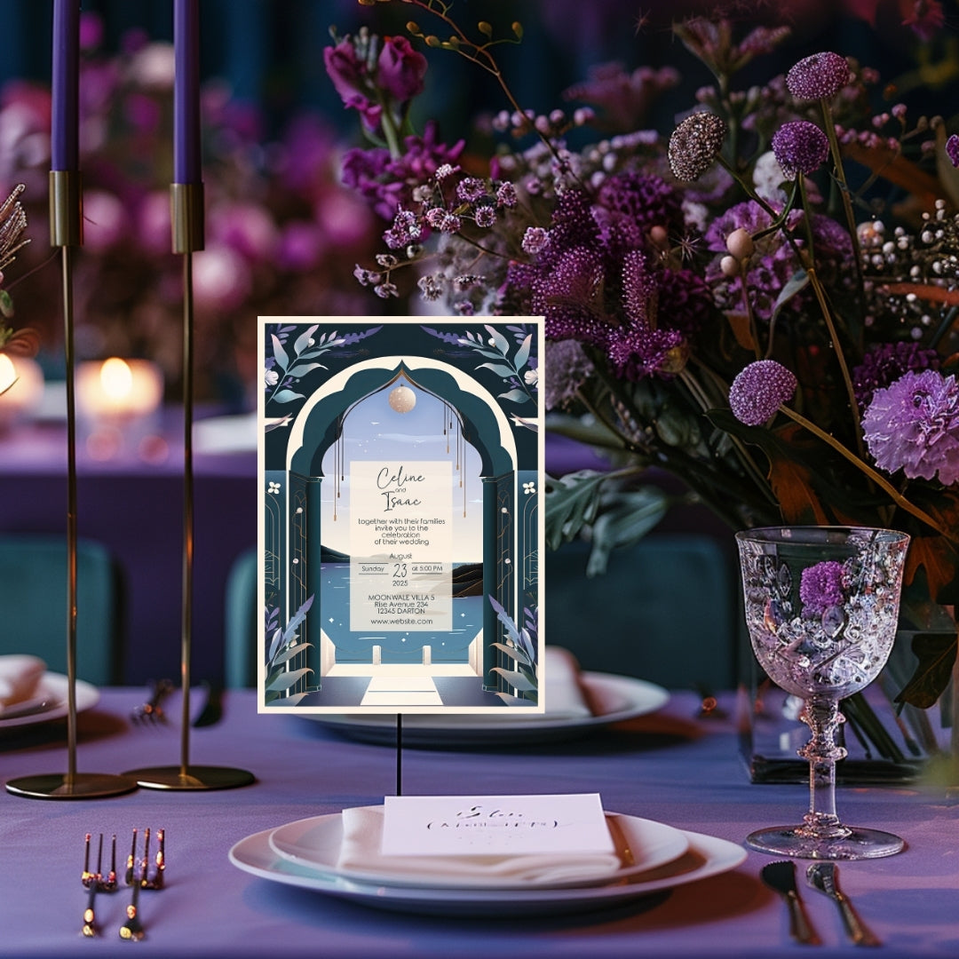 Unveil the allure of midnight gardens and dark Art Deco sophistication with our digital invitation template, designed for a diverse array of events such as weddings, anniversaries, and other enchanting celebrations. With its sumptuous arches and floral silhouettes set against a rich nocturnal palette, this invitation is your portal to an event shrouded in mystery, gothic elements and elegance. The template is easily customizable, allowing you to imbue your personal touch while ensuring a seamless experience from digital to print.