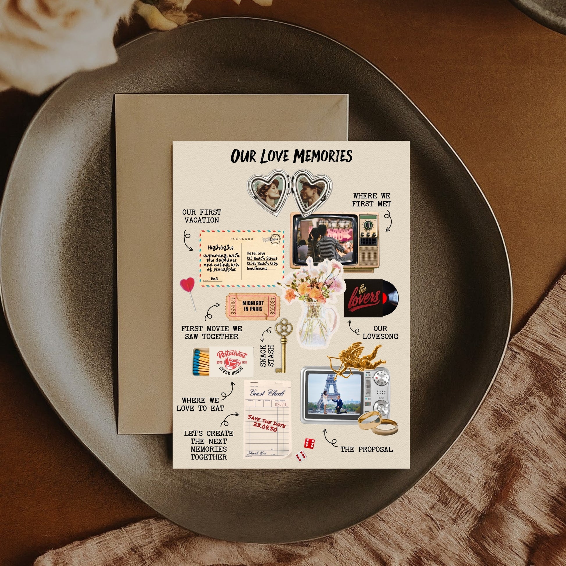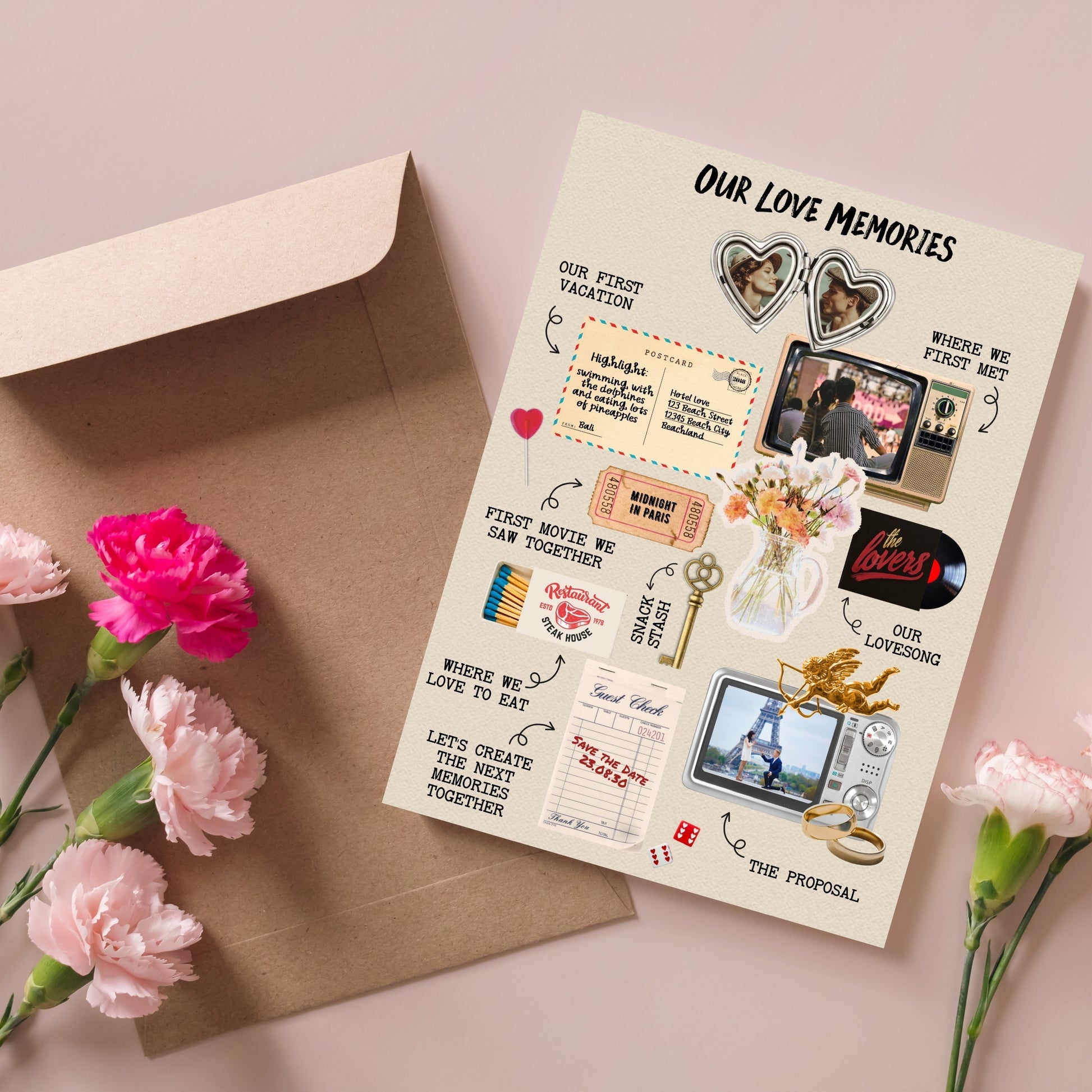 ✔️𝙎𝙩𝙪𝙣𝙣𝙞𝙣𝙜 𝘿𝙚𝙨𝙞𝙜𝙣: With torn paper textures, dried blooms, vintage cameras, heart lockets, tickets, and golden accents, this invitation brings scrapbook storytelling to life in layered, visual poetry.