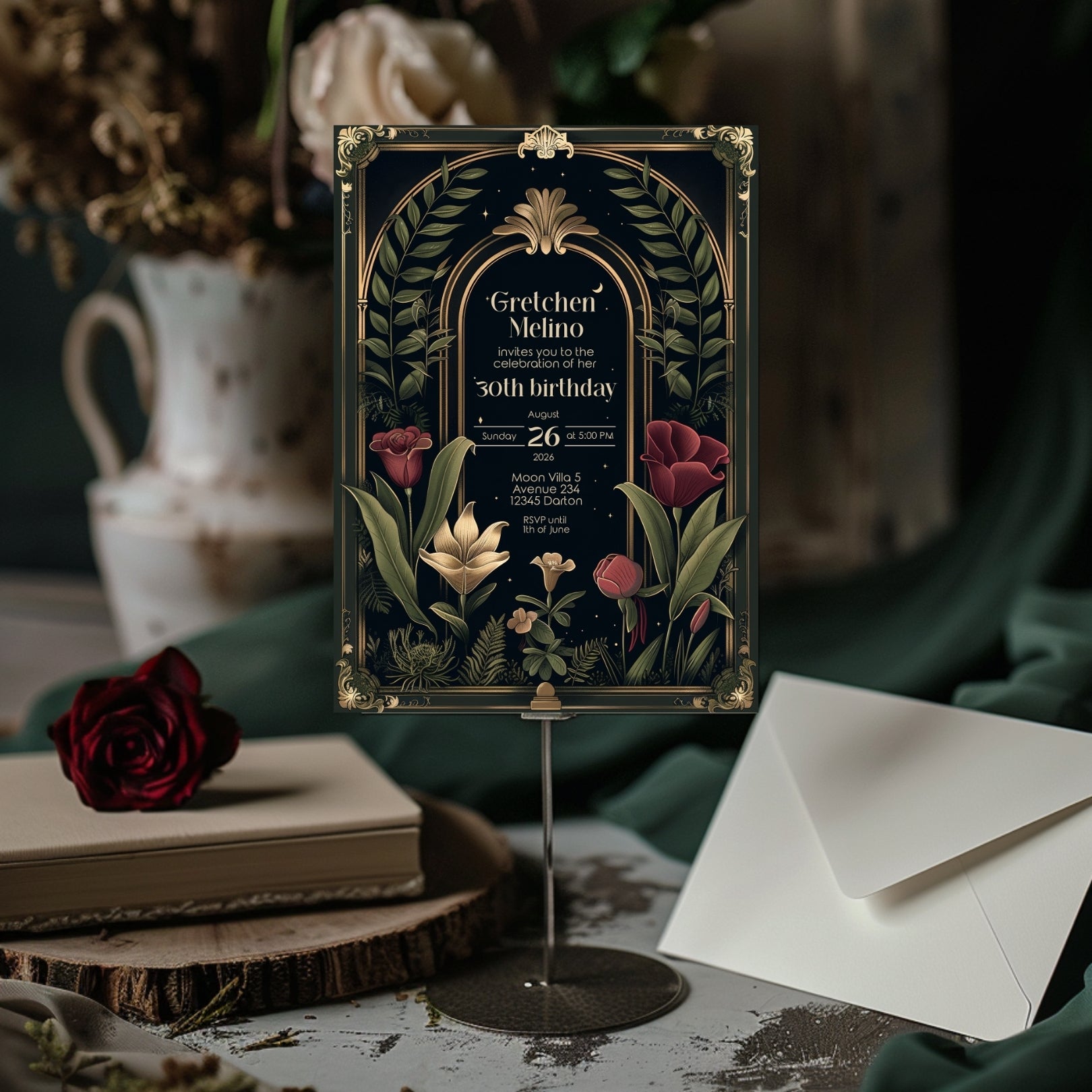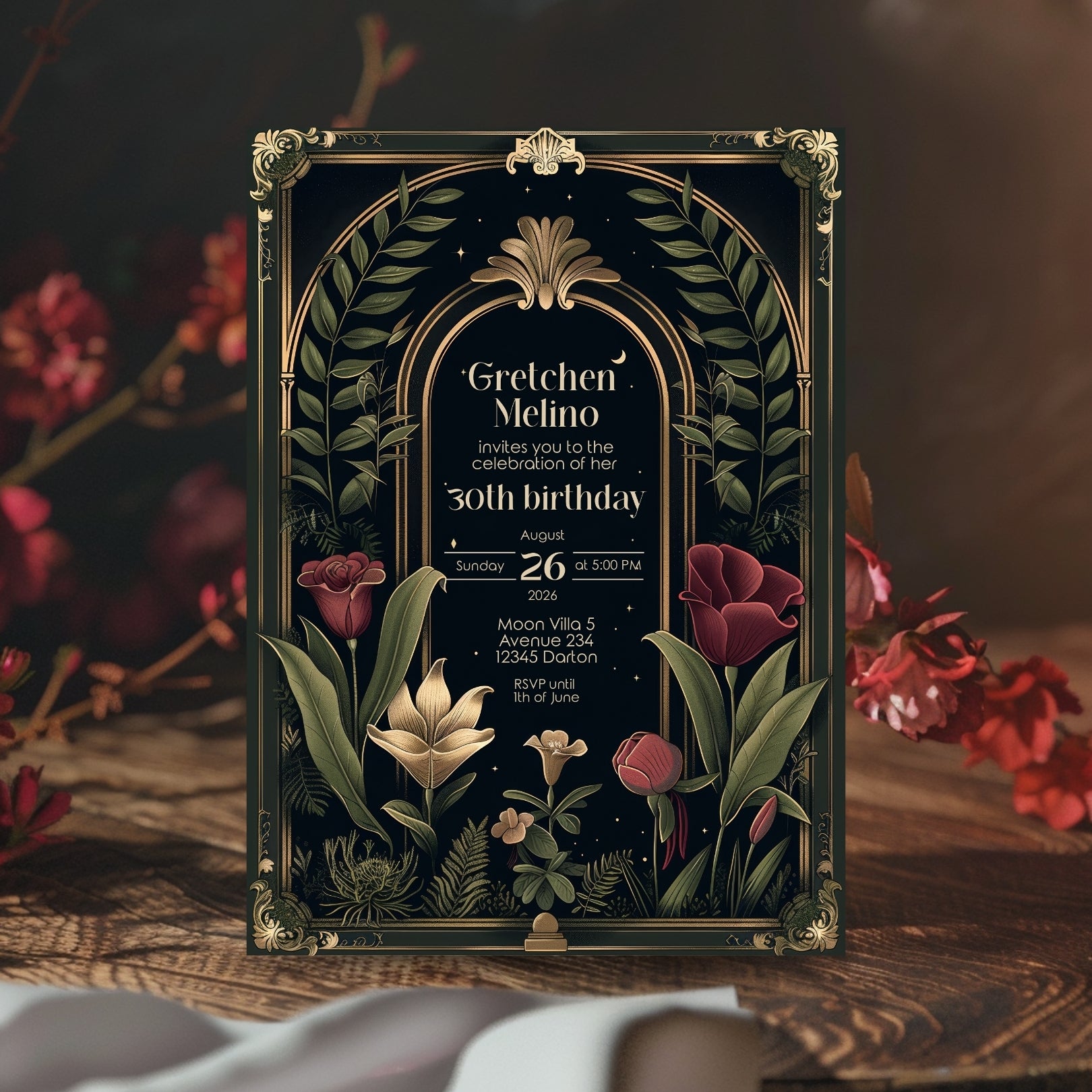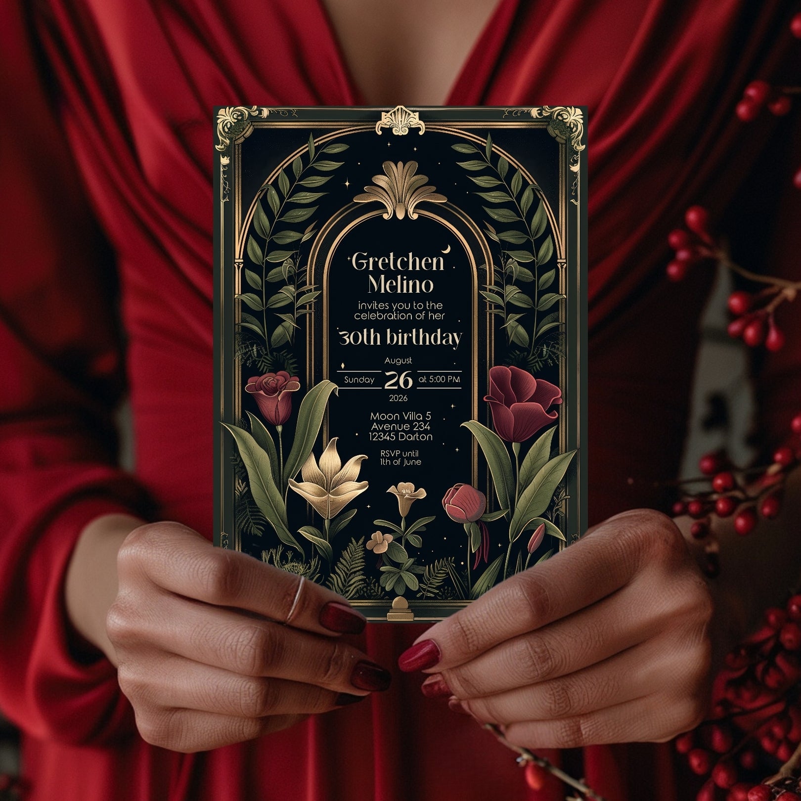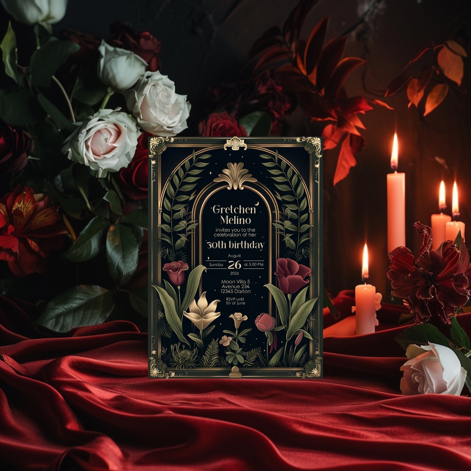 ✔️𝙎𝙩𝙪𝙣𝙣𝙞𝙣𝙜 𝘿𝙚𝙨𝙞𝙜𝙣: Featuring ornate Art Deco borders, a gothic arch, and lush botanical illustrations against a deep, dark background, this invitation captures the essence of Dark Academia. The rich reds, greens, and gold accents add a touch of luxury and depth.