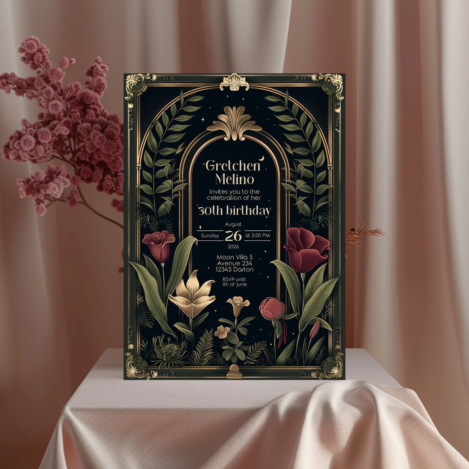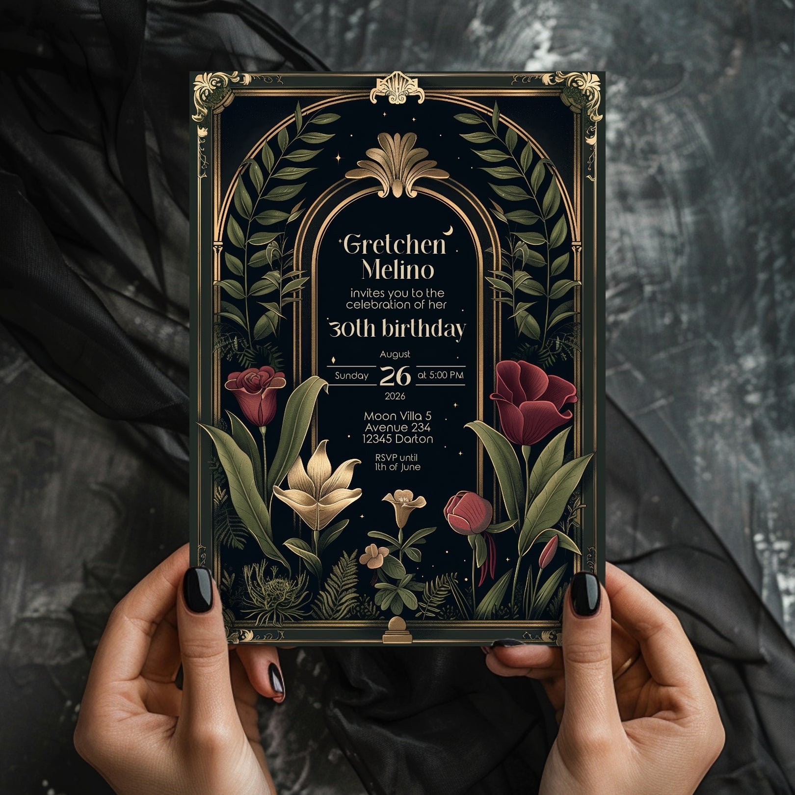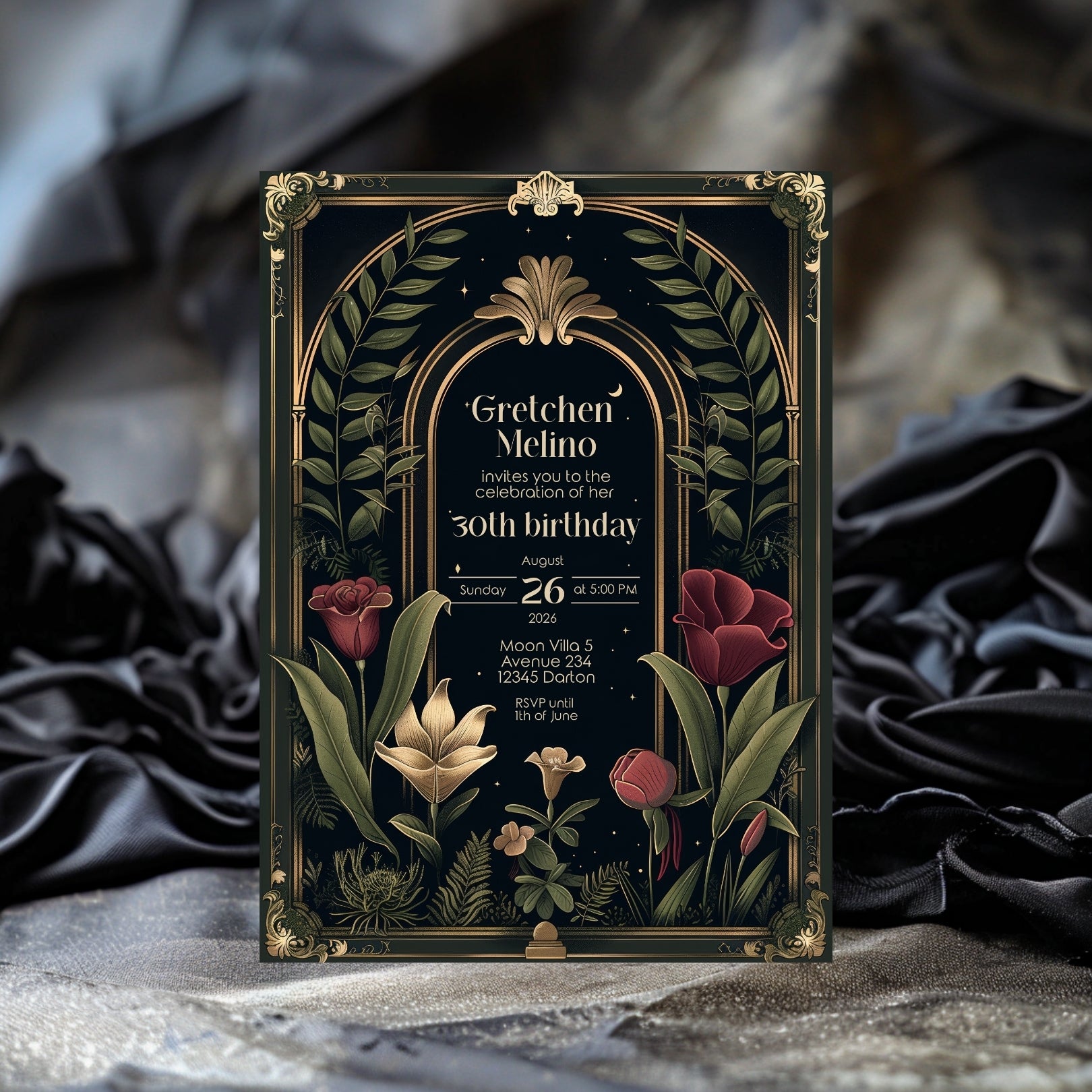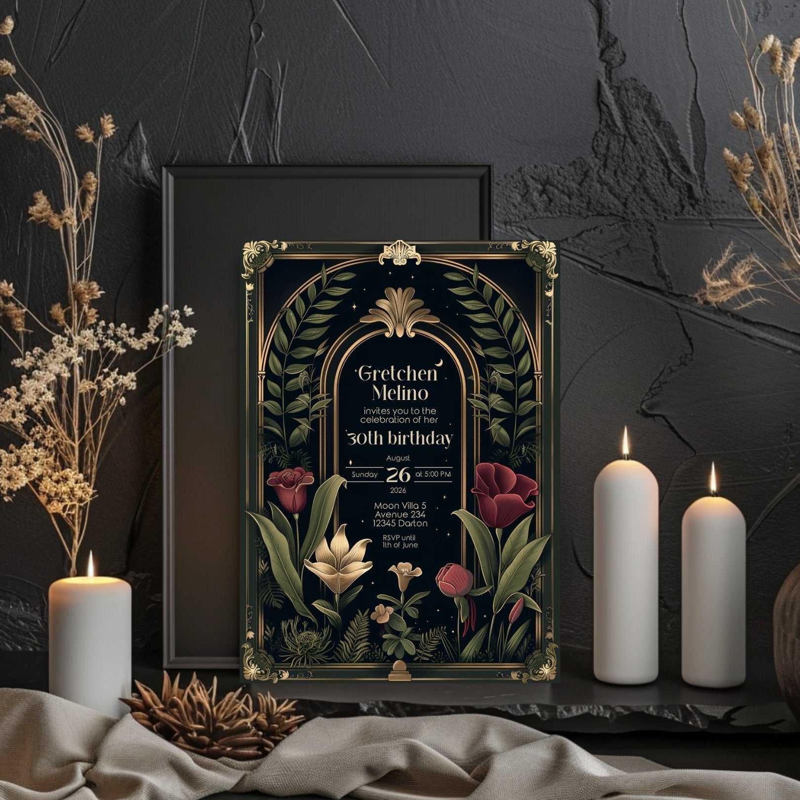 ✔️𝙎𝙩𝙪𝙣𝙣𝙞𝙣𝙜 𝘿𝙚𝙨𝙞𝙜𝙣: Featuring ornate Art Deco borders, a gothic arch, and lush botanical illustrations against a deep, dark background, this invitation captures the essence of Dark Academia. The rich reds, greens, and gold accents add a touch of luxury and depth.