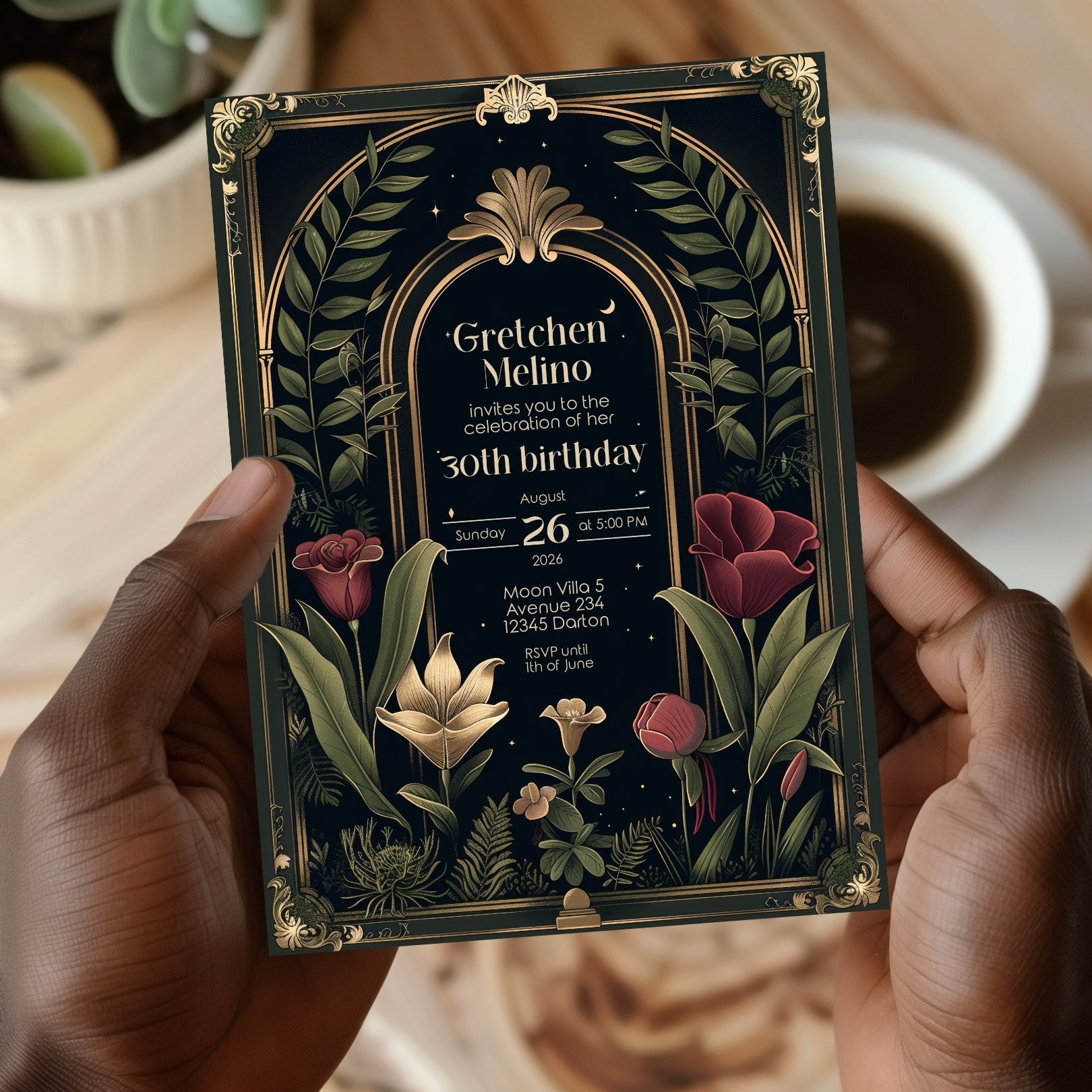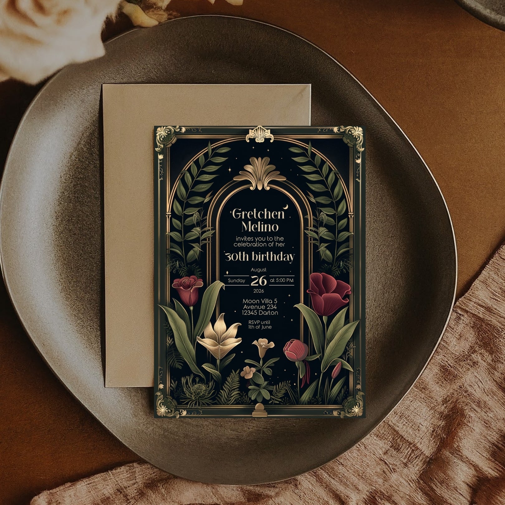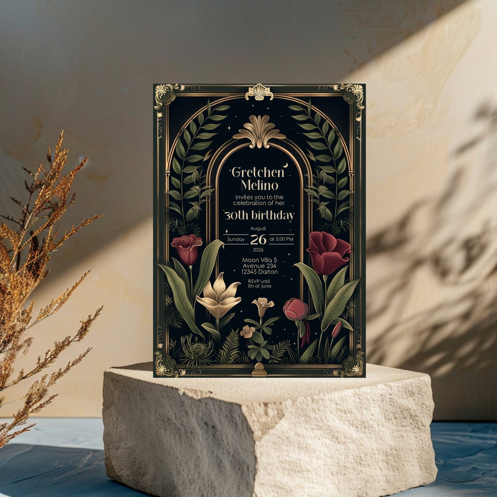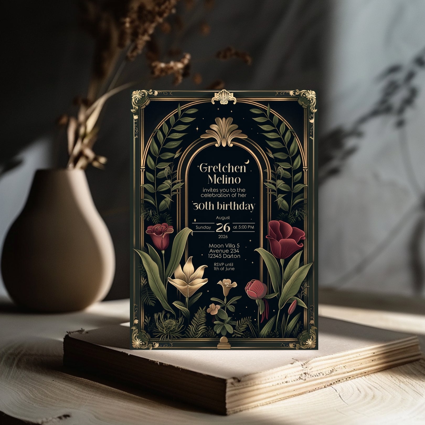 ✔️𝙎𝙩𝙪𝙣𝙣𝙞𝙣𝙜 𝘿𝙚𝙨𝙞𝙜𝙣: Featuring ornate Art Deco borders, a gothic arch, and lush botanical illustrations against a deep, dark background, this invitation captures the essence of Dark Academia. The rich reds, greens, and gold accents add a touch of luxury and depth.