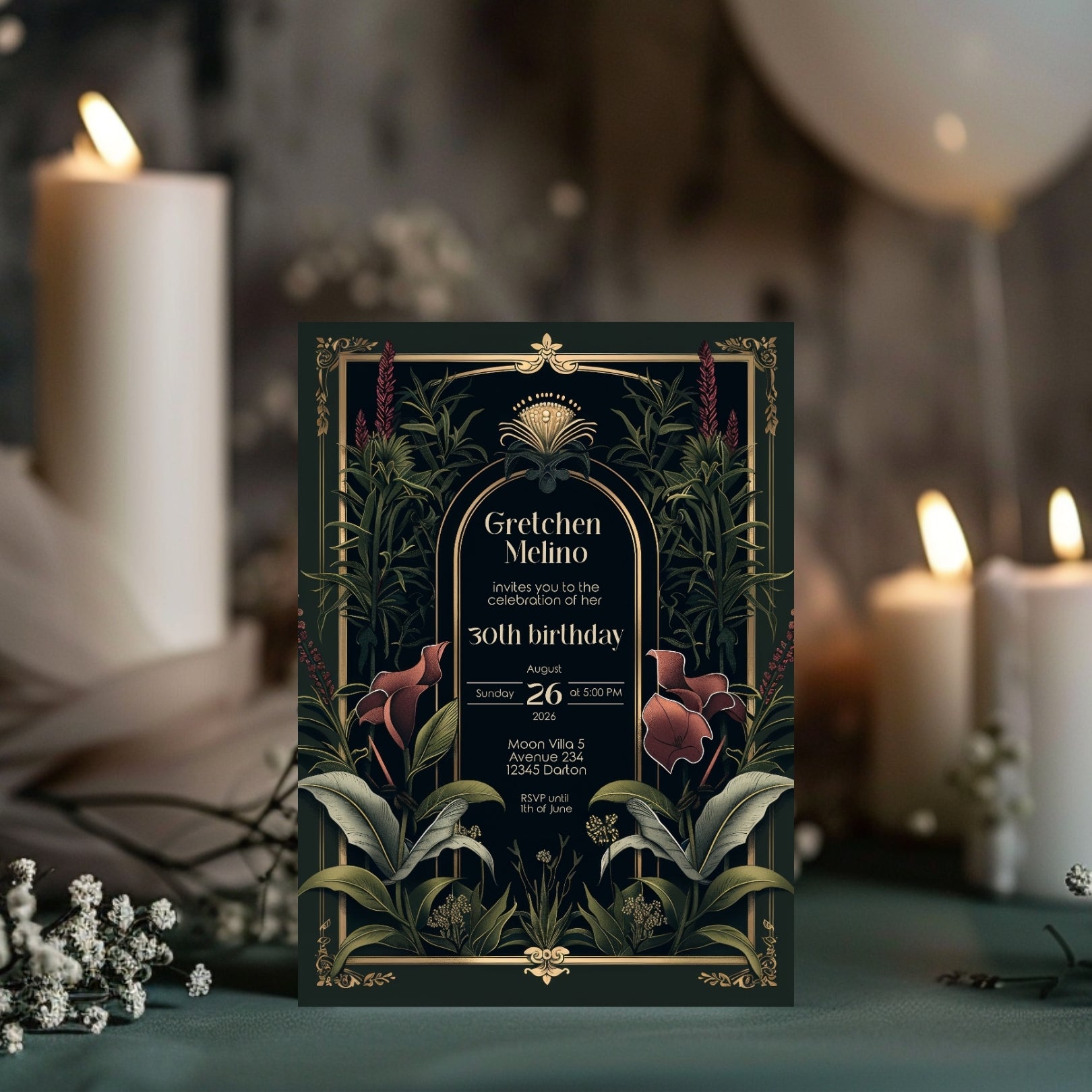 Dark Academia Art Deco Birthday Invitation - Elegant Gothic Flowers Celebration