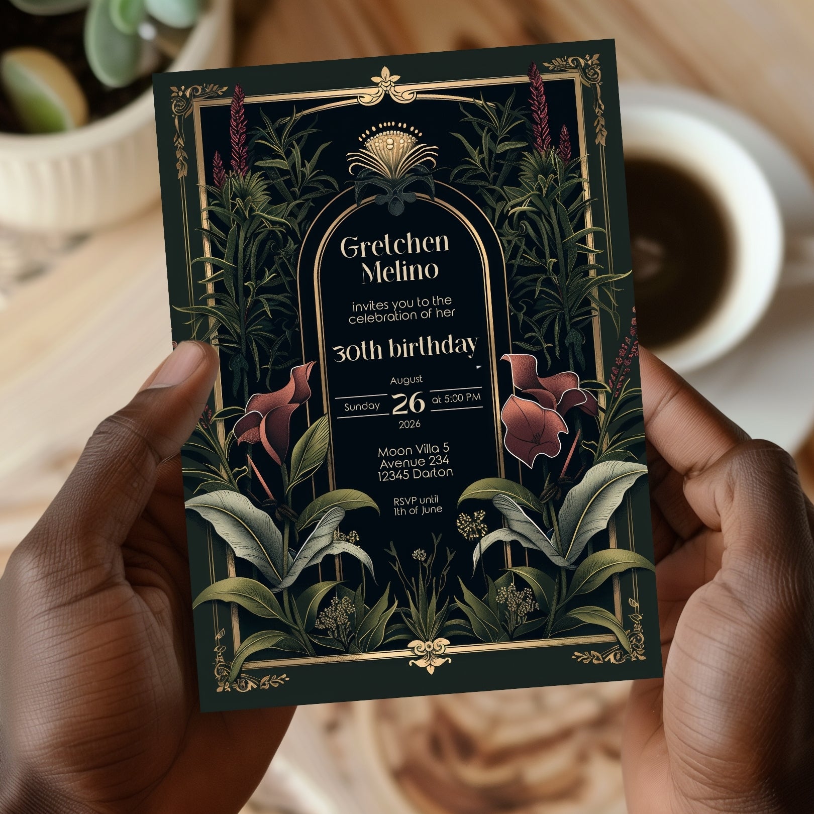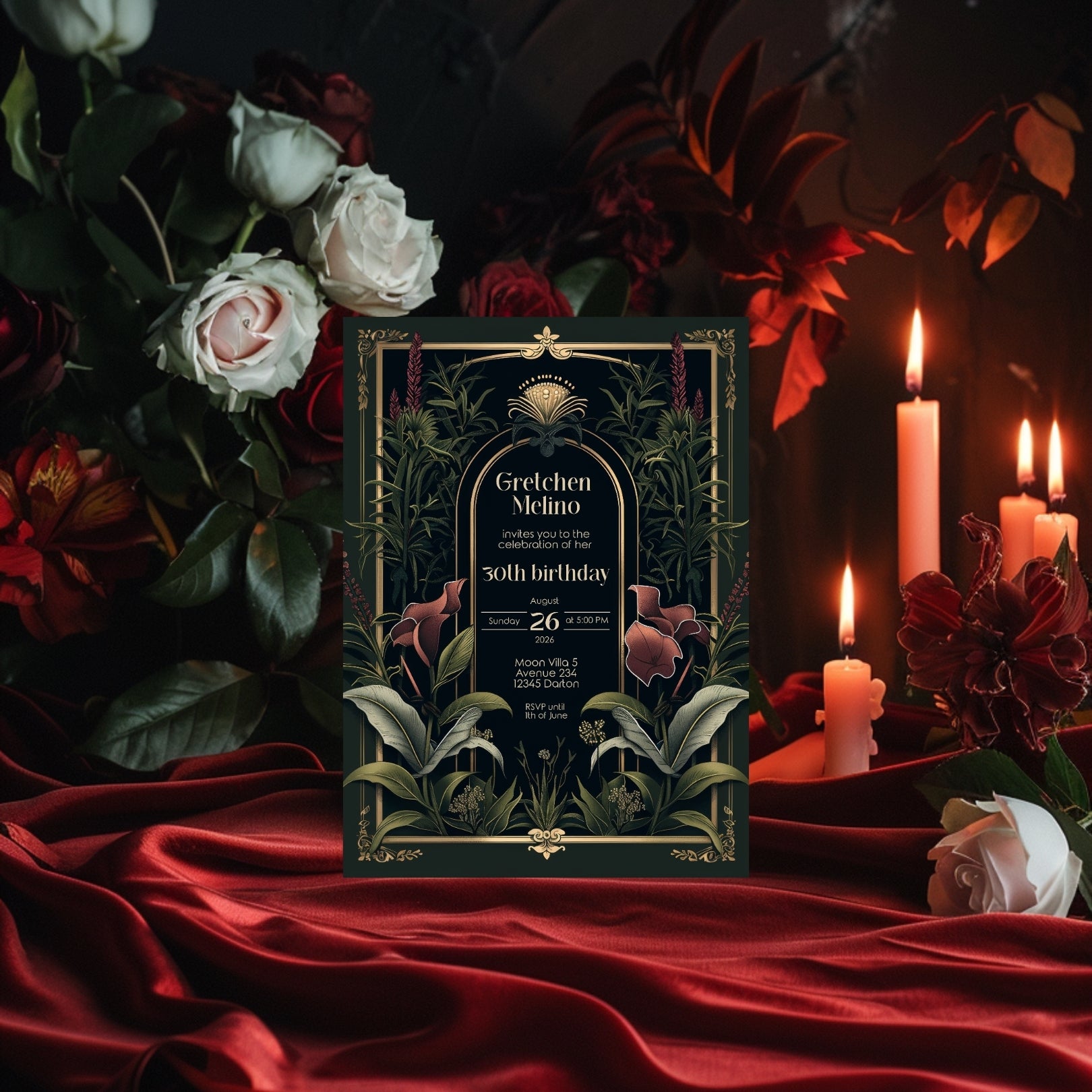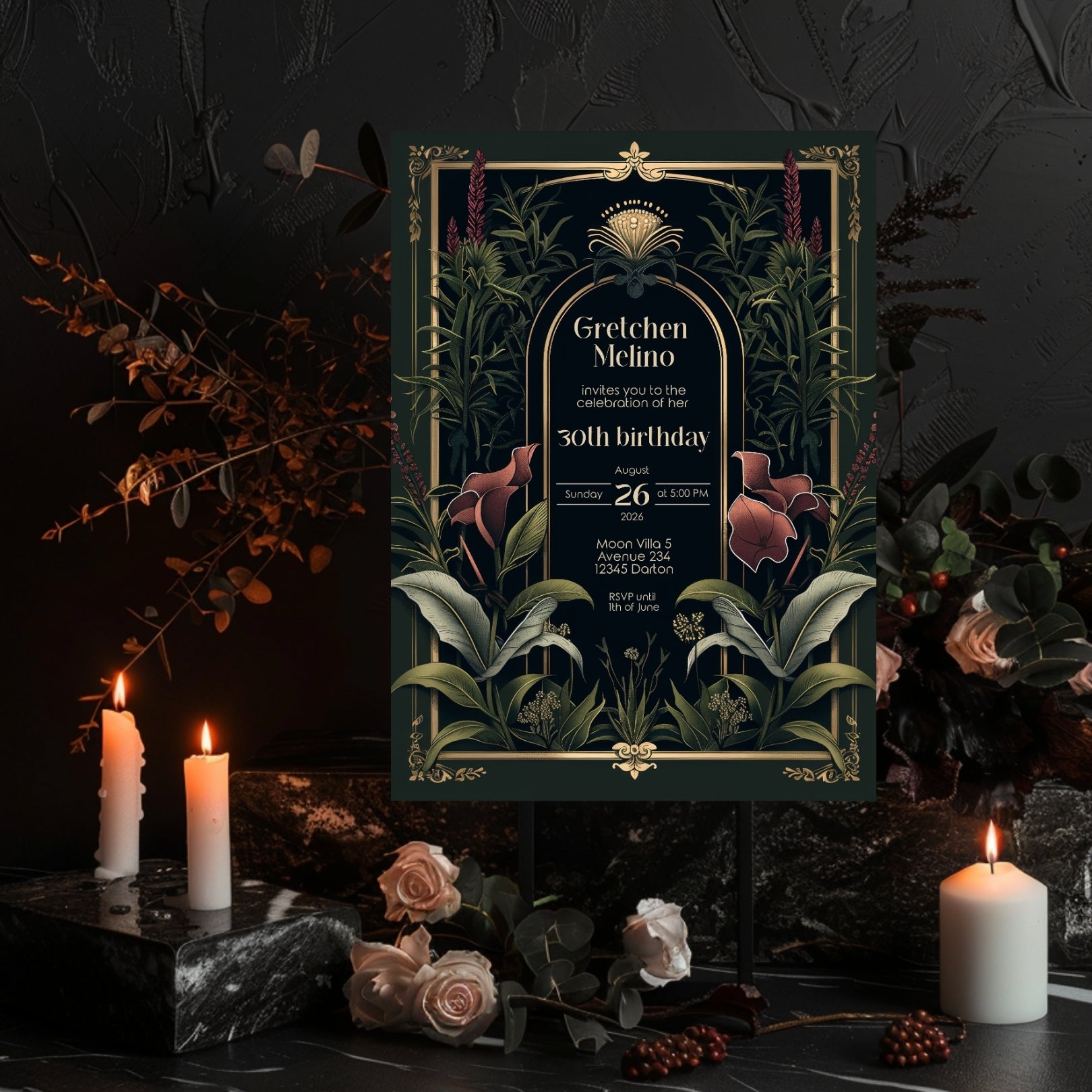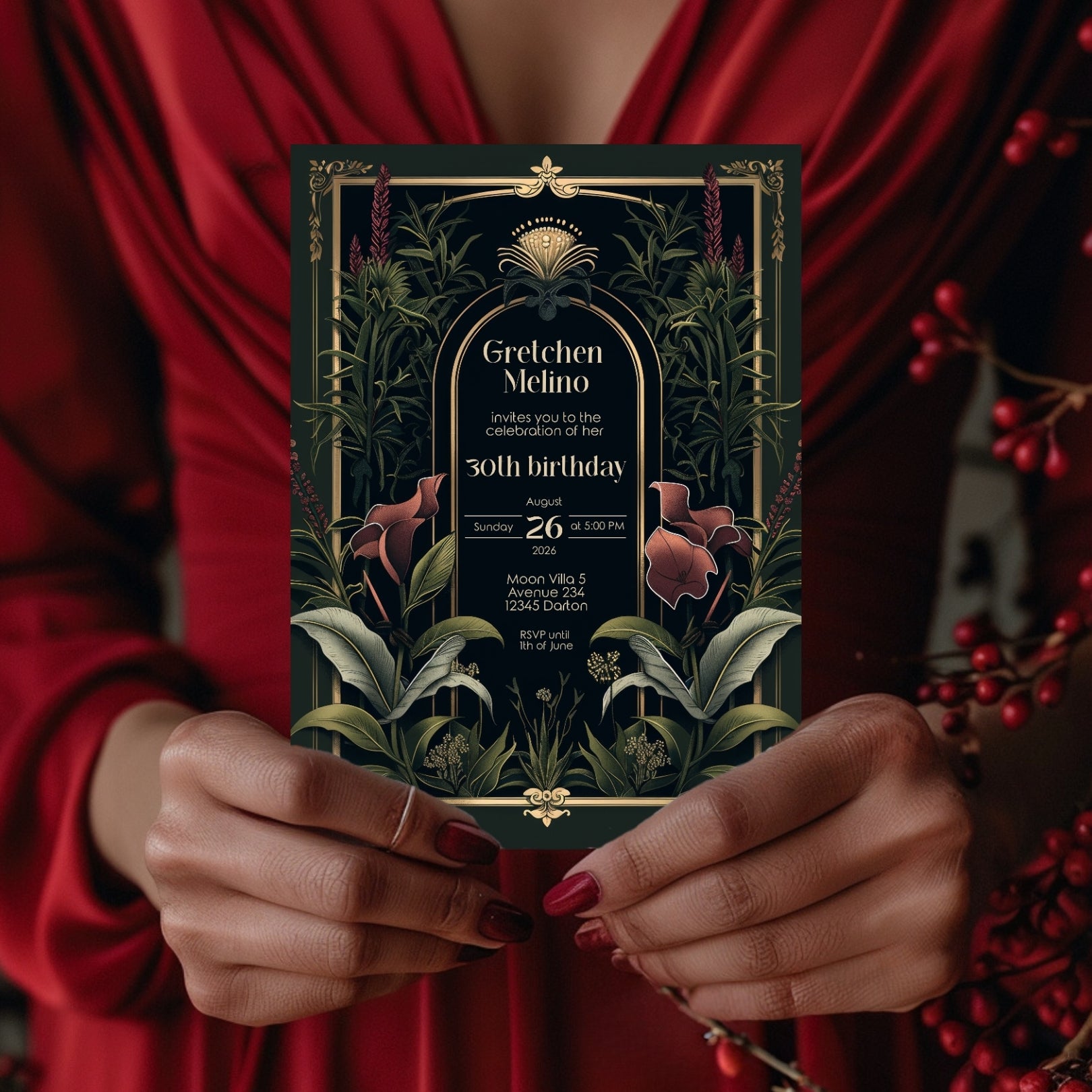 ✔️𝙎𝙩𝙪𝙣𝙣𝙞𝙣𝙜 𝘿𝙚𝙨𝙞𝙜𝙣: Featuring a rich dark background with lush botanical illustrations framed within an ornate gothic arch, this invitation blends the timeless appeal of Dark Academia with the elegance of Art Deco. The deep greens, muted reds, and gold accents create a luxurious and mysterious atmosphere.