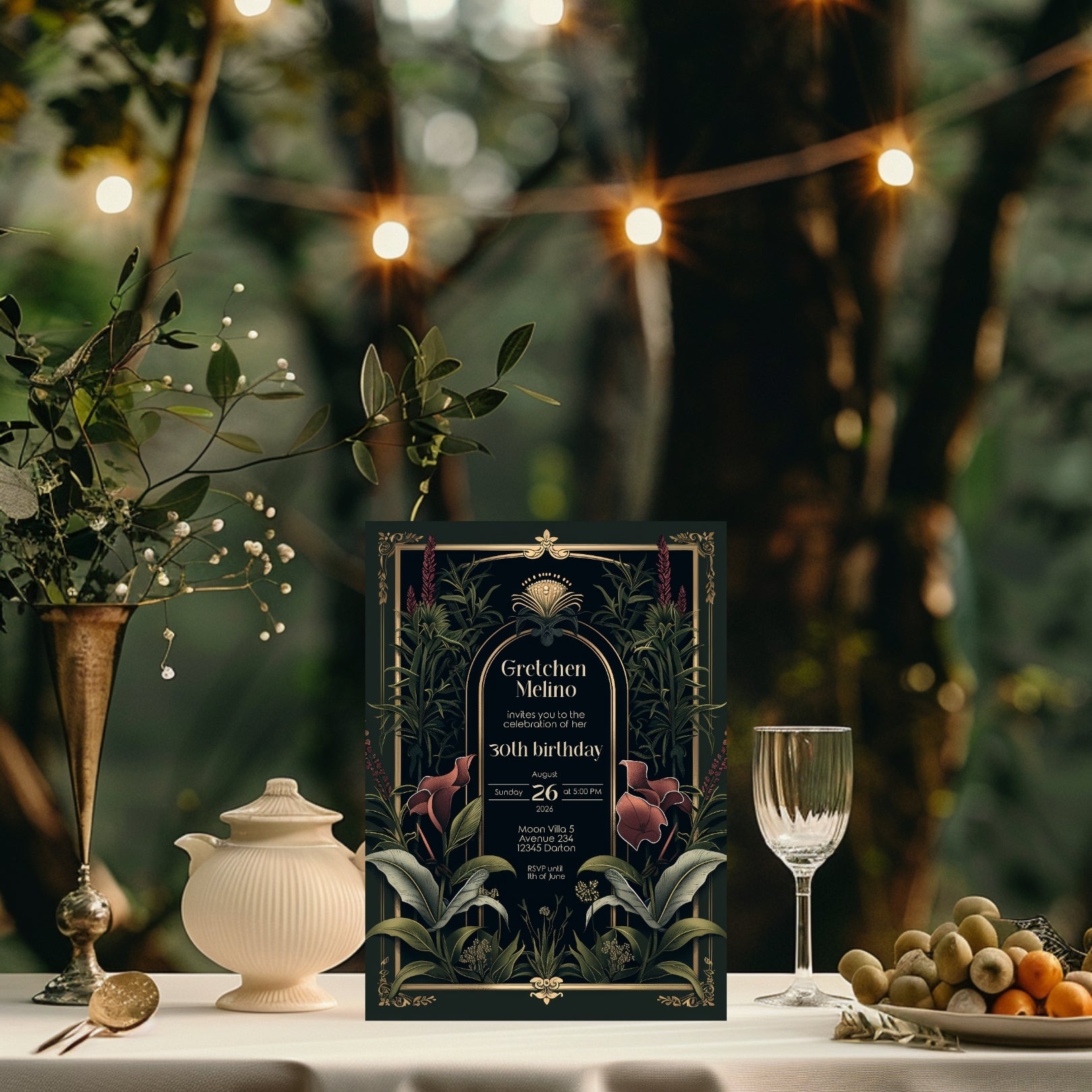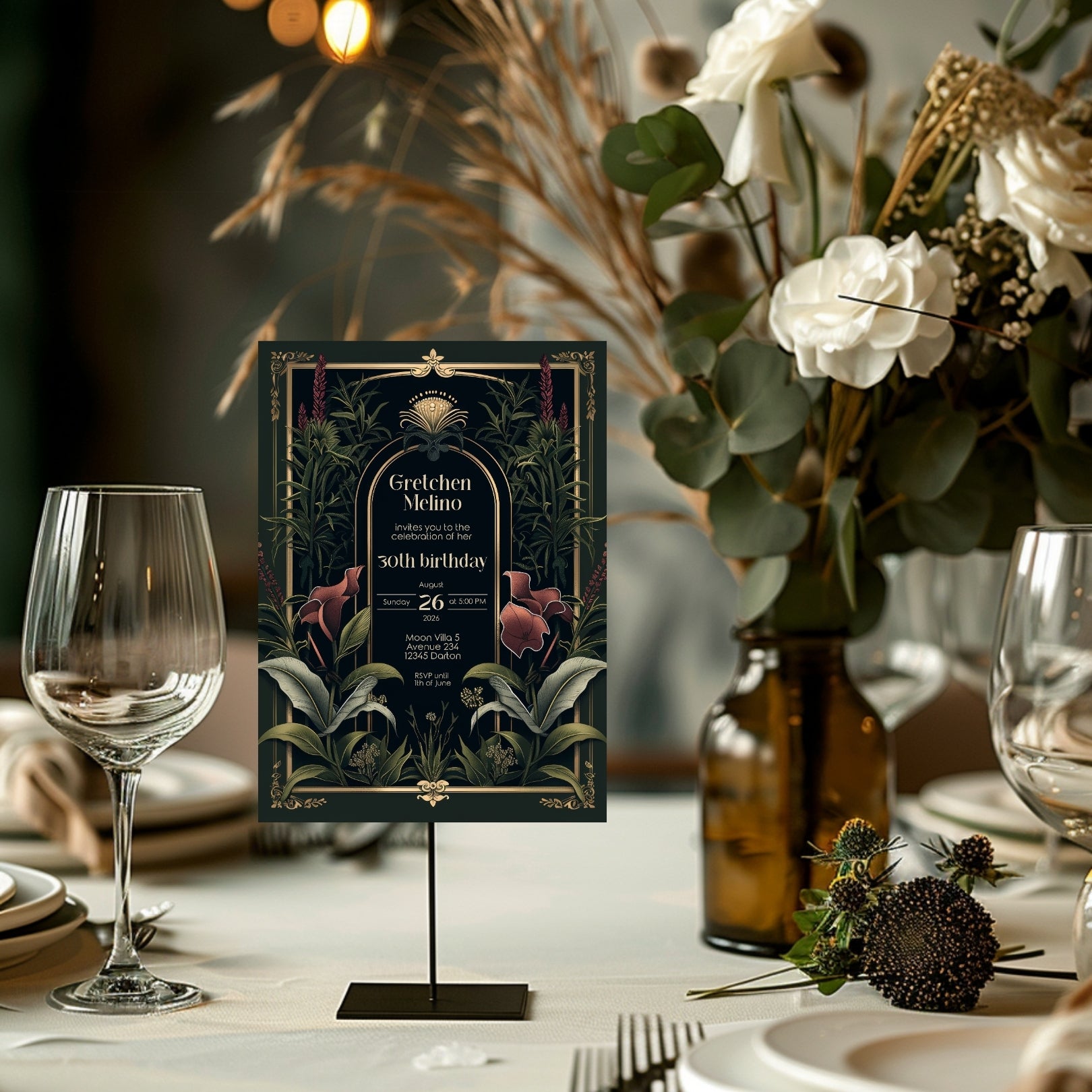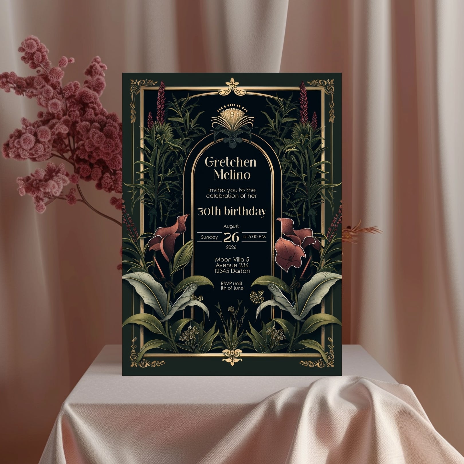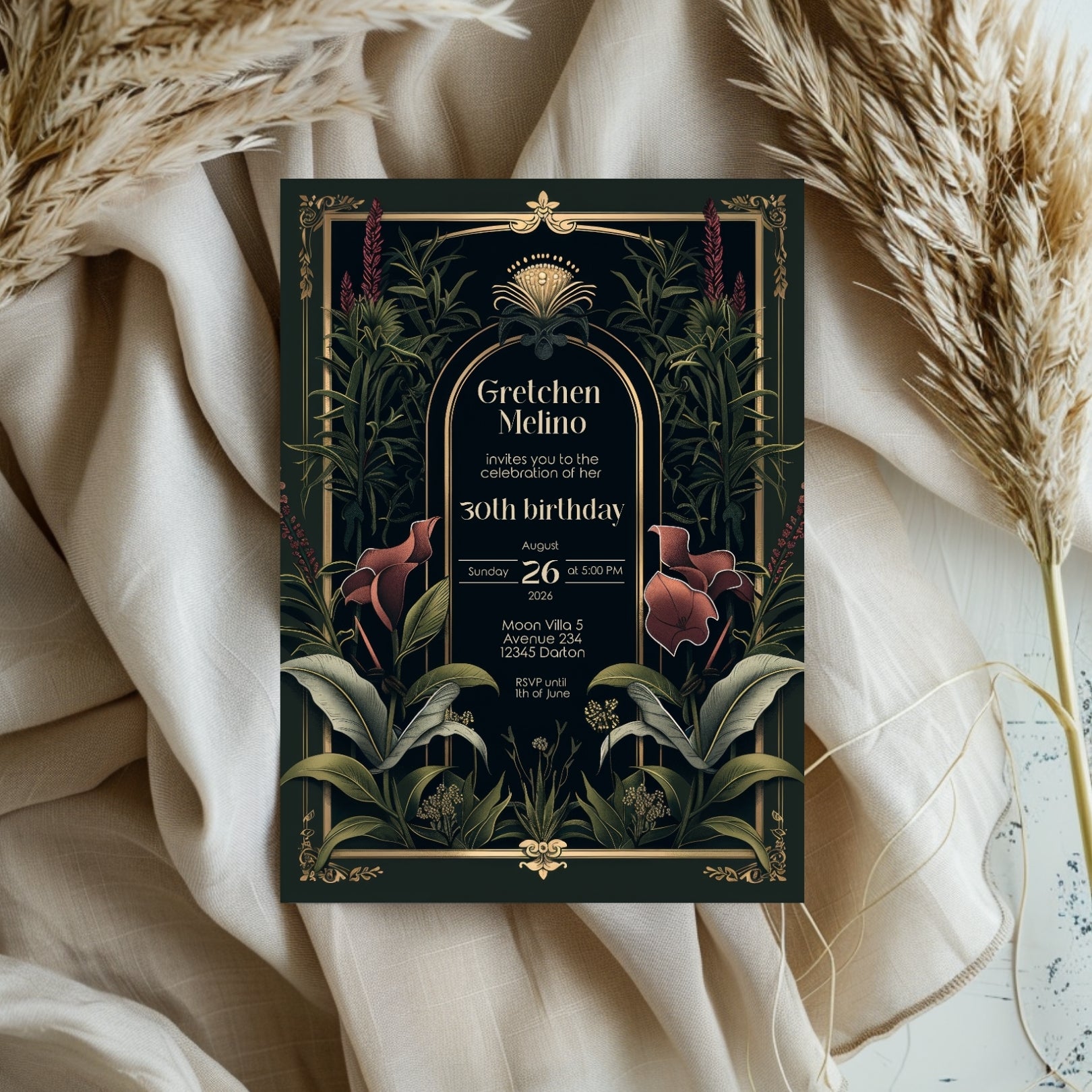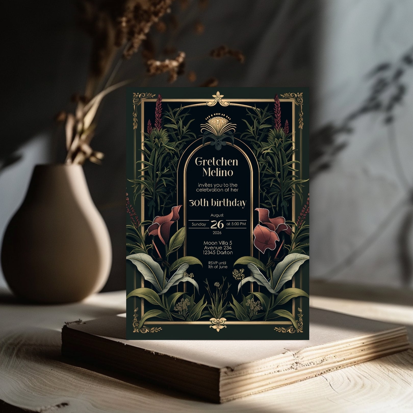 ✔️𝙎𝙩𝙪𝙣𝙣𝙞𝙣𝙜 𝘿𝙚𝙨𝙞𝙜𝙣: Featuring a rich dark background with lush botanical illustrations framed within an ornate gothic arch, this invitation blends the timeless appeal of Dark Academia with the elegance of Art Deco. The deep greens, muted reds, and gold accents create a luxurious and mysterious atmosphere.