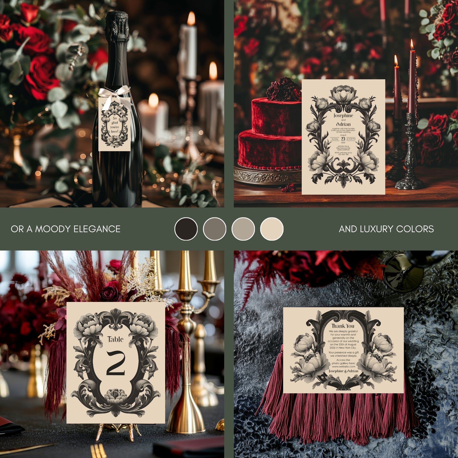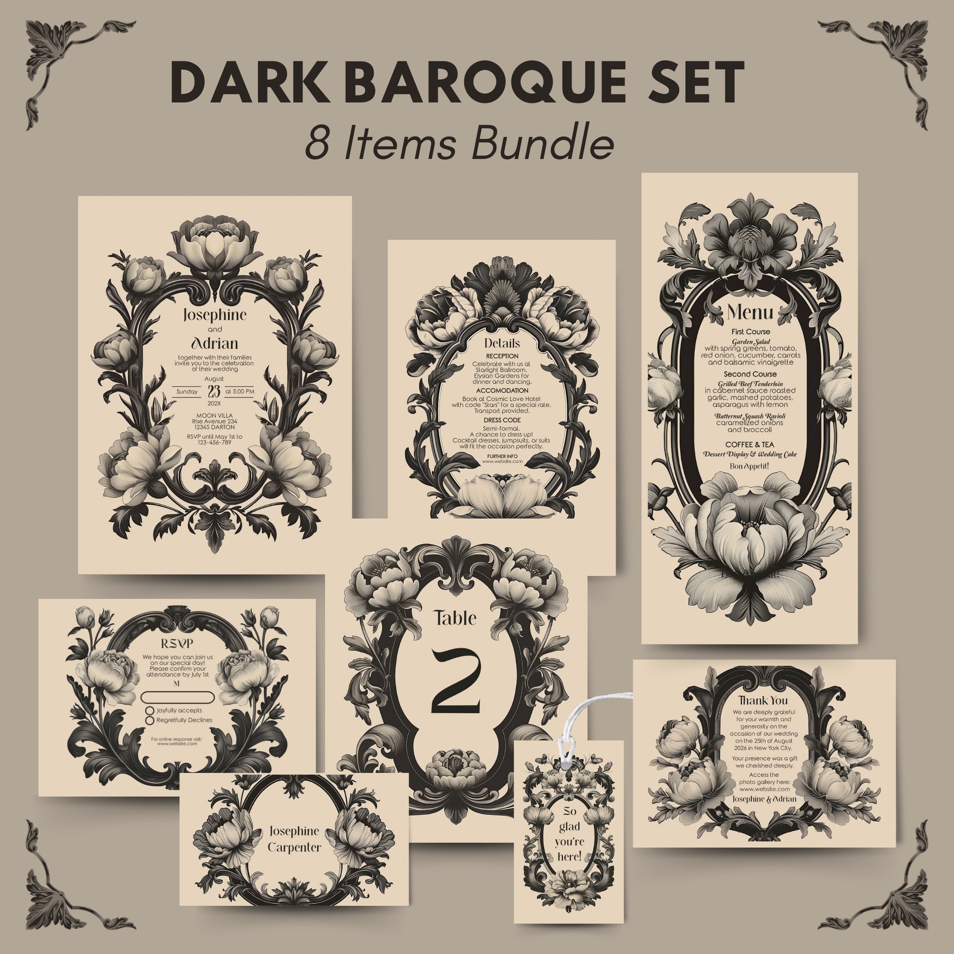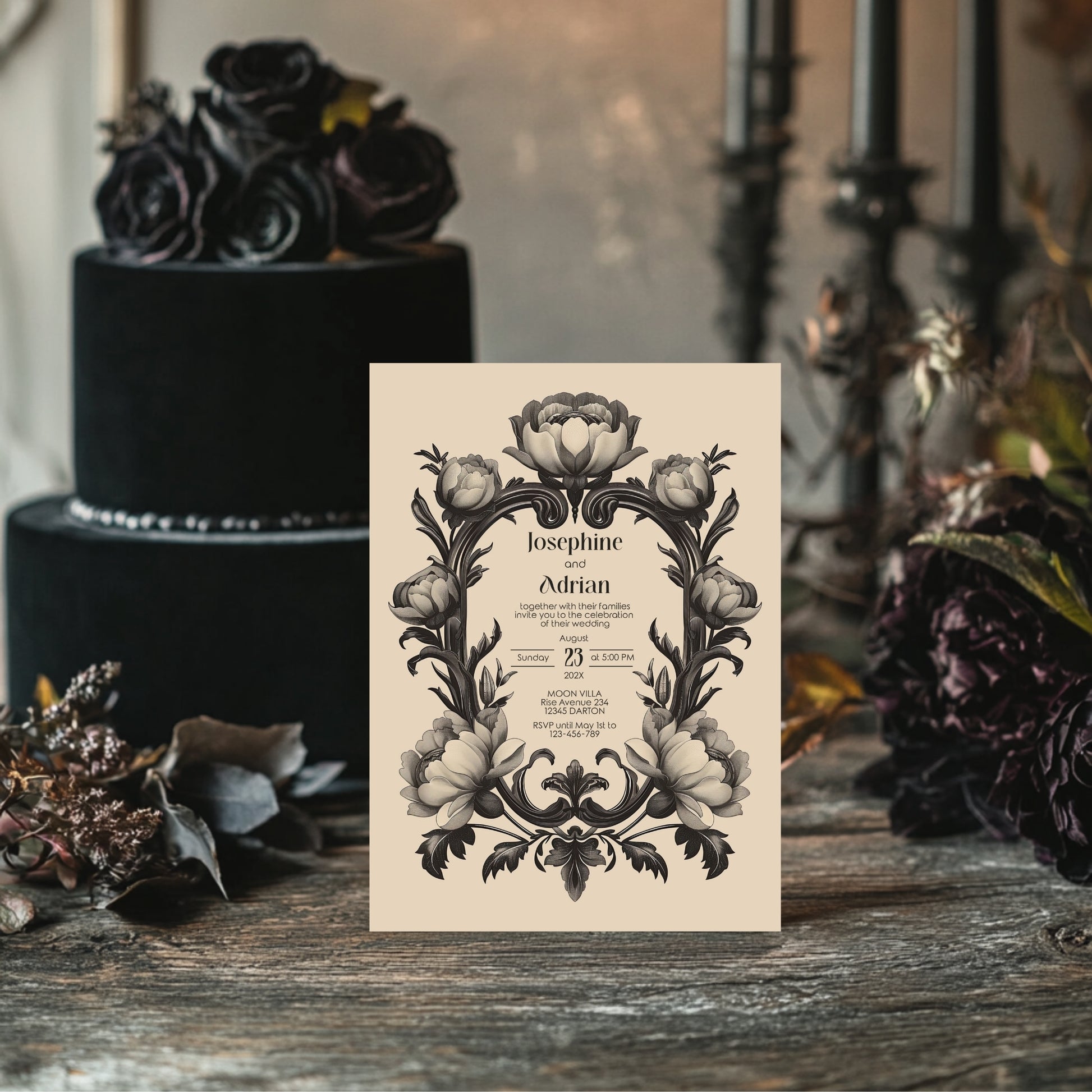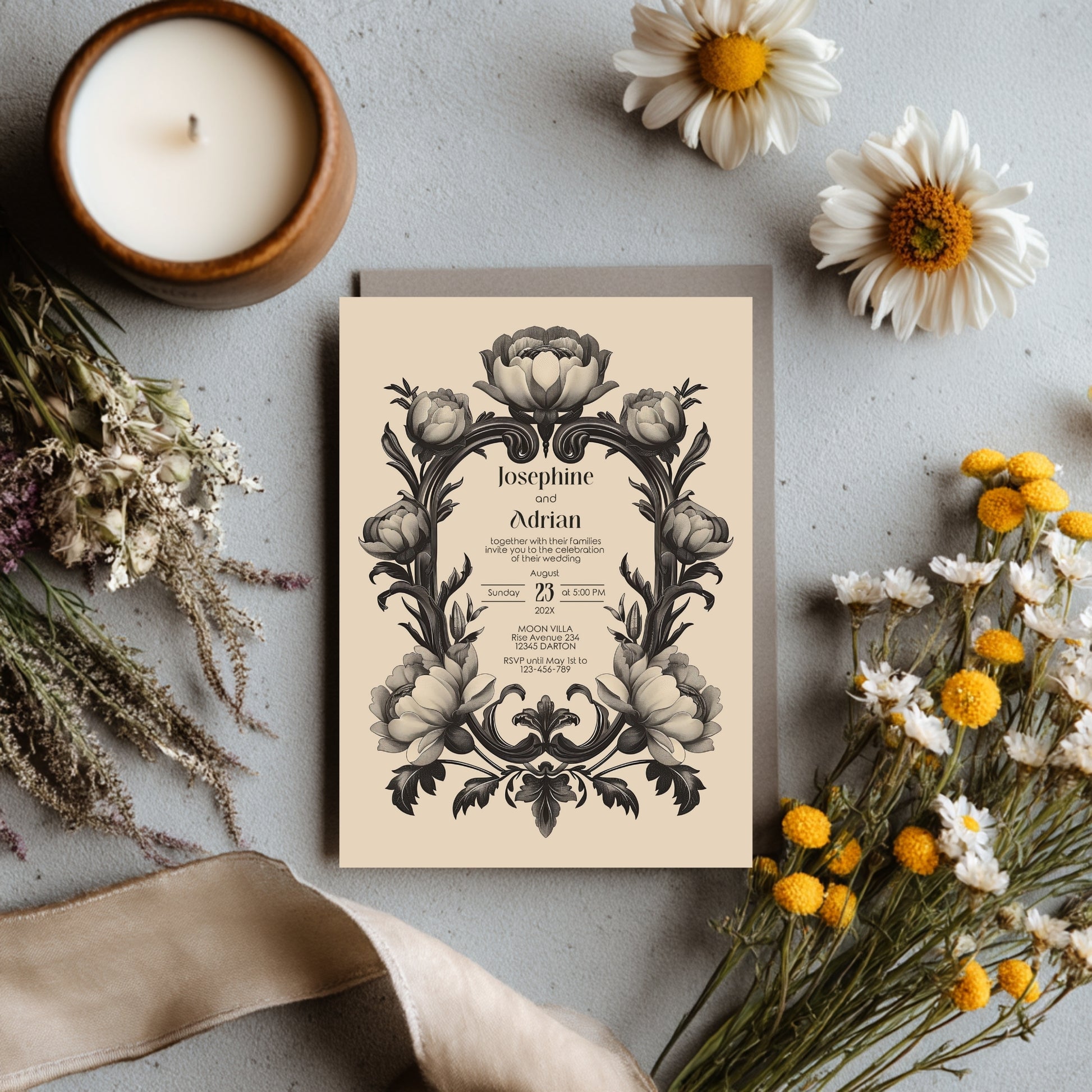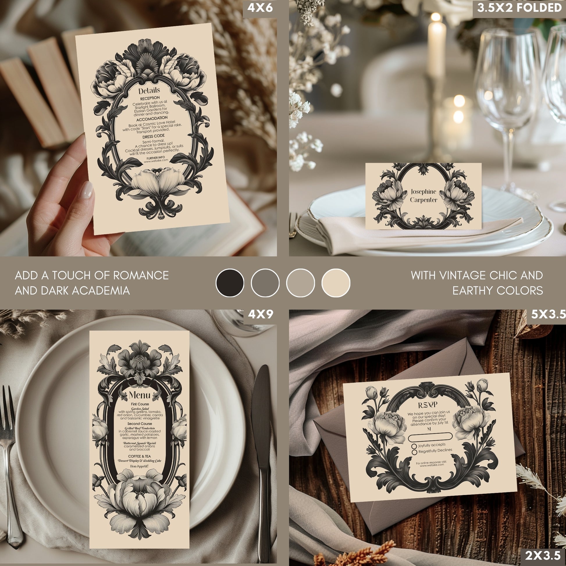 Dark Baroque Wedding Invitation Set - Vintage Beige Floral Design, Black Frame, Editable 8 items