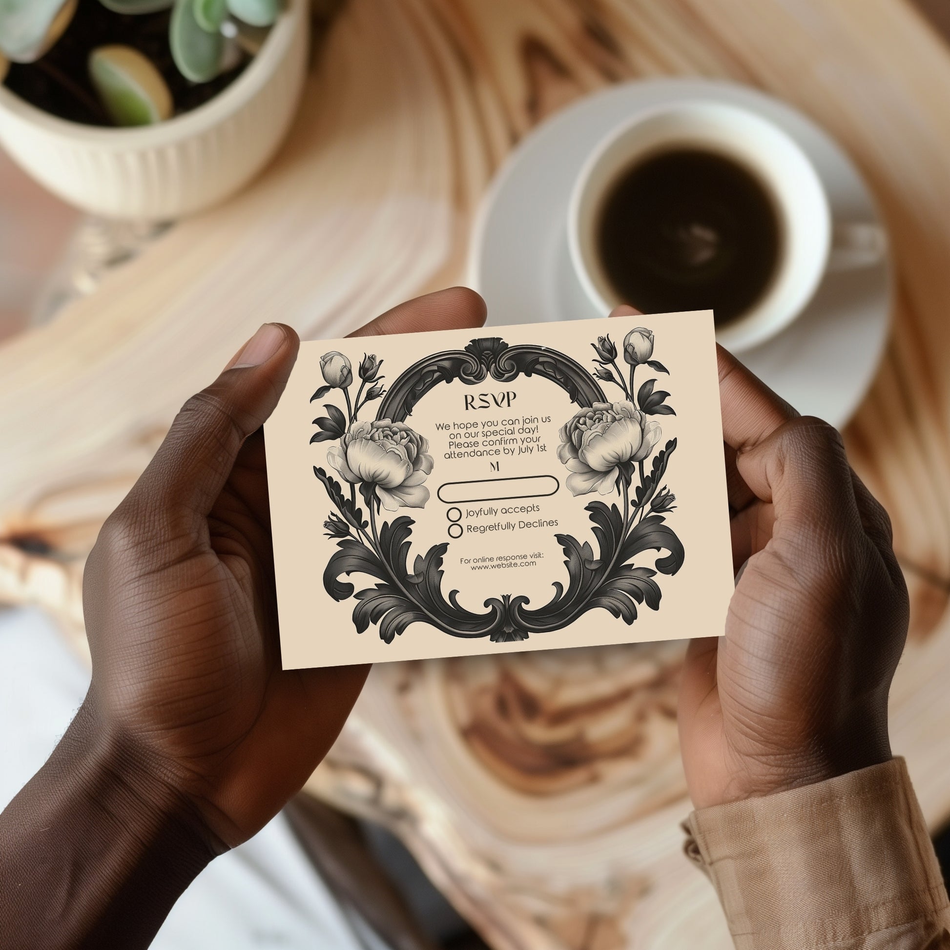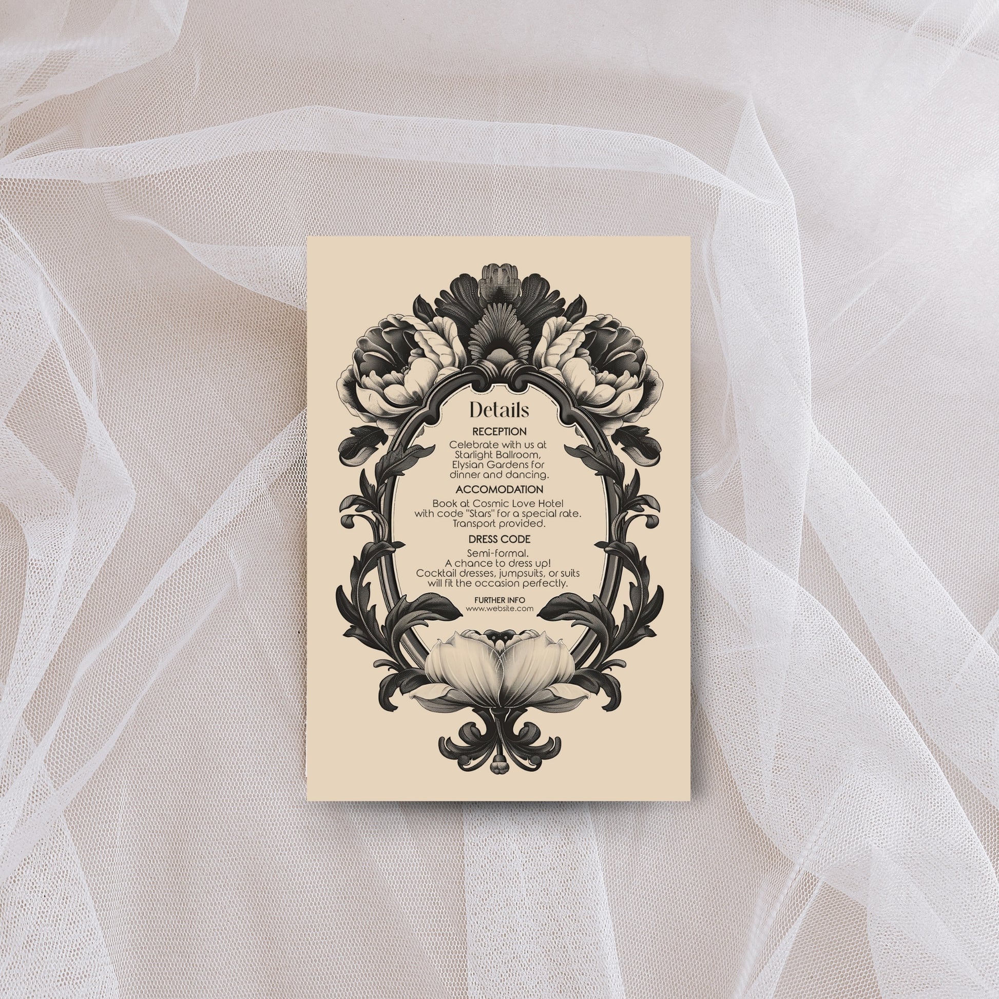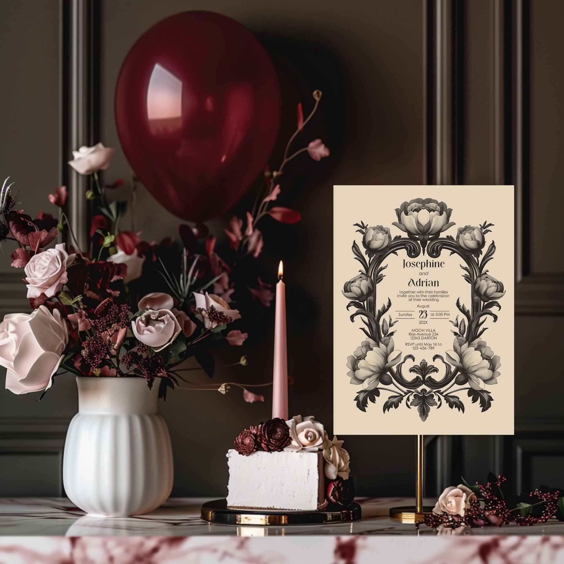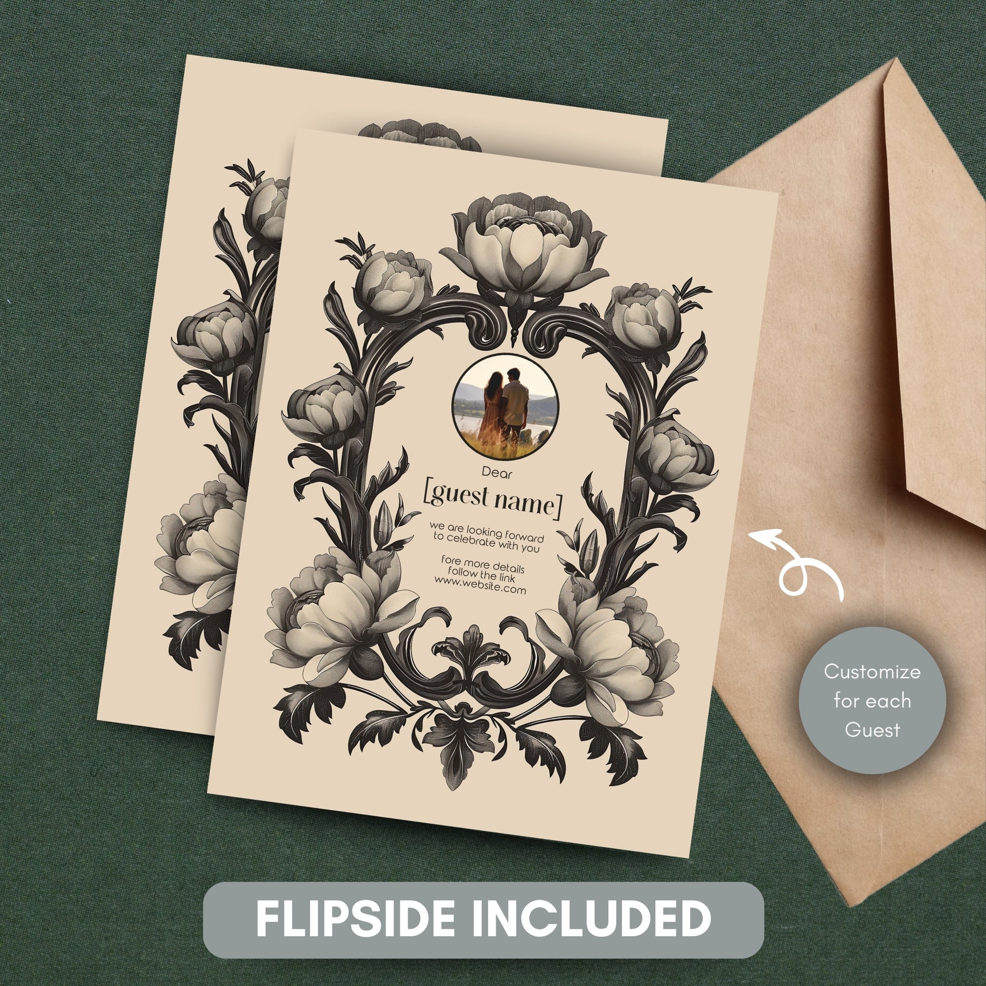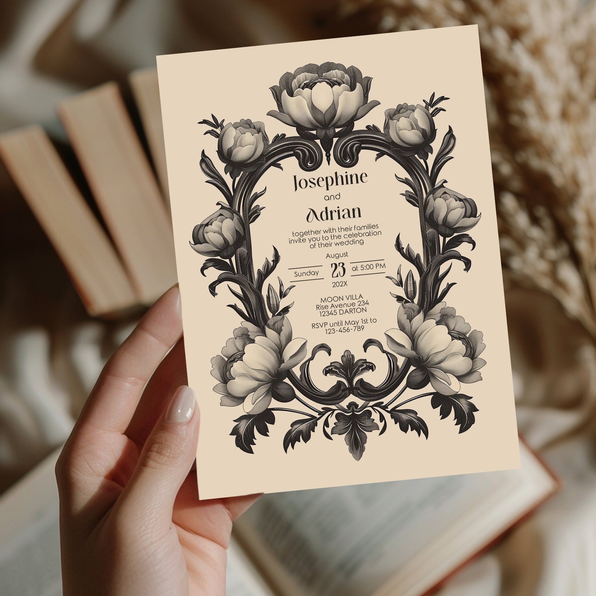 Dark Baroque Wedding Invitation Set - Vintage Beige Floral Design, Black Frame, Editable 8 items