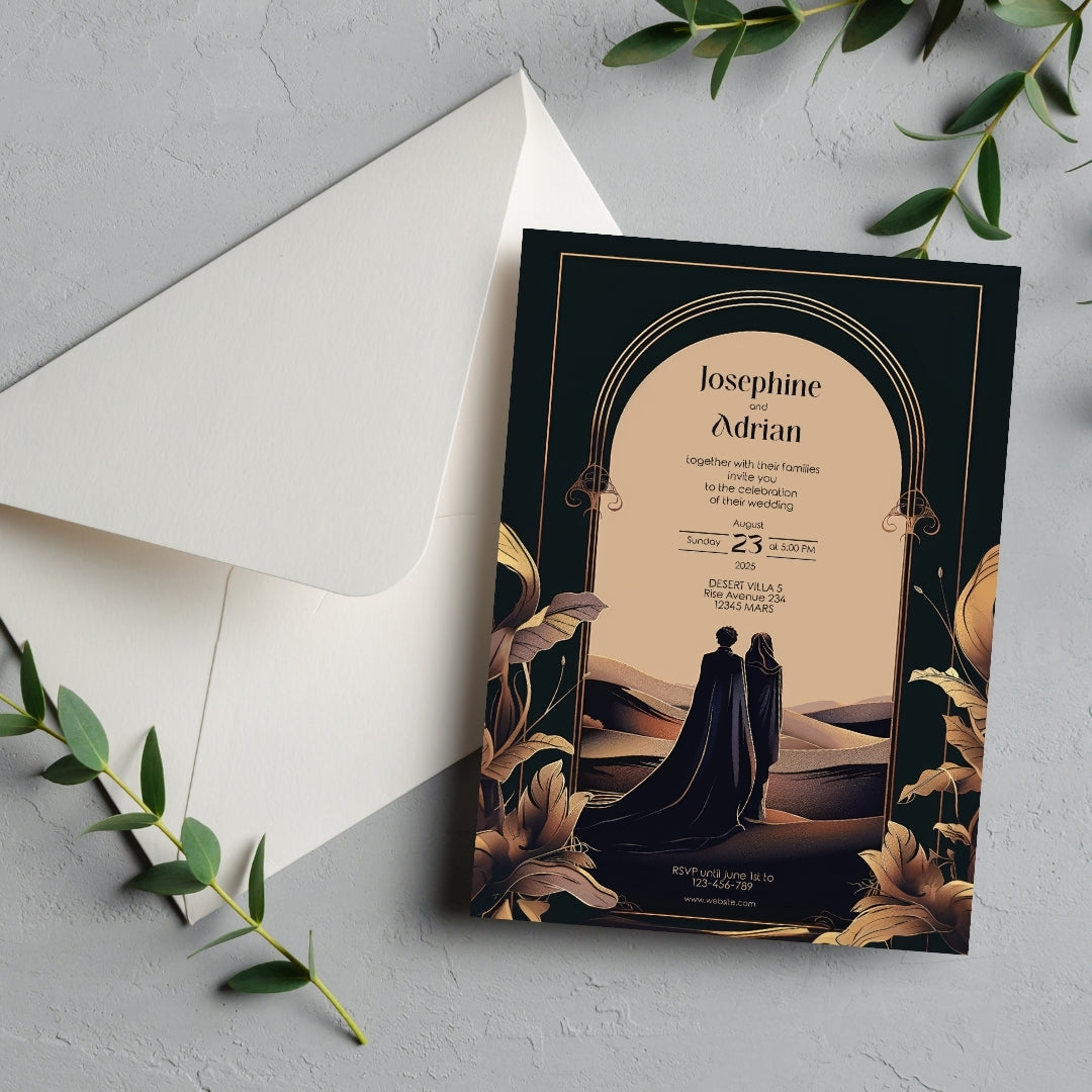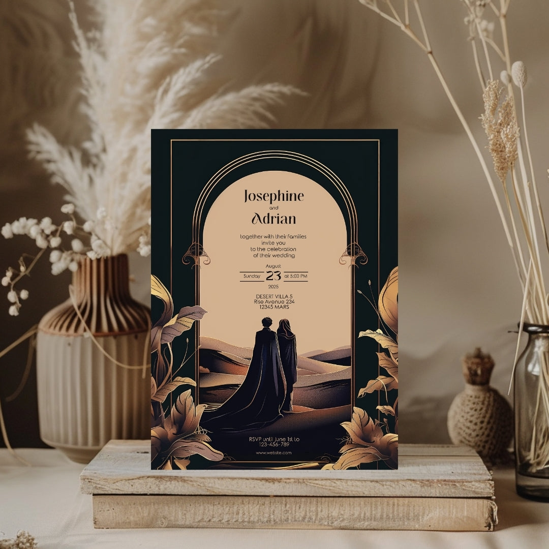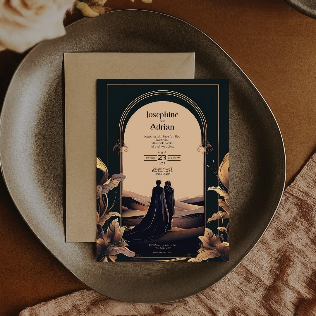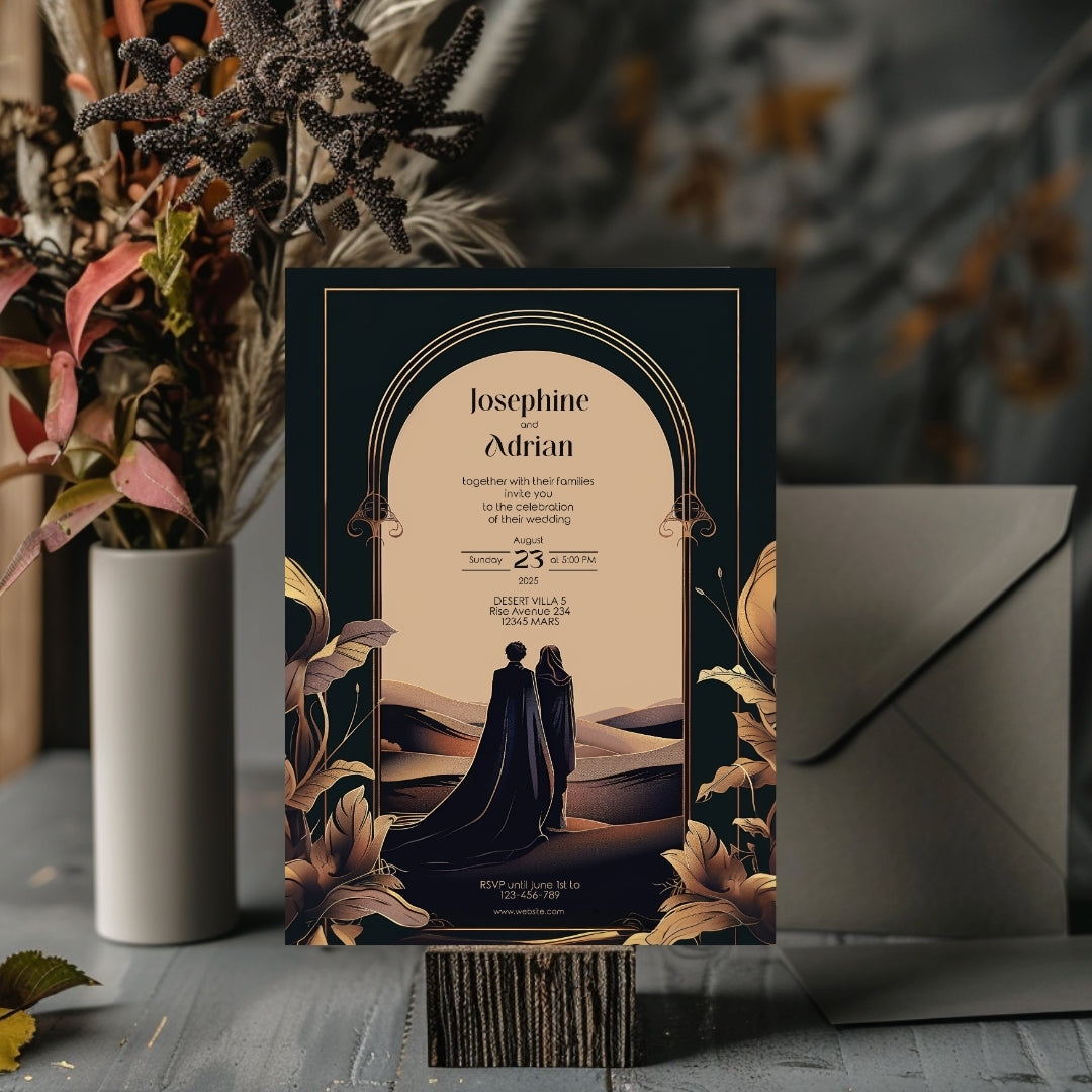 Step into a world where the mystique of a dark Oriental desert meets the classic sophistication of Art Nouveau. This Beige & Black Arch Invitation is your portal to an unforgettable event, whether it's a wedding under the stars, a birthday on the dunes, or an anniversary that echoes the grandeur of epics like 'Dune'. Be a desert princess, celebrate like an emperor! Its unique design blends sweeping floral artistry with the strong, elegant lines of an arch, all rendered in the serene hues of a desert at dusk. The customizable digital template can be edited easily on Corjl, allowing you to print it yourself or send it as a stylish digital invite directly from your phone.