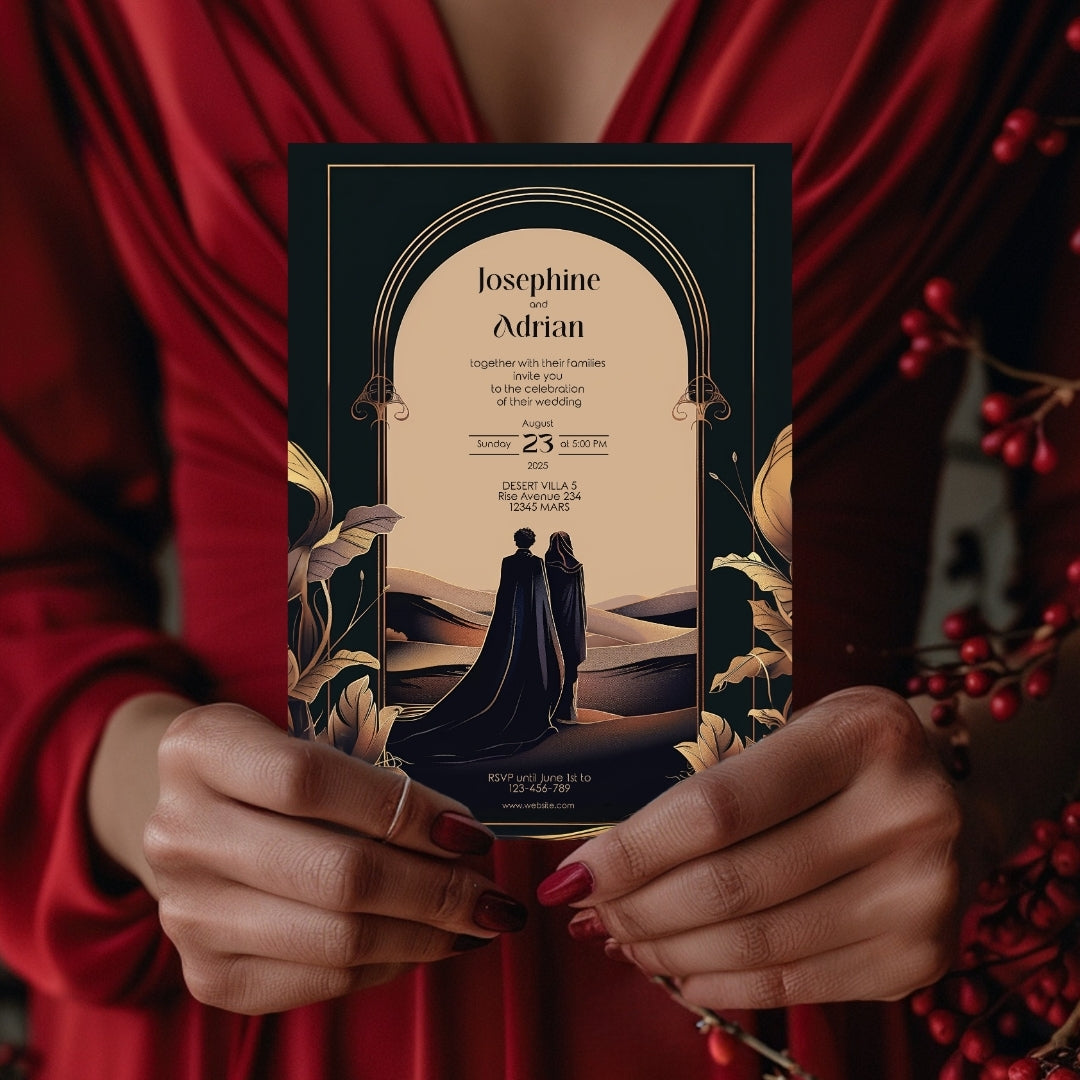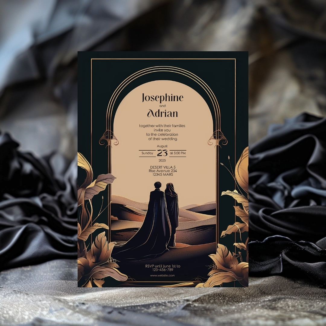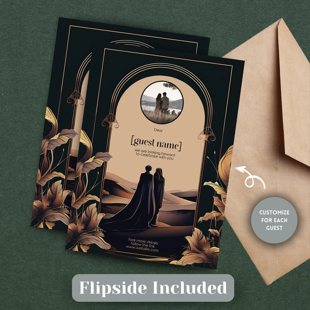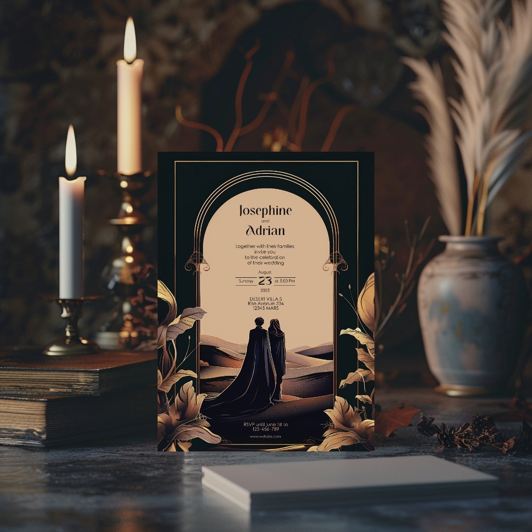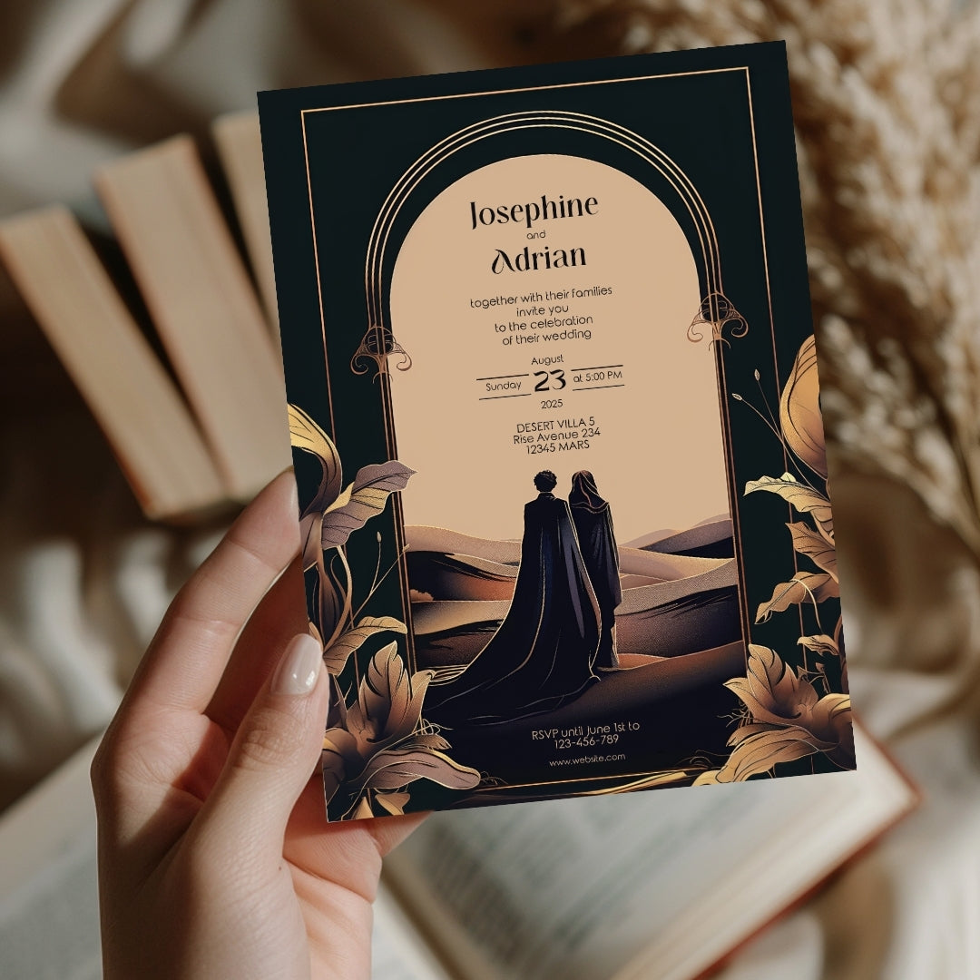 Step into a world where the mystique of a dark Oriental desert meets the classic sophistication of Art Nouveau. This Beige & Black Arch Invitation is your portal to an unforgettable event, whether it's a wedding under the stars, a birthday on the dunes, or an anniversary that echoes the grandeur of epics like 'Dune'. Be a desert princess, celebrate like an emperor! Its unique design blends sweeping floral artistry with the strong, elegant lines of an arch, all rendered in the serene hues of a desert at dusk. The customizable digital template can be edited easily on Corjl, allowing you to print it yourself or send it as a stylish digital invite directly from your phone.