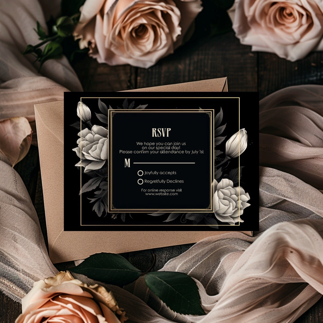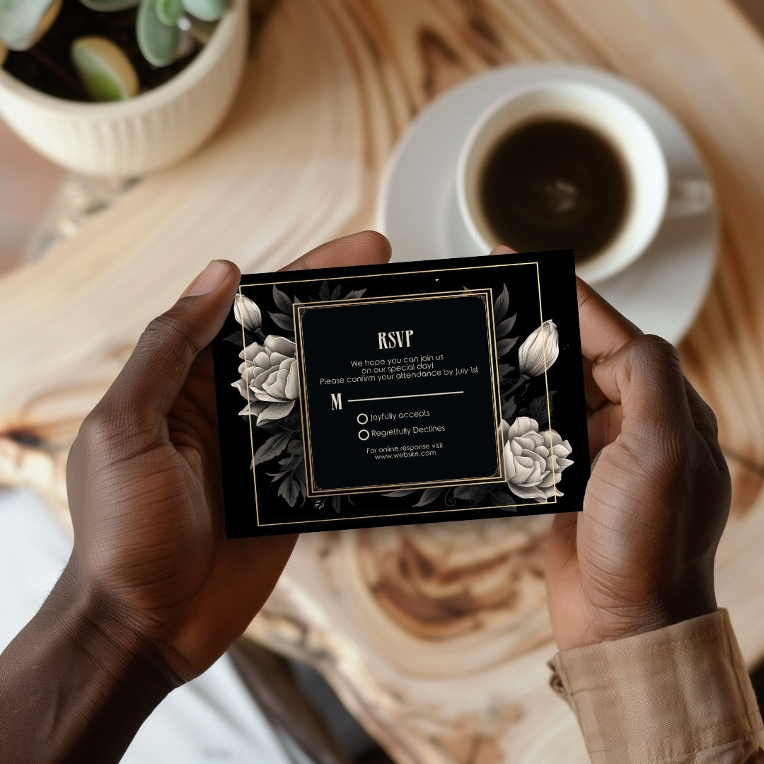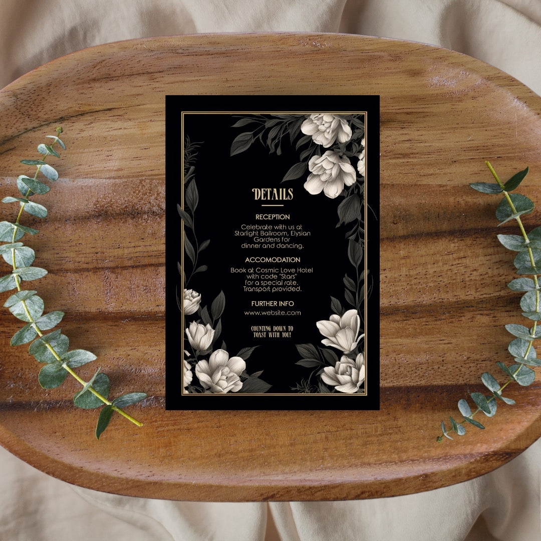 Dark Elegant Floral Wedding Invitation Set - 5x7 Invitation, 4x6 Details, 3.5.x5 RSVP