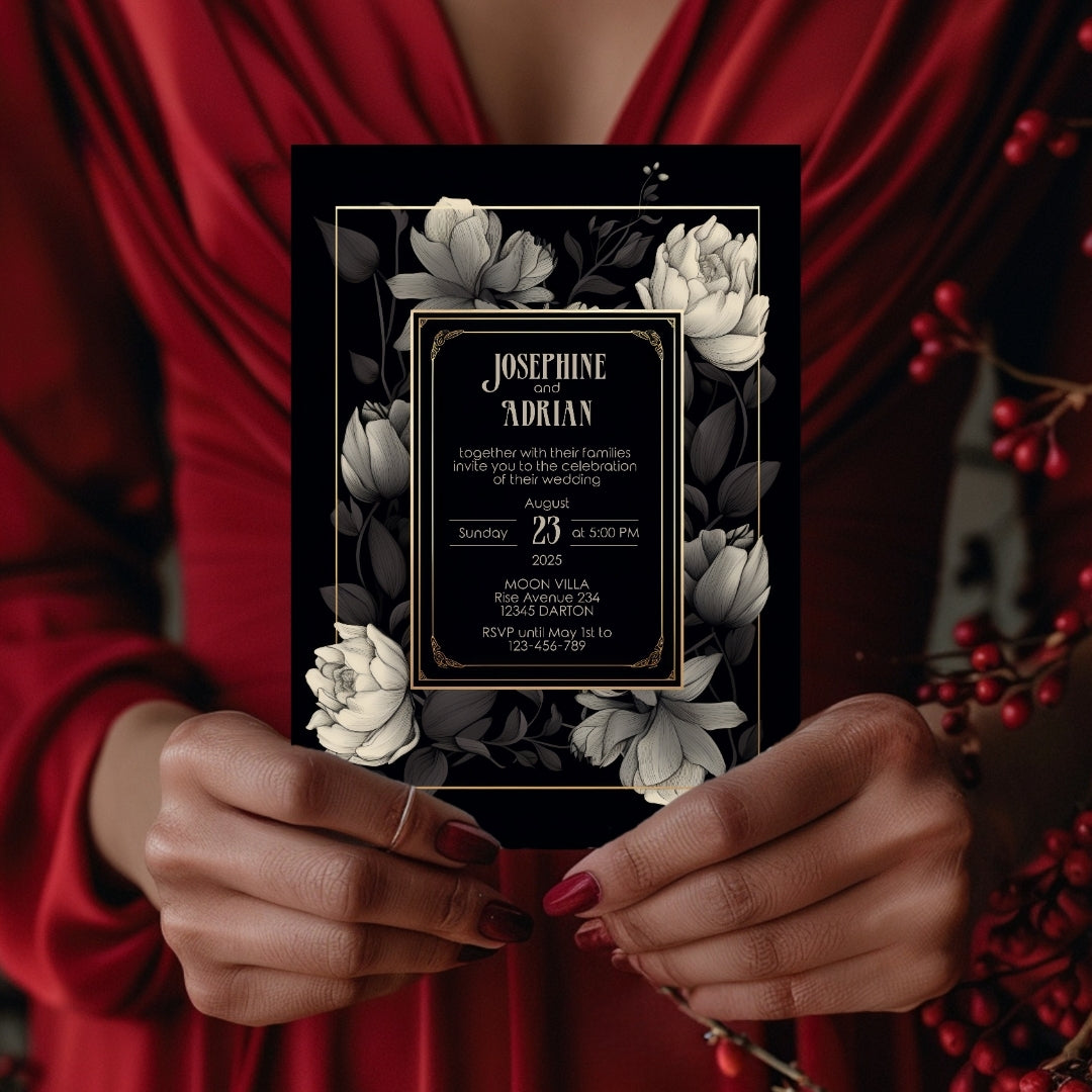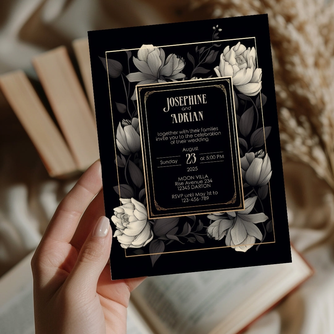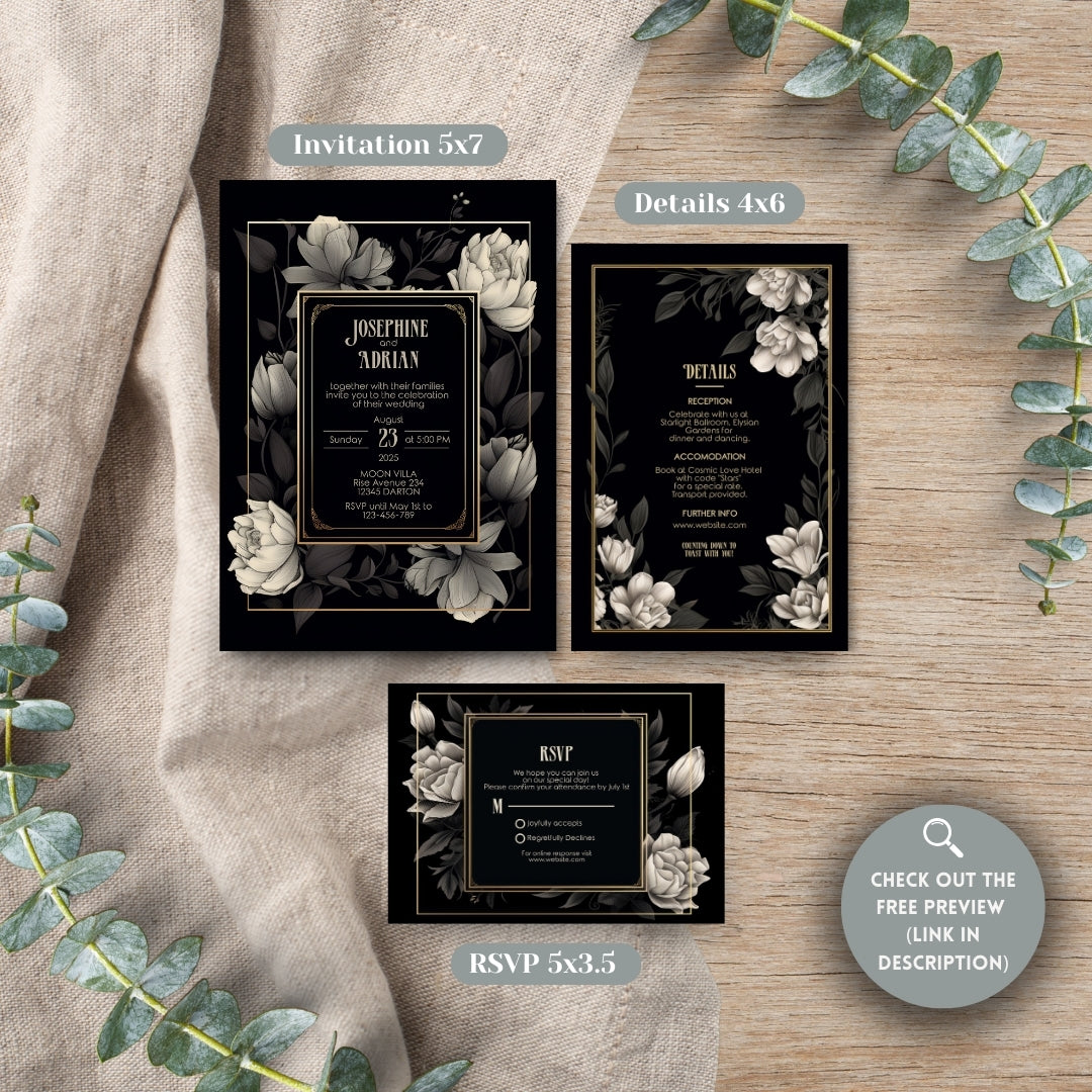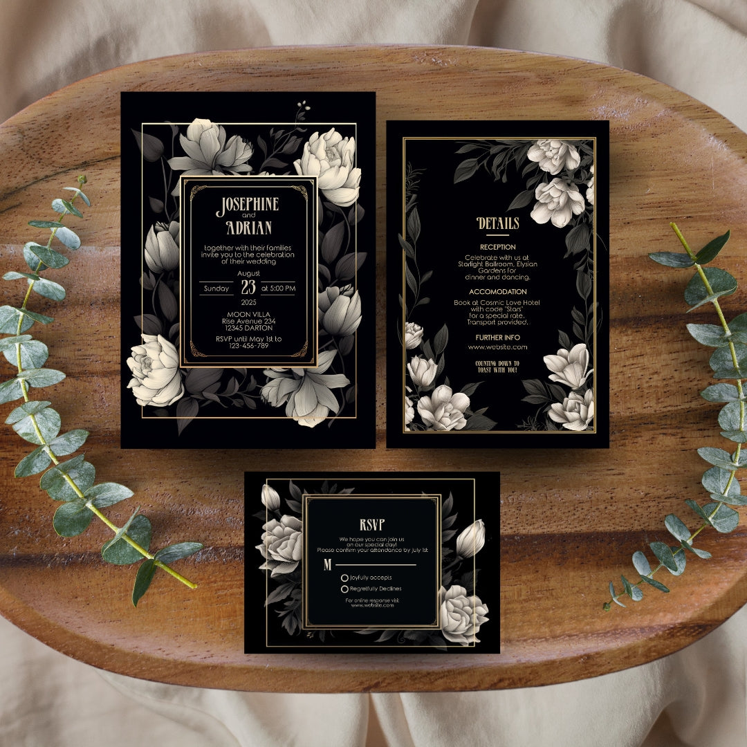 ✨ Elevate Your Event with our Dark Botanical Floral Invitation Set! This elegant and customizable digital template set includes a 5x7 invitation, a 4x6 details card, and a 5x3.5 RSVP card, perfect for weddings, birthdays, anniversaries, or any special celebration. Featuring detailed white floral designs on a rich dark background, this invitation set exudes sophistication and elegance. ✨