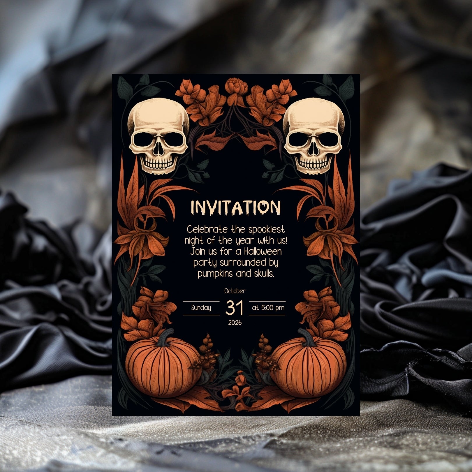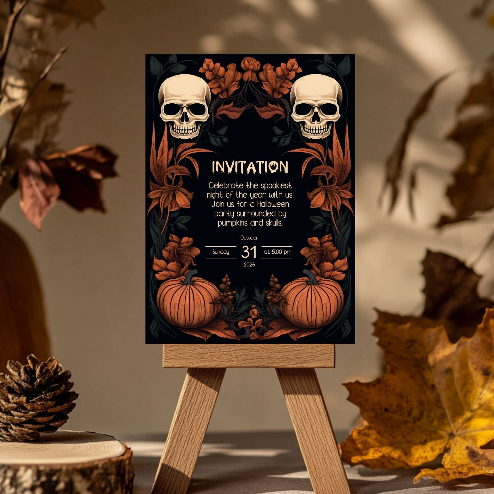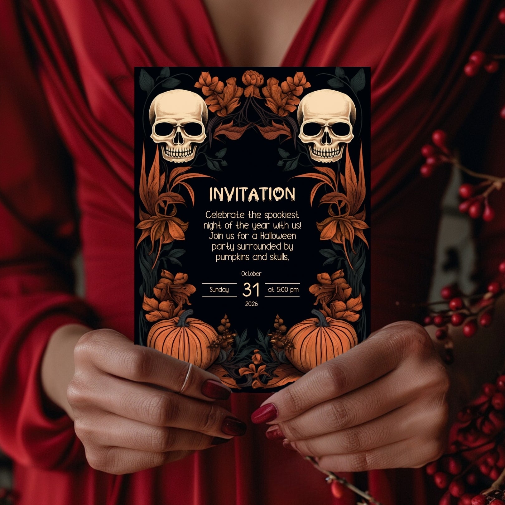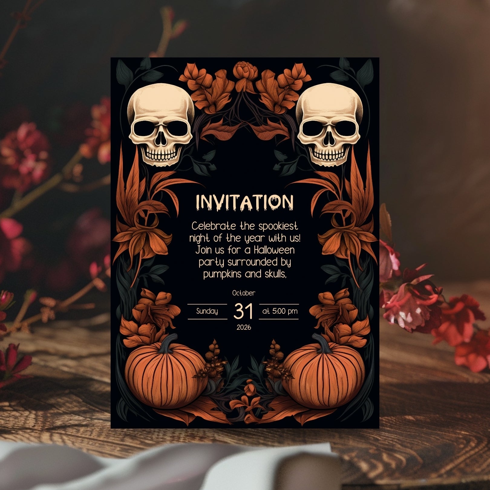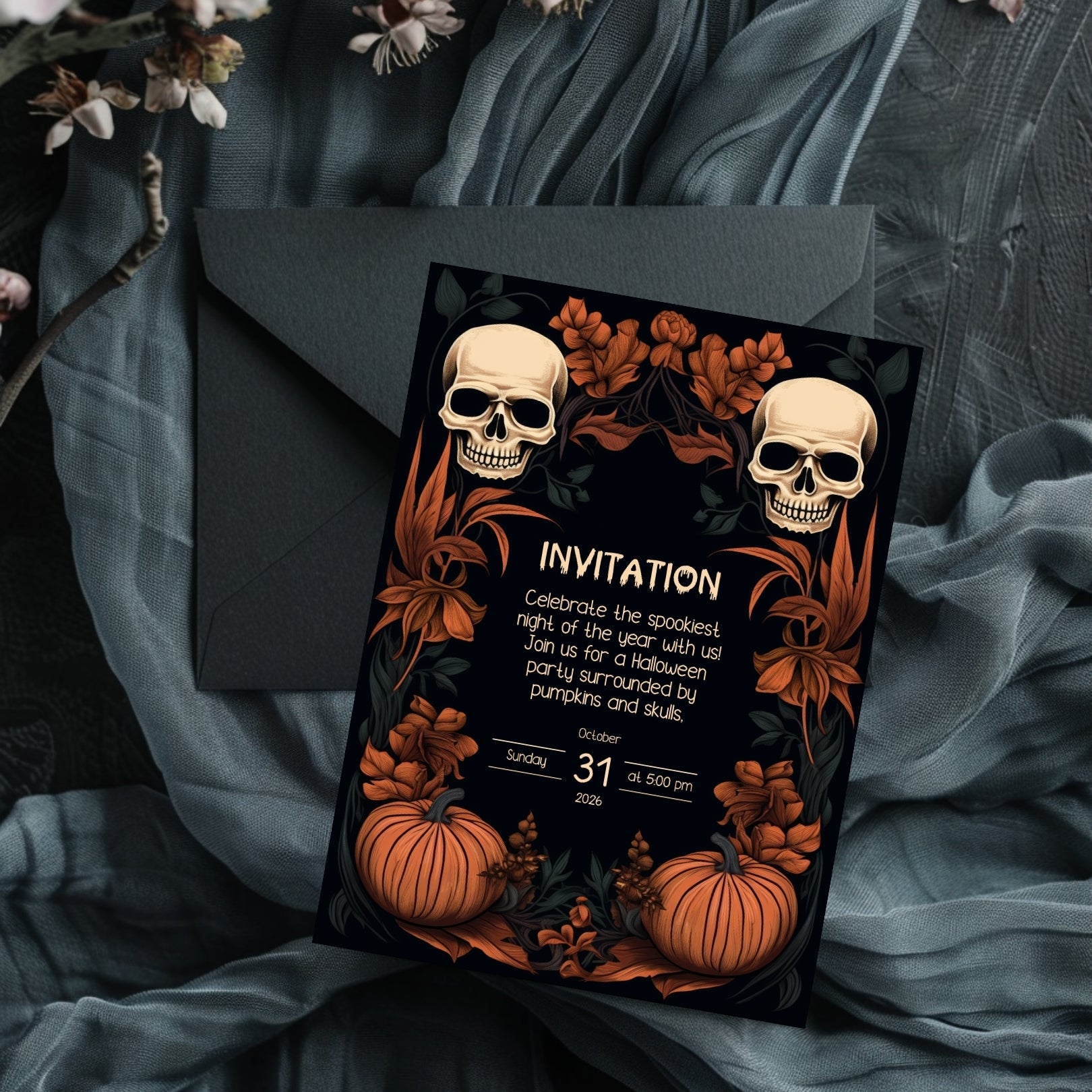 ✔️𝙎𝙩𝙪𝙣𝙣𝙞𝙣𝙜 𝘿𝙚𝙨𝙞𝙜𝙣: This invitation combines gothic elements with the warmth of the autumn harvest, featuring skulls, pumpkins, and vibrant flowers against a deep black background. The detailed design and rich color palette create a visually captivating piece perfect for any Halloween event.