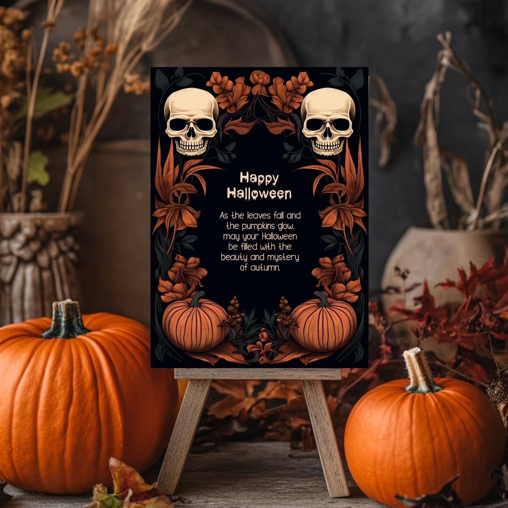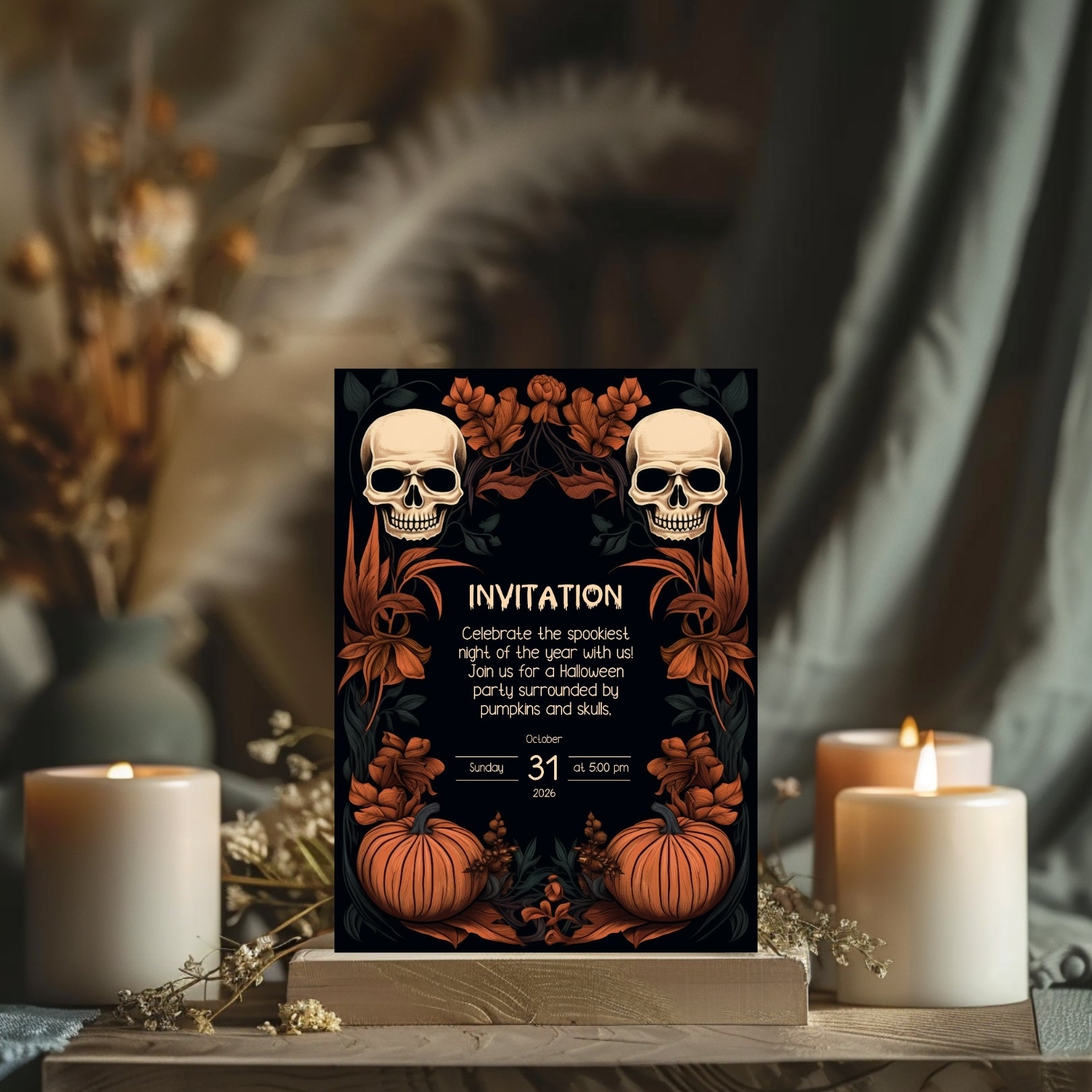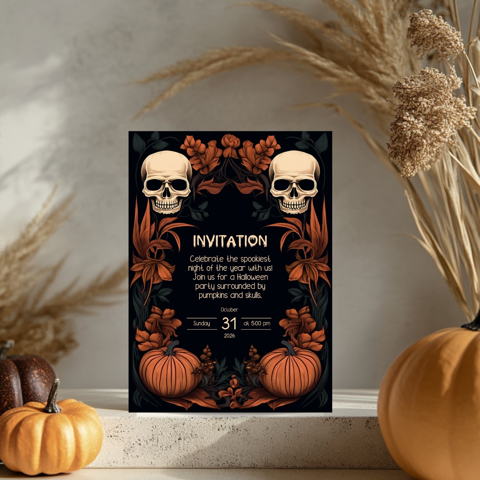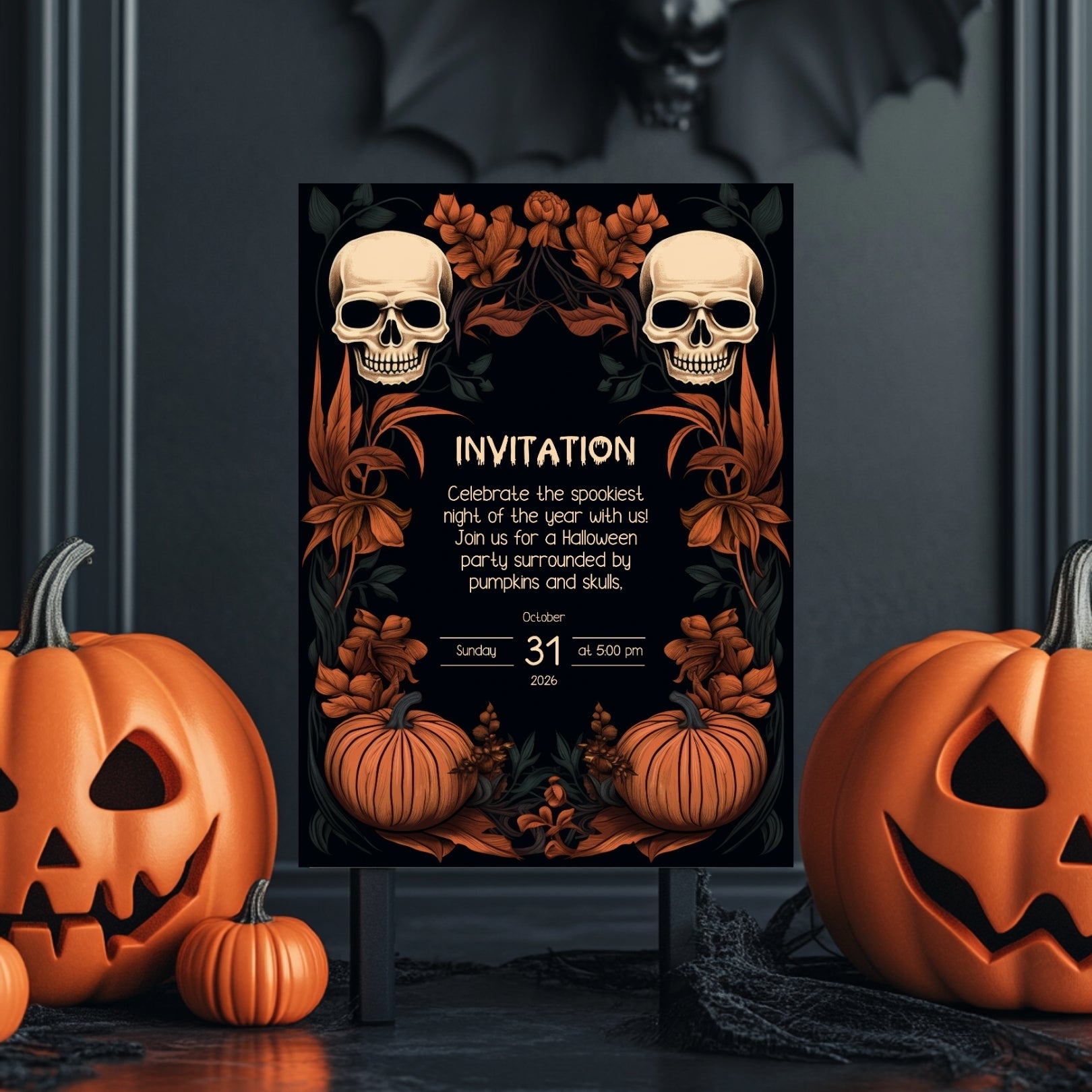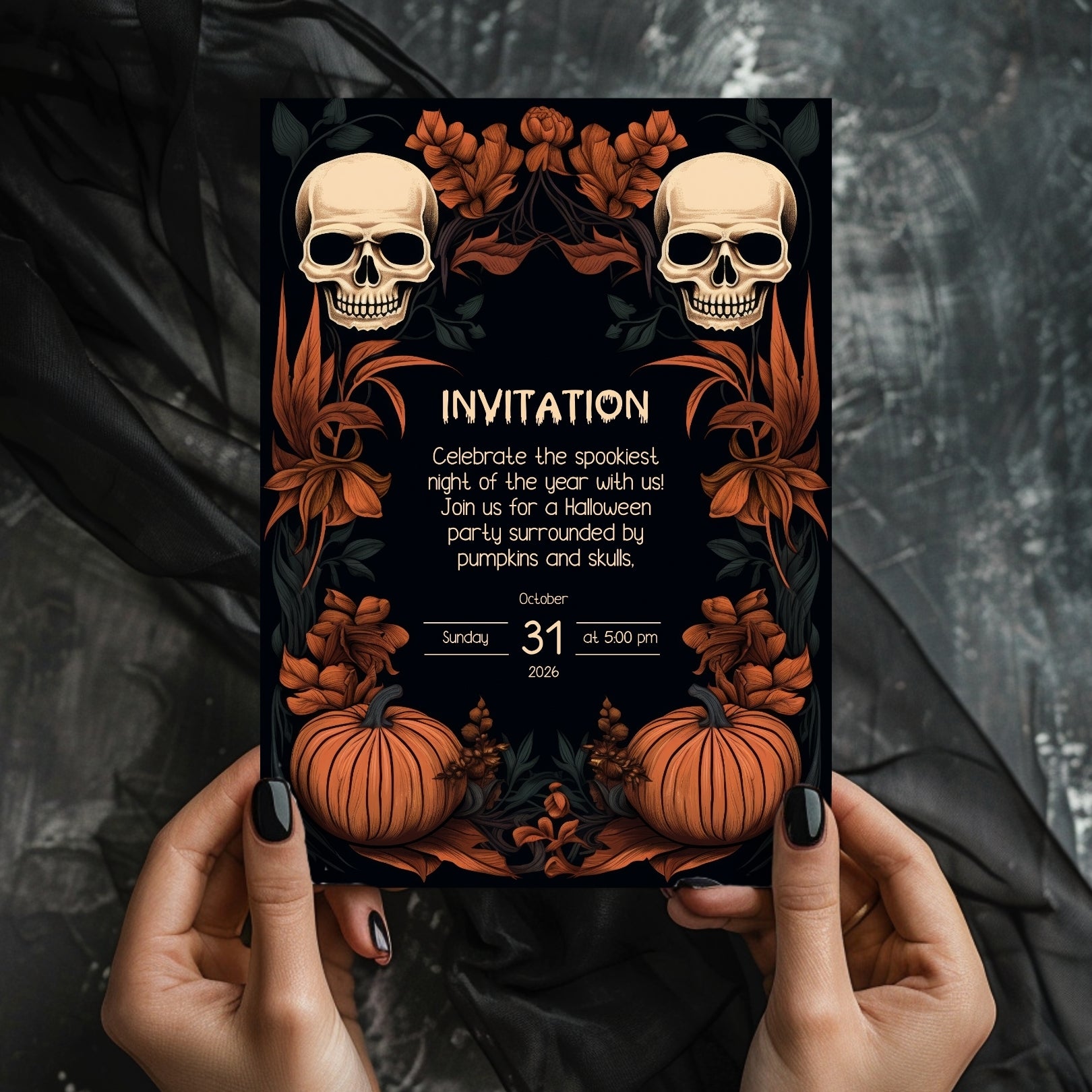✔️𝙎𝙩𝙪𝙣𝙣𝙞𝙣𝙜 𝘿𝙚𝙨𝙞𝙜𝙣: This invitation combines gothic elements with the warmth of the autumn harvest, featuring skulls, pumpkins, and vibrant flowers against a deep black background. The detailed design and rich color palette create a visually captivating piece perfect for any Halloween event.