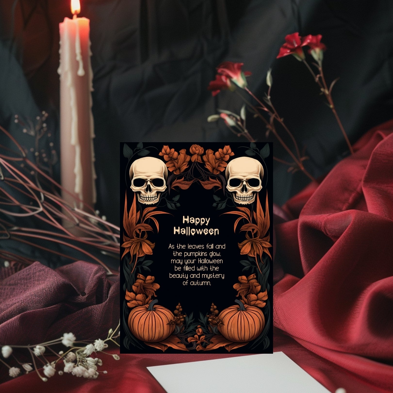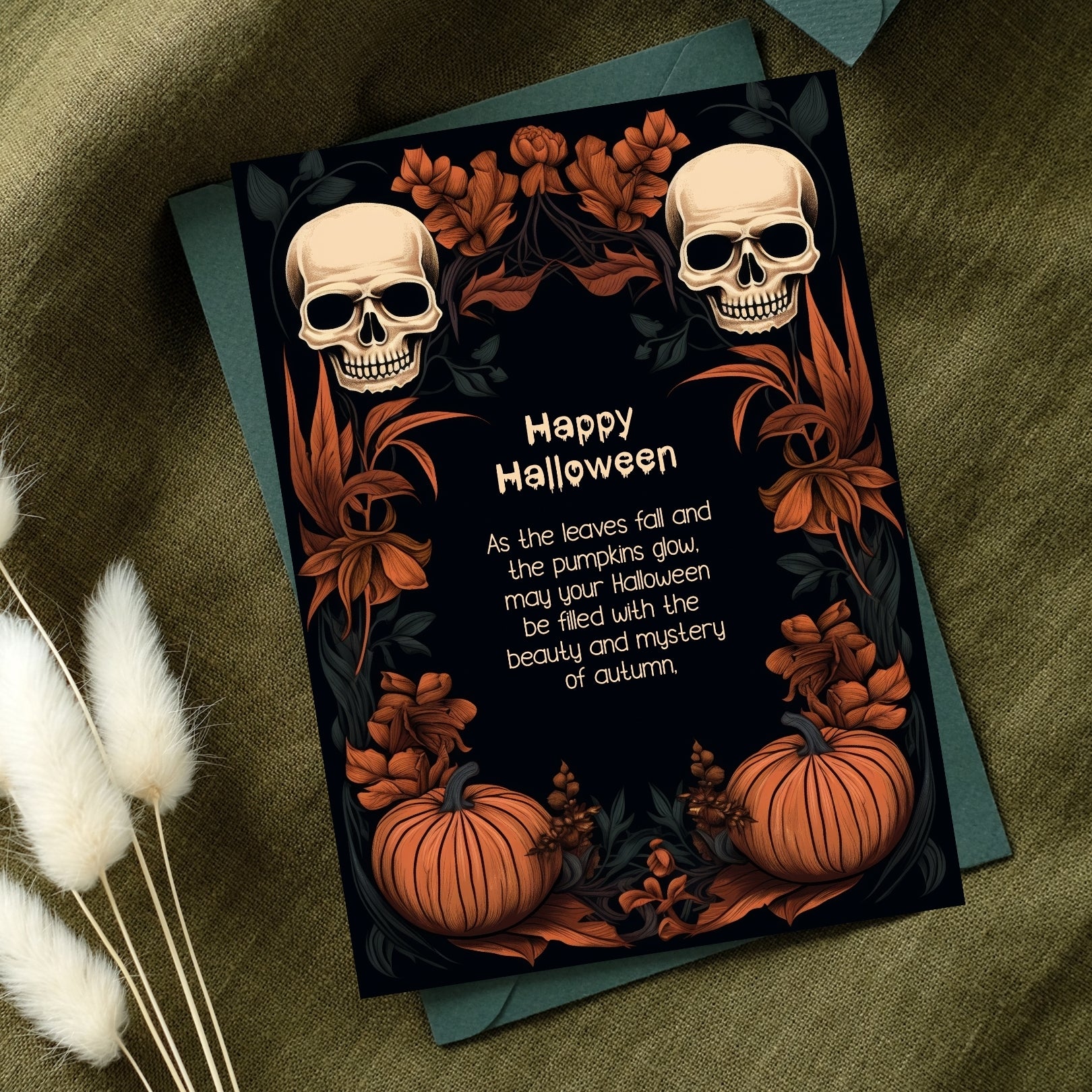 Invite your guests to a Halloween celebration filled with the beauty and mystery of autumn with this Gothic Harvest Halloween Invitation. Featuring a striking design with skulls and pumpkins surrounded by vibrant orange flowers and dark green vines, this invitation perfectly captures the spirit of the season. Whether you're hosting a Halloween party or sending seasonal greetings, this card sets the tone for an elegant and slightly eerie gathering.