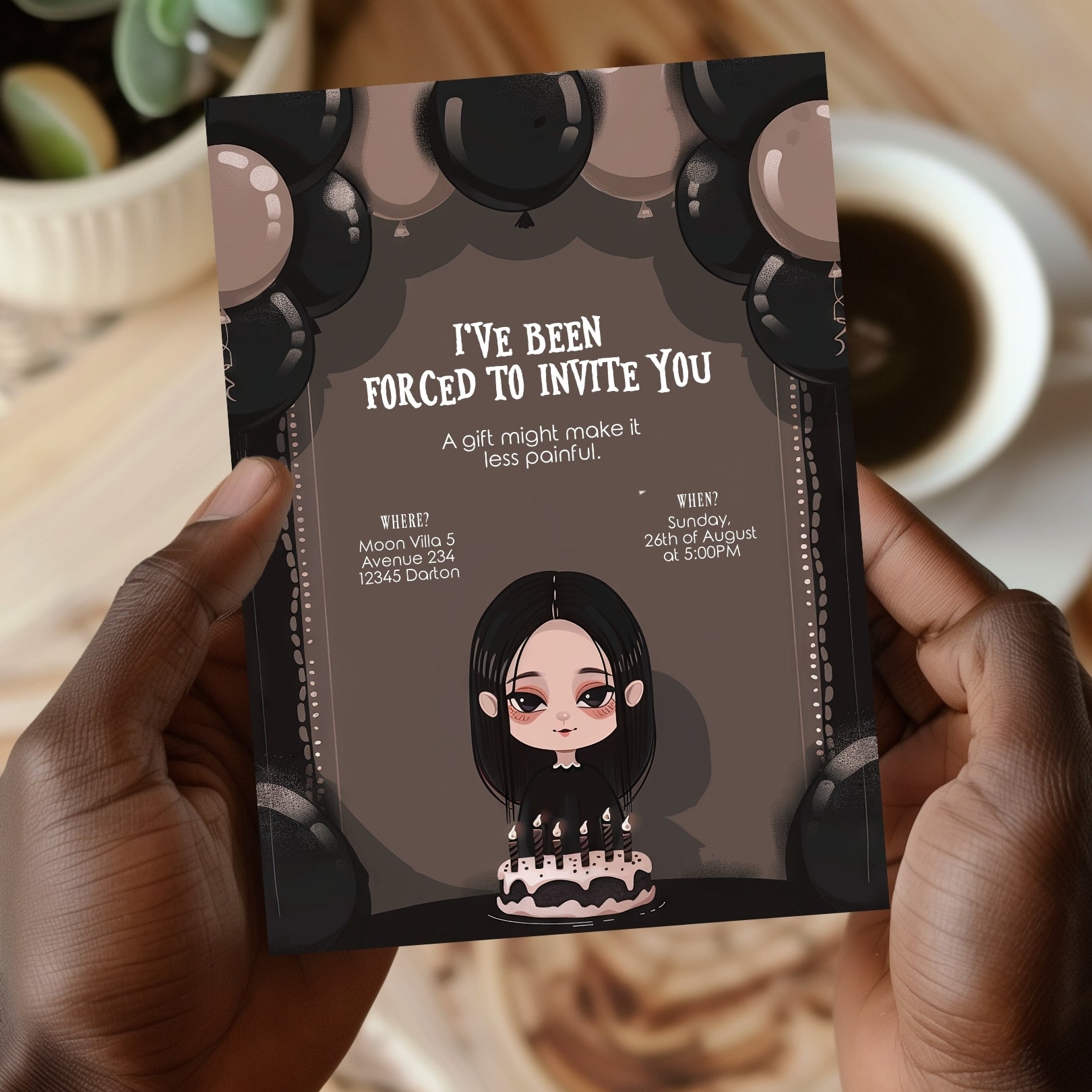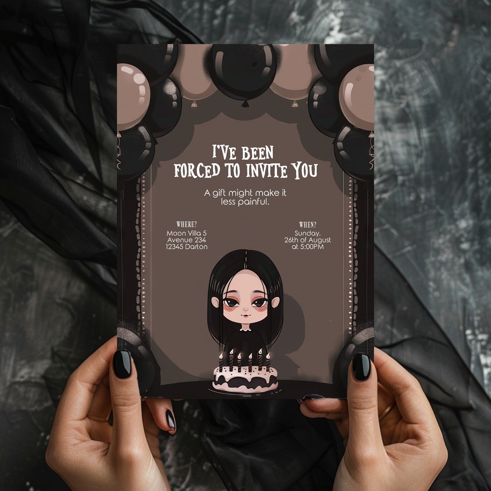 ✔️𝙎𝙩𝙪𝙣𝙣𝙞𝙣𝙜 𝘿𝙚𝙨𝙞𝙜𝙣: With a minimalist color palette of black, gray, and beige, this invitation features a young gothic character, perfectly capturing a darkly charming aesthetic. Ideal for anyone looking to bring a unique and mysterious touch to their birthday party.