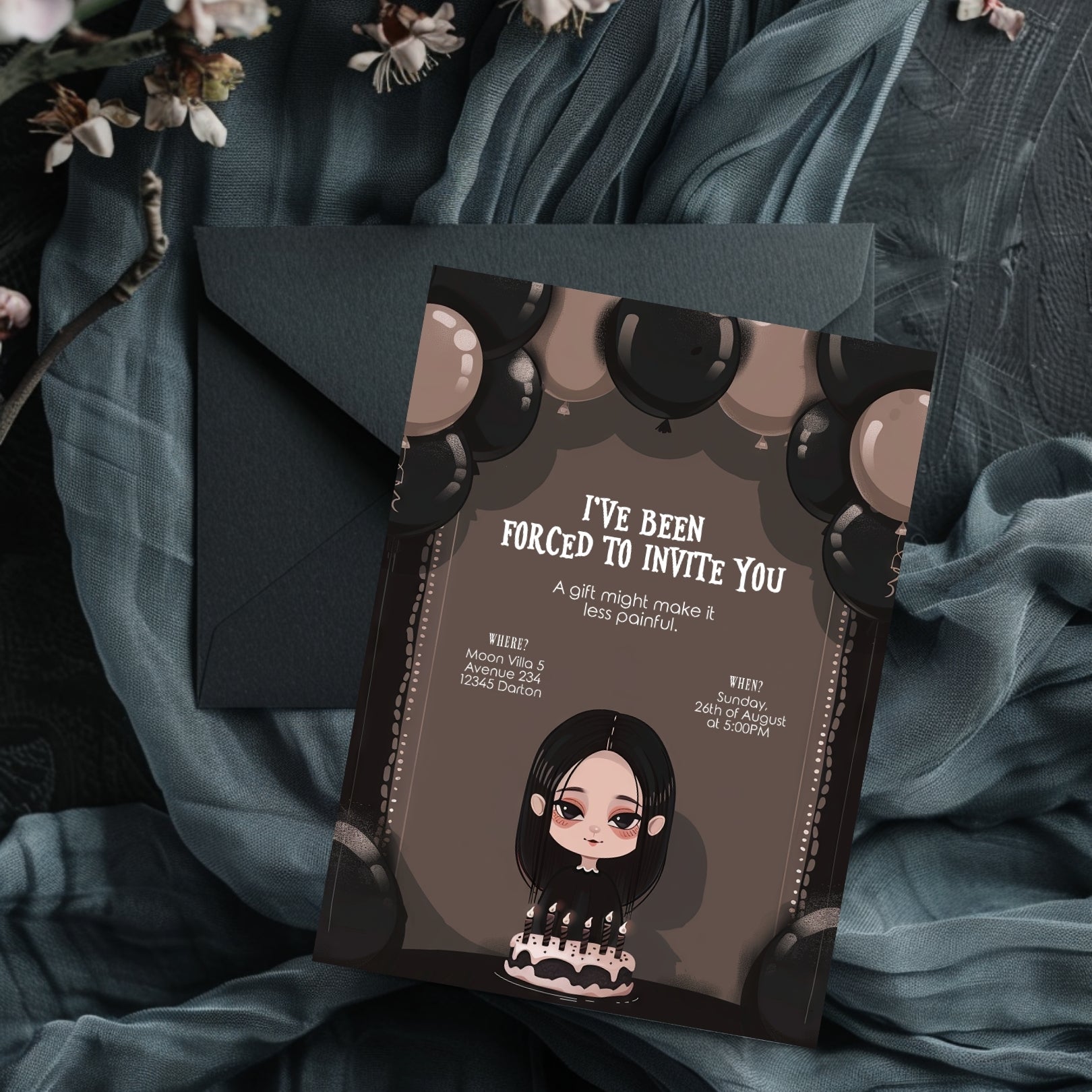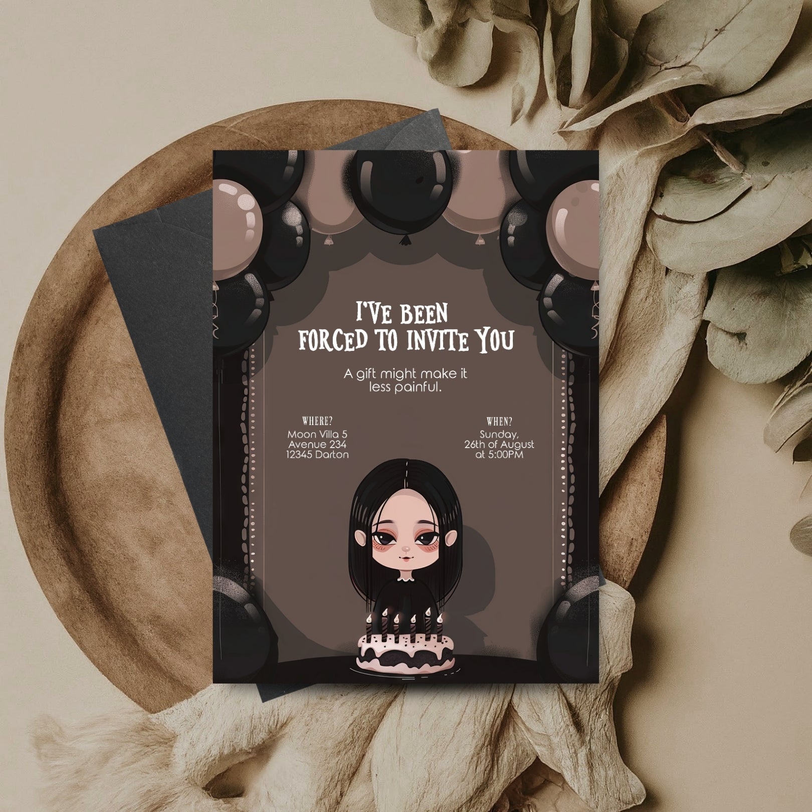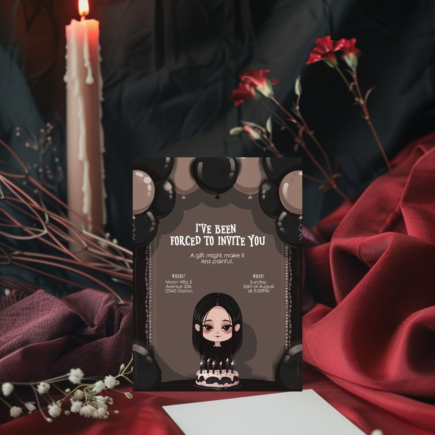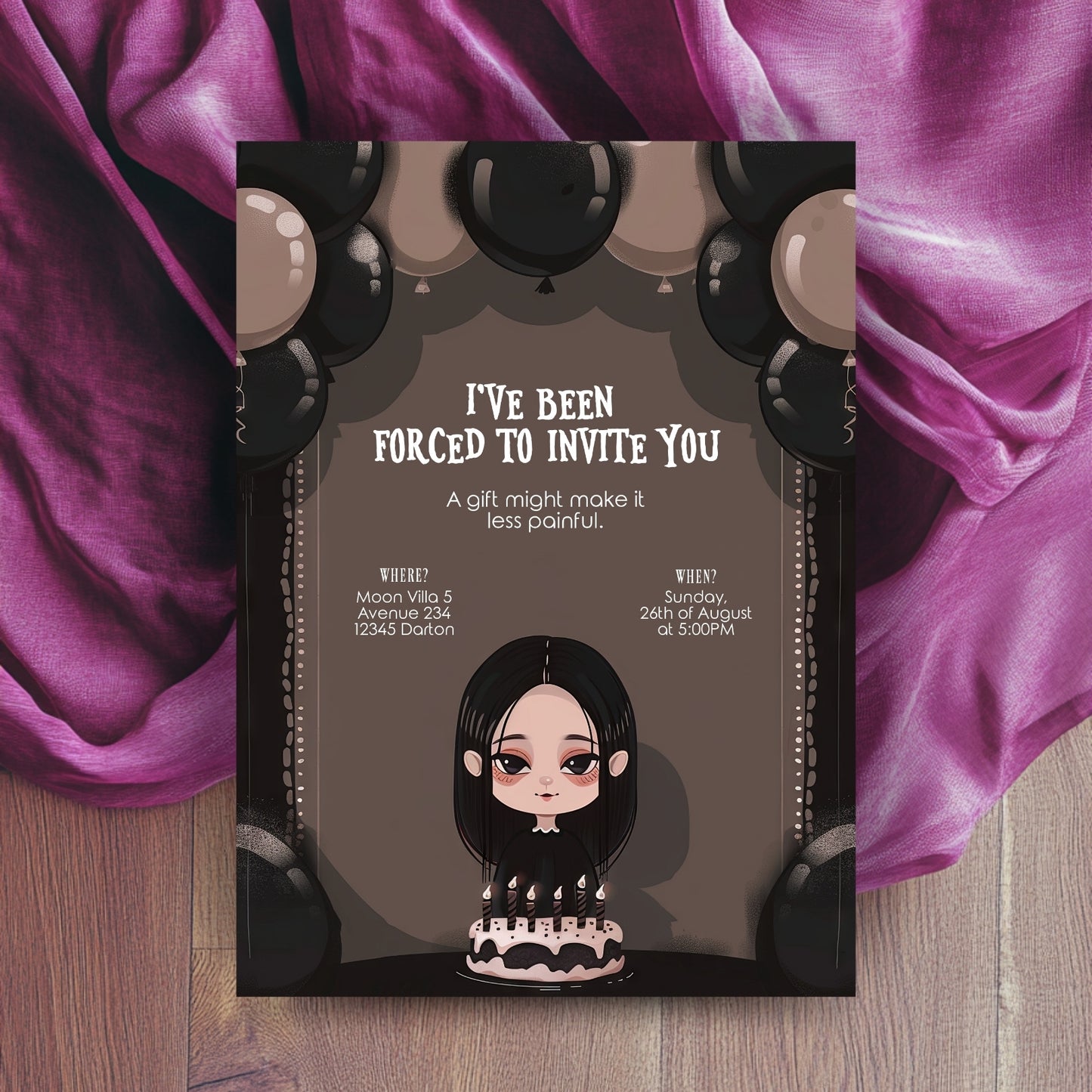 For those with a love of all things dark and quirky, this Dark Gothic Girl Birthday Invitation is perfect. Featuring a young, deadpan character with straight black hair, dressed in all-black, the invitation sets a moody yet playful tone with the text “I’ve Been Forced to Invite You.” The muted black and gray tones, paired with gothic details like black balloons and candles, make this the ideal invite for those who appreciate a little macabre charm on their special day.