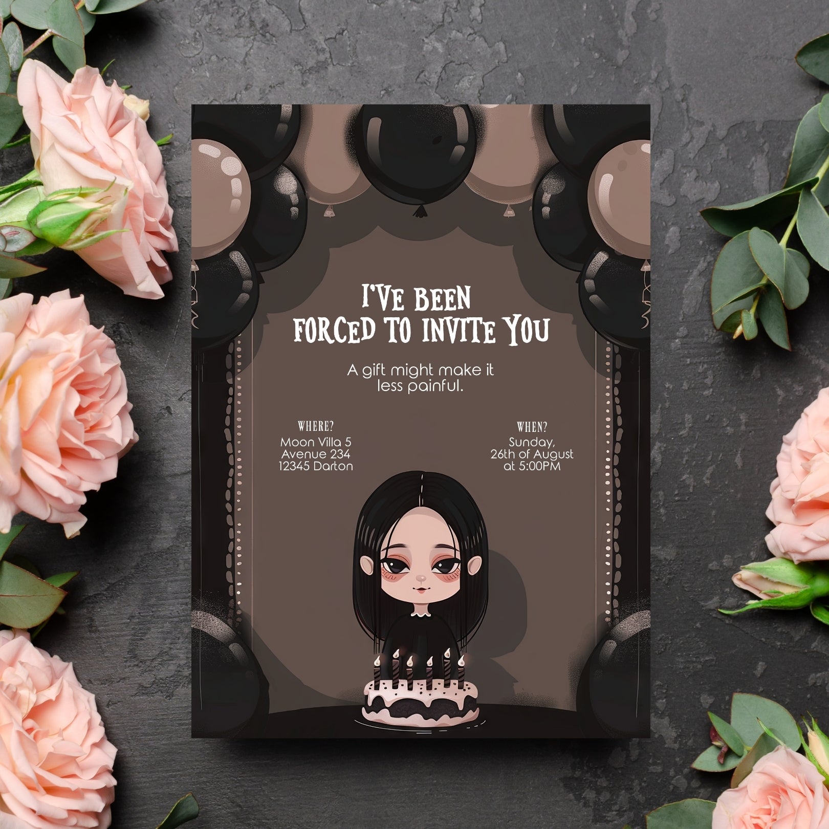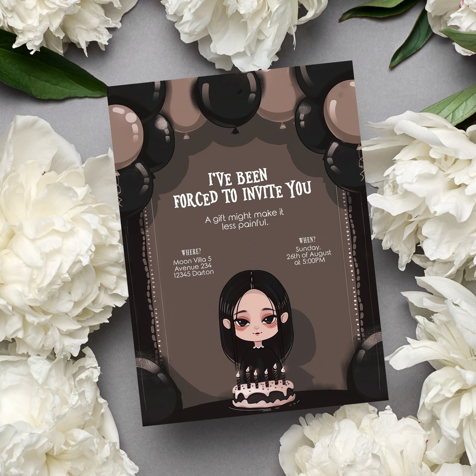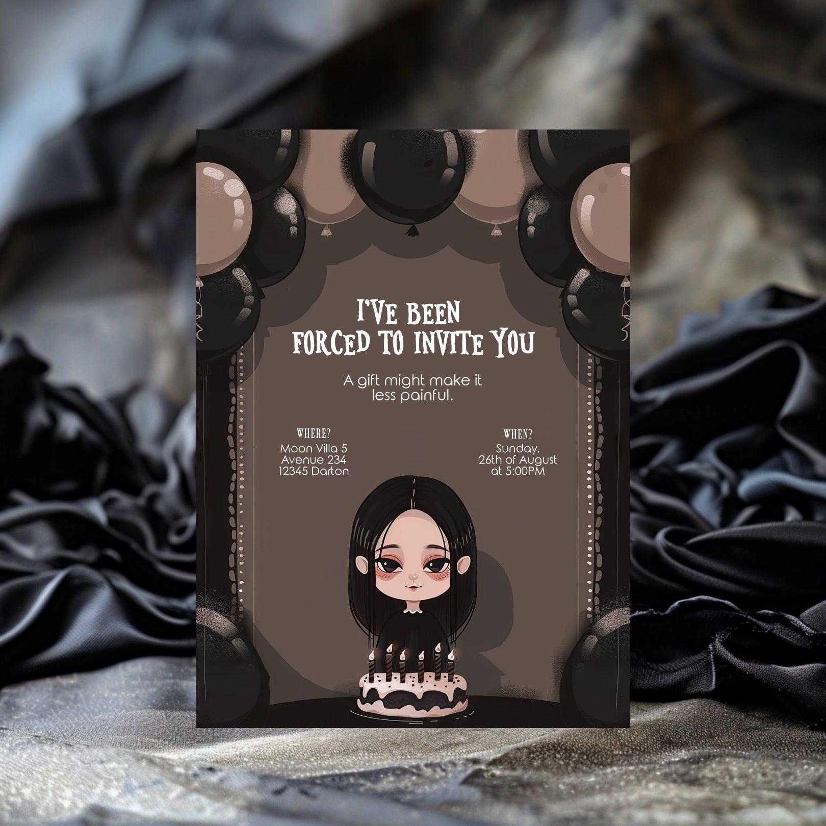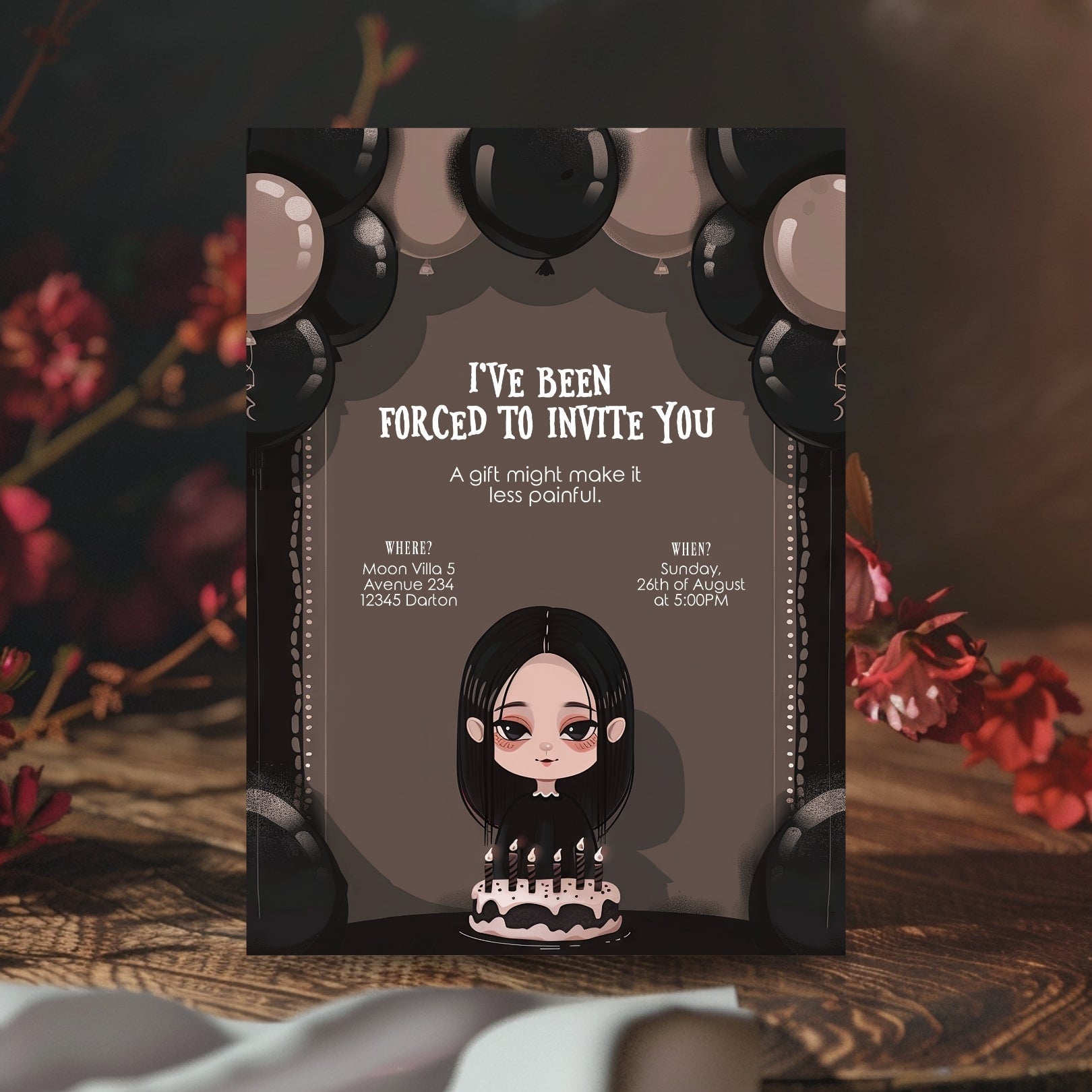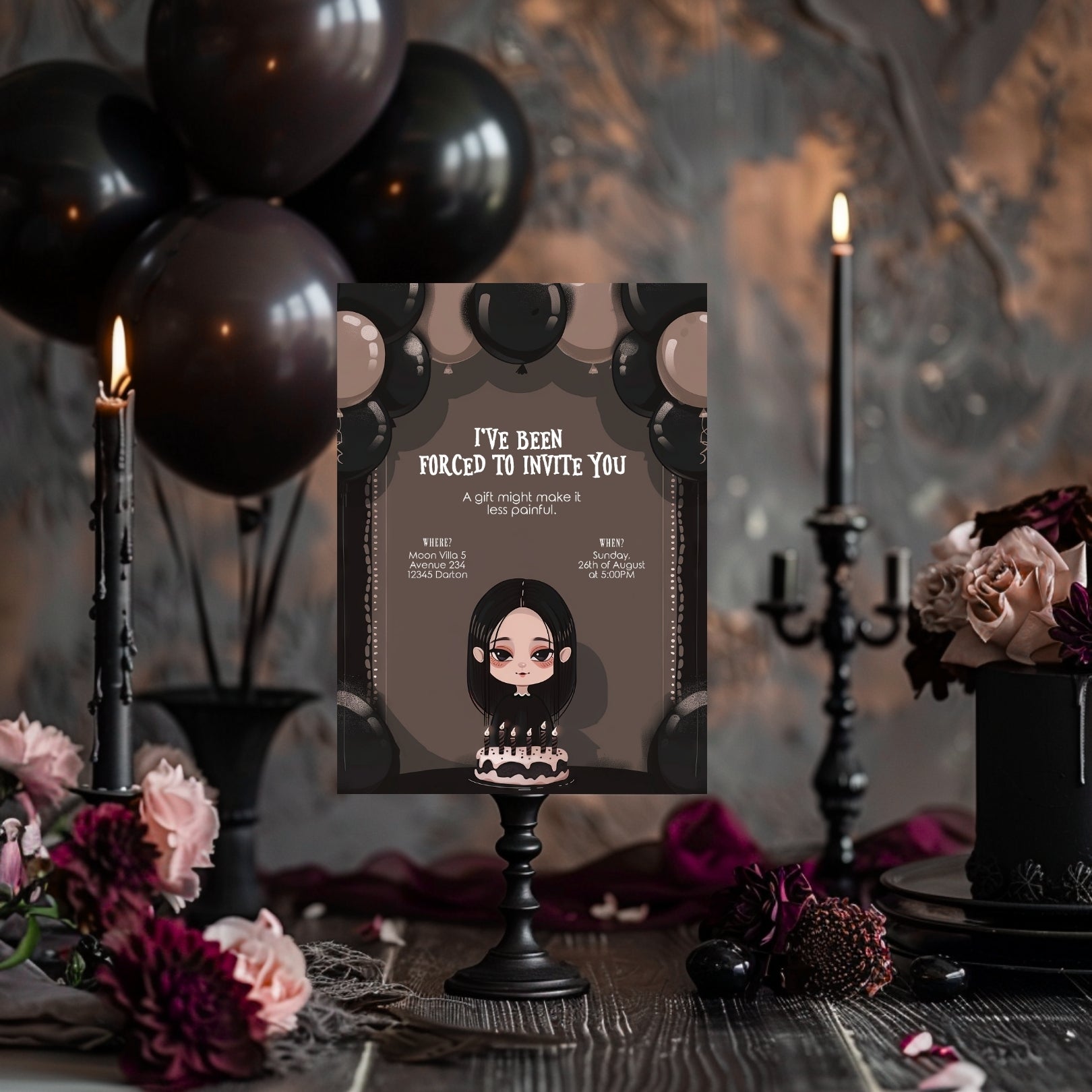 For those with a love of all things dark and quirky, this Dark Gothic Girl Birthday Invitation is perfect. Featuring a young, deadpan character with straight black hair, dressed in all-black, the invitation sets a moody yet playful tone with the text “I’ve Been Forced to Invite You.” The muted black and gray tones, paired with gothic details like black balloons and candles, make this the ideal invite for those who appreciate a little macabre charm on their special day.