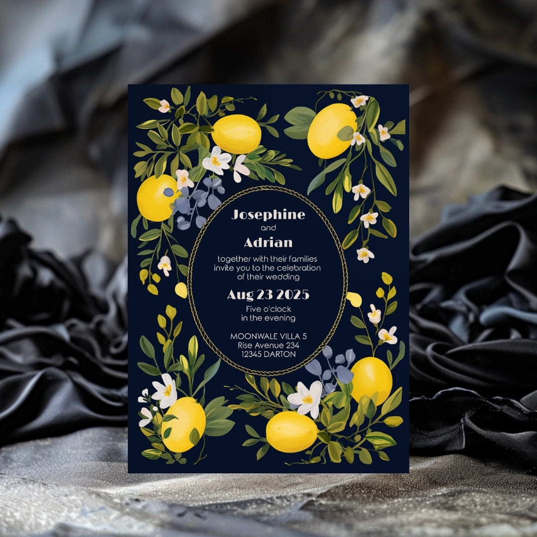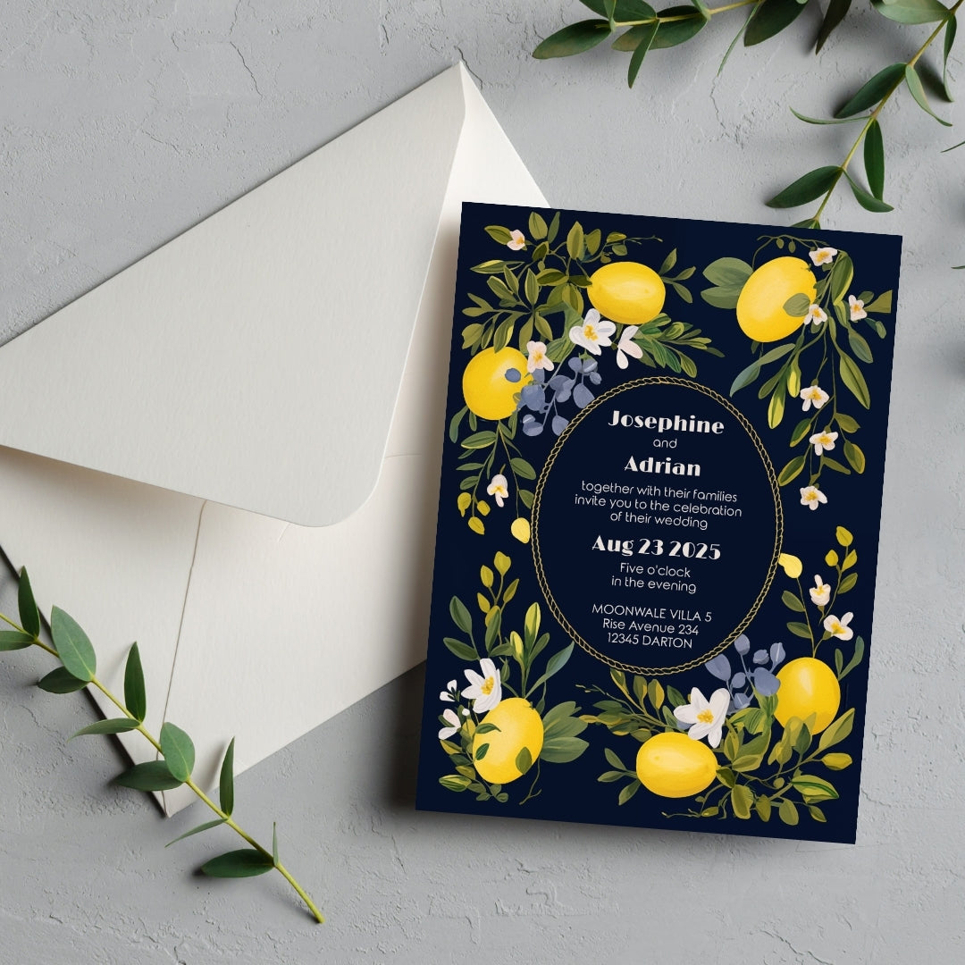 Savor the zest of life's celebrations with our Mediterranean Citrus Invitation. Bright lemons and lush greenery combined with dark elegance set the stage for any joyous occasion—be it your sun-kissed wedding, a vibrant bridal shower, or a lively summer soirée - perfect for your parties and special occasions.
