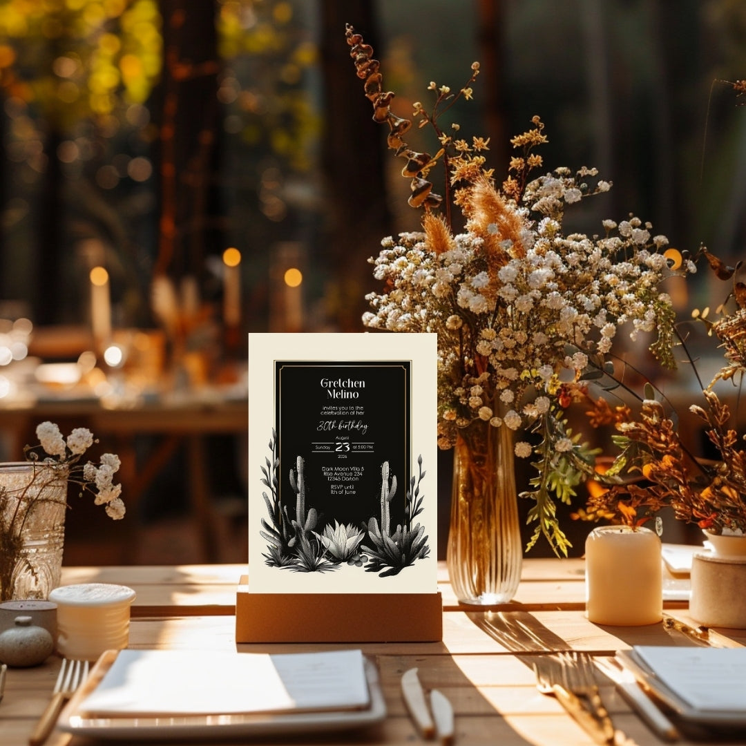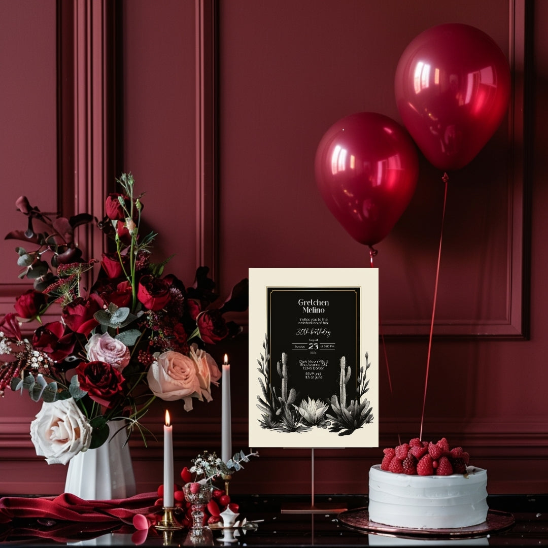 Celebrate your special day with our Elegant Desert Bohemian Birthday Invitation. Featuring a dramatic black background with white botanical illustrations and a cream border, this invitation is perfect for creating unforgettable moments. The minimalist design with cacti motifs offers a unique and elegant look, ideal for those who appreciate refined aesthetics.