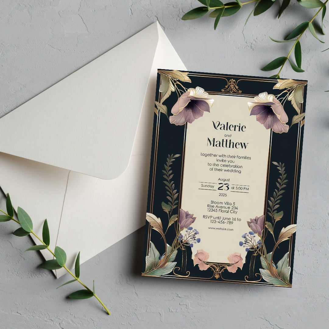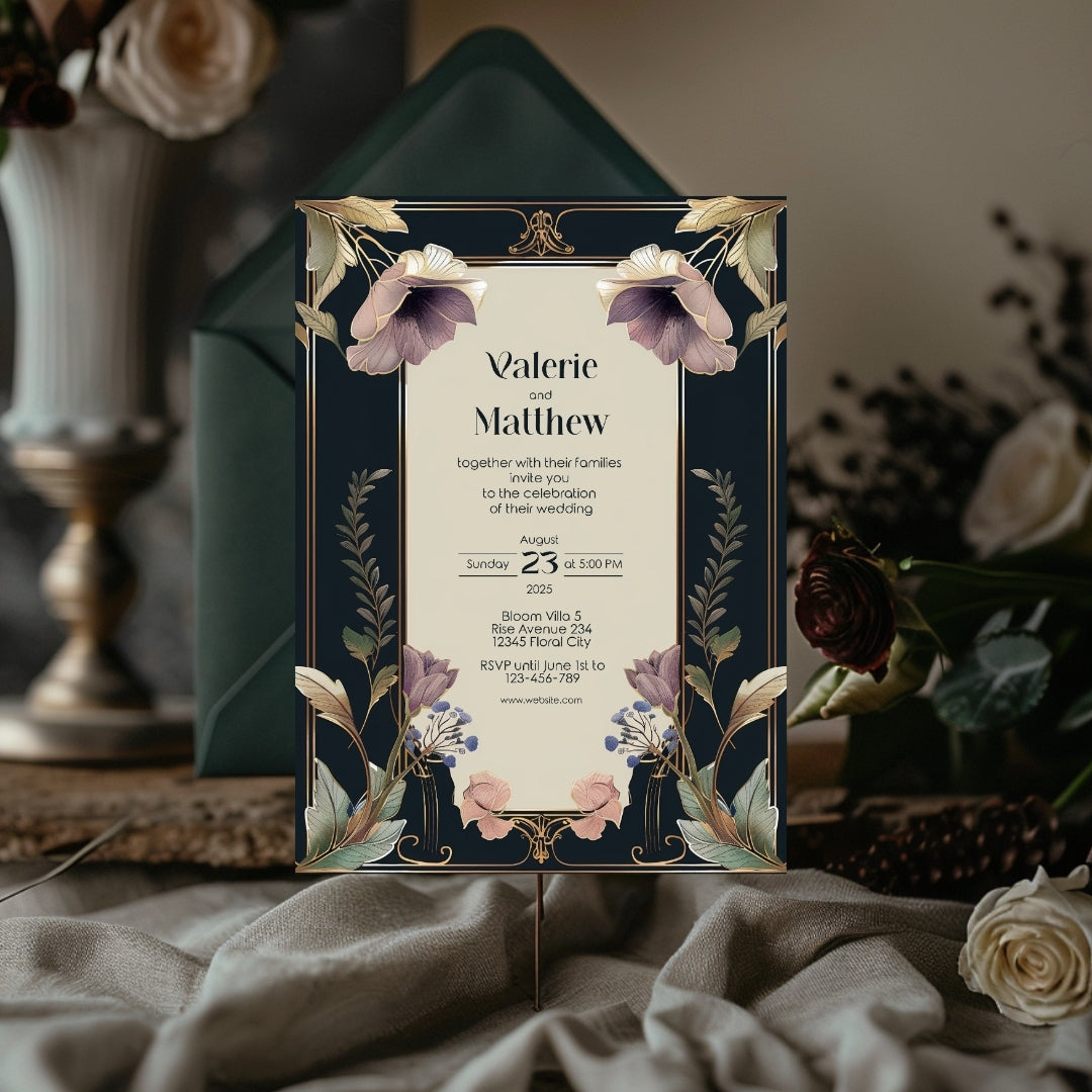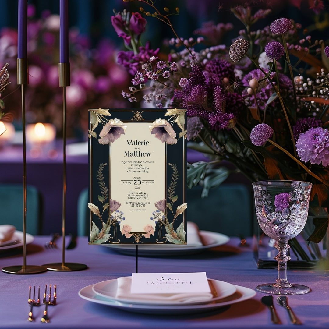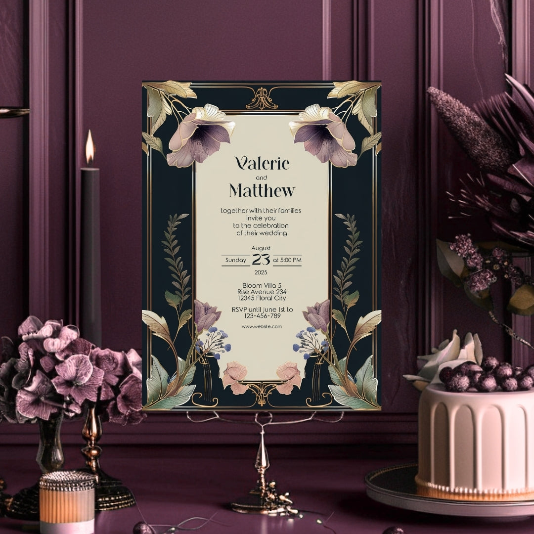 Discover the elegance of twilight with our "Twilight Garden Art Deco Invitation", a customizable e-invitation that marries the timeless glamour of the Art Deco period with the mystical allure of an evening garden. The design features a symphony of muted golds and navy, paired with dusky purple florals and sophisticated foliage, creating an invitation that’s perfect for your wedding, milestone birthday, or any chic celebration. The invitation offers an editable layout for ease and convenience, allowing you to add a personal touch before digitally sharing with your guests or opting for a traditional printed invitation.