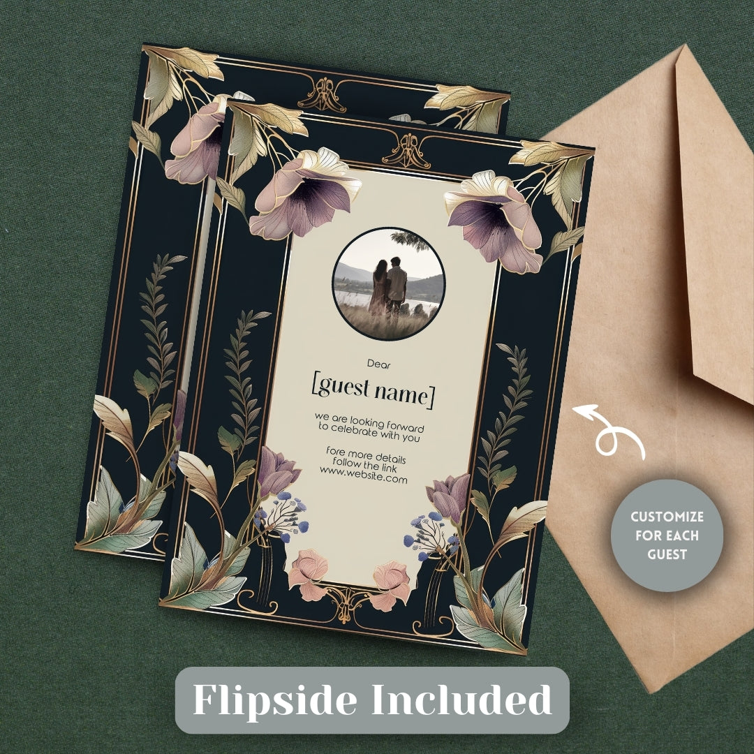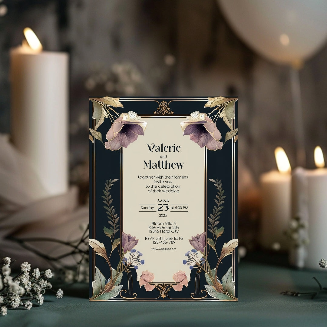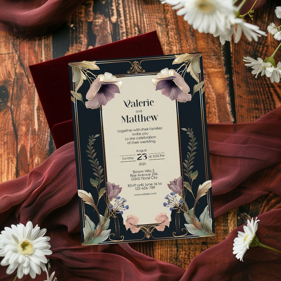 Discover the elegance of twilight with our "Twilight Garden Art Deco Invitation", a customizable e-invitation that marries the timeless glamour of the Art Deco period with the mystical allure of an evening garden. The design features a symphony of muted golds and navy, paired with dusky purple florals and sophisticated foliage, creating an invitation that’s perfect for your wedding, milestone birthday, or any chic celebration. The invitation offers an editable layout for ease and convenience, allowing you to add a personal touch before digitally sharing with your guests or opting for a traditional printed invitation.