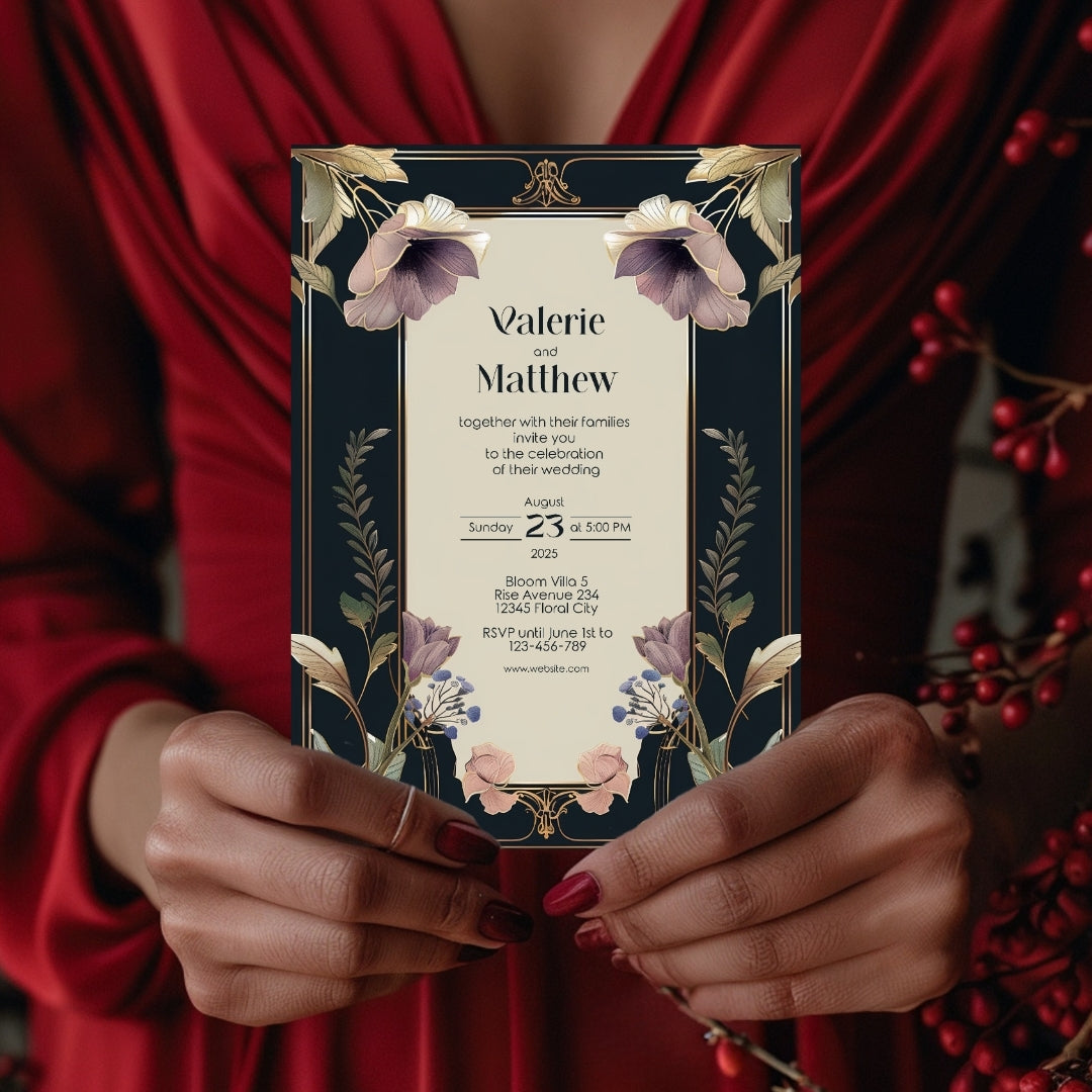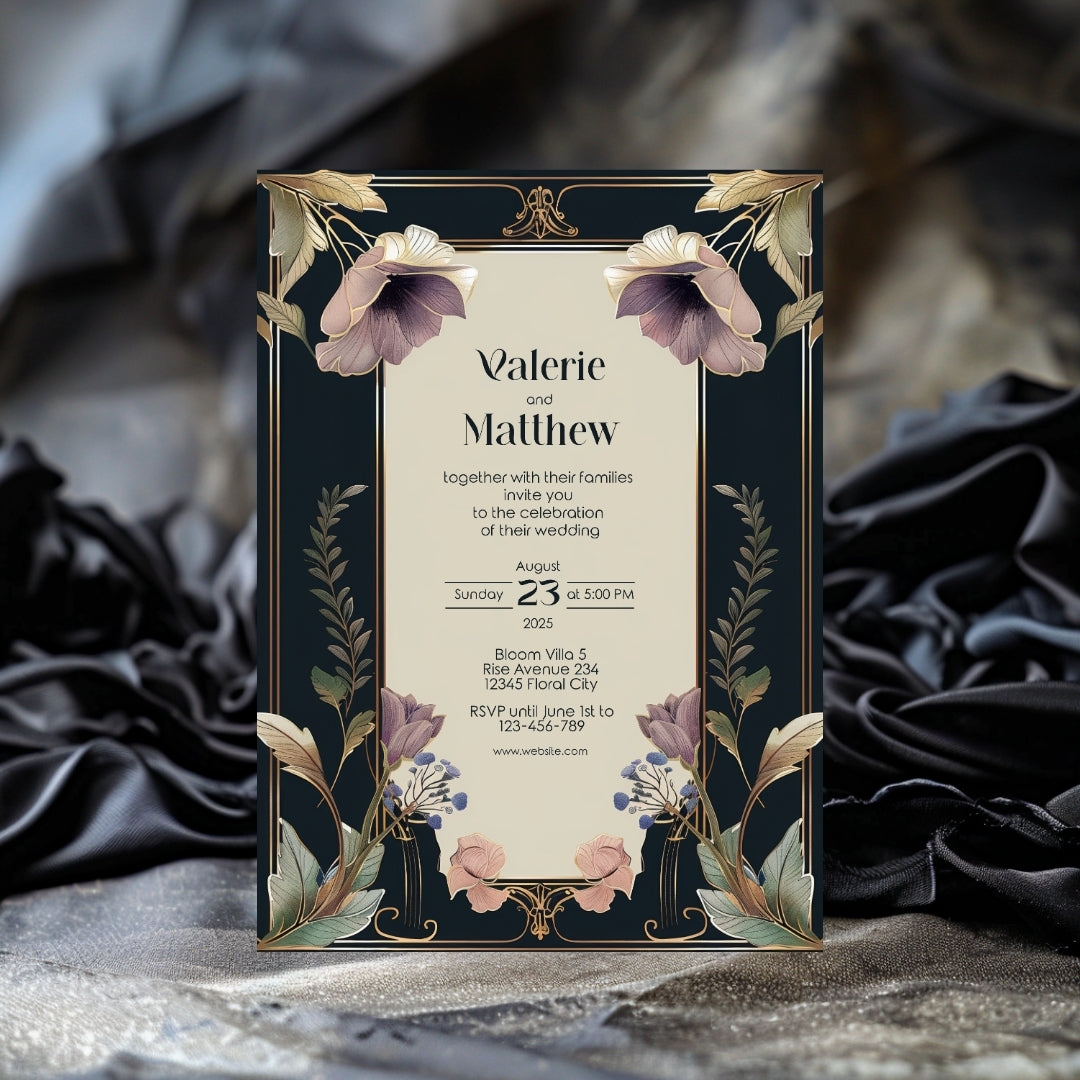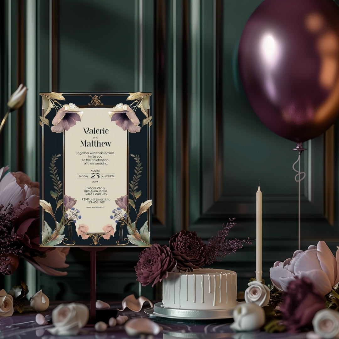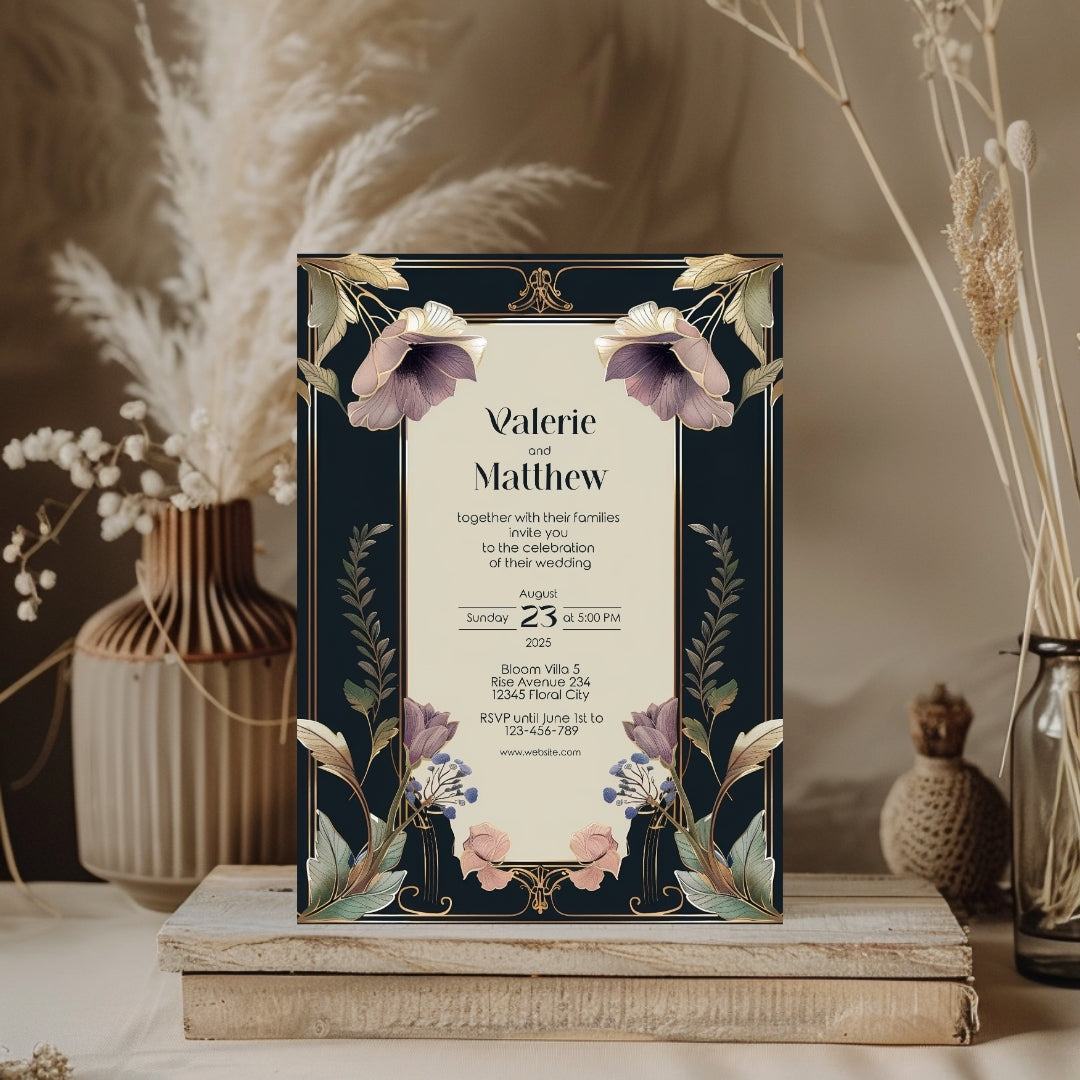 Discover the elegance of twilight with our "Twilight Garden Art Deco Invitation", a customizable e-invitation that marries the timeless glamour of the Art Deco period with the mystical allure of an evening garden. The design features a symphony of muted golds and navy, paired with dusky purple florals and sophisticated foliage, creating an invitation that’s perfect for your wedding, milestone birthday, or any chic celebration. The invitation offers an editable layout for ease and convenience, allowing you to add a personal touch before digitally sharing with your guests or opting for a traditional printed invitation.
