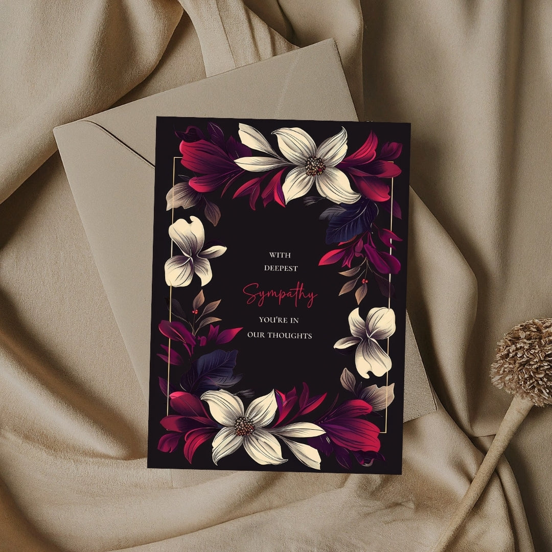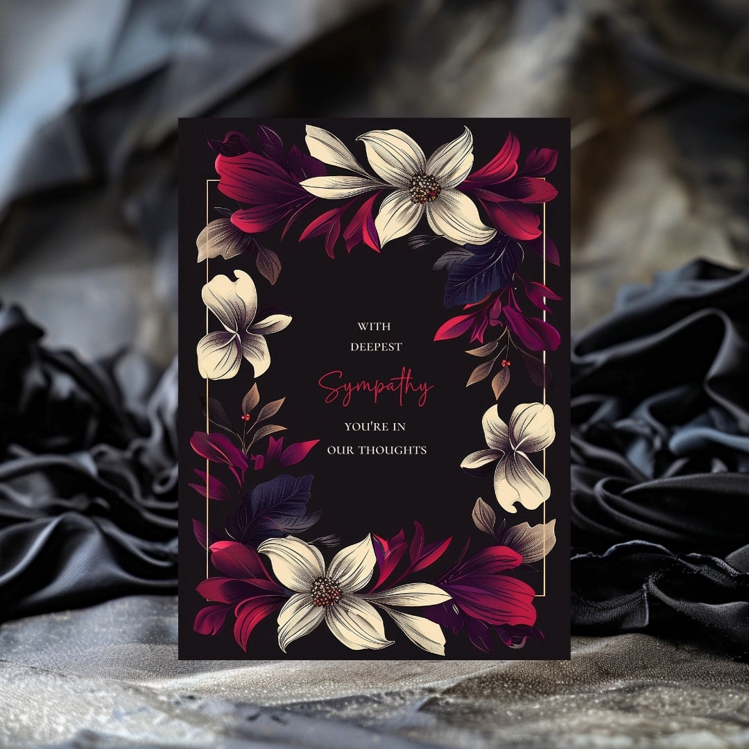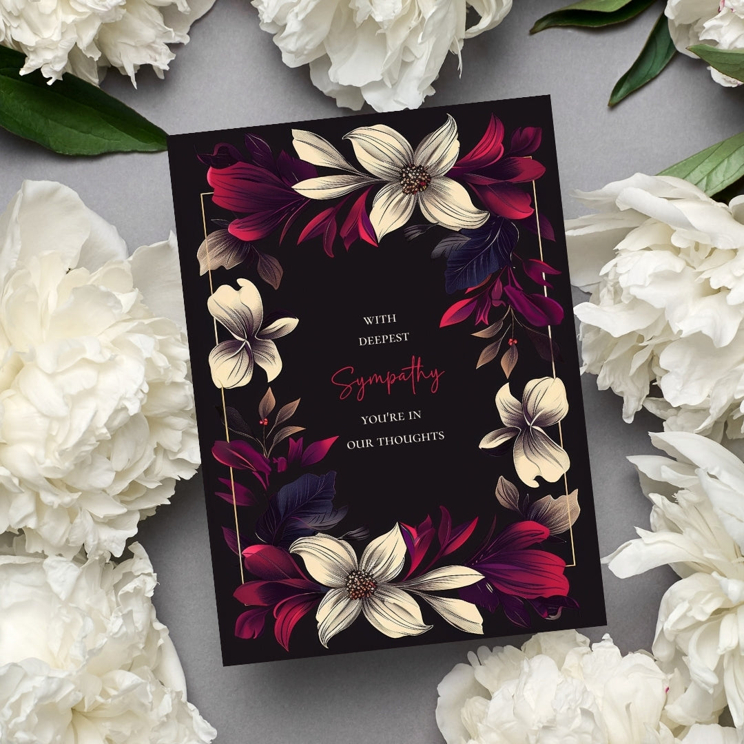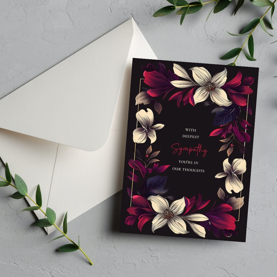 Our sympathy card features a dark black background adorned with beautifully detailed floral elements in vibrant shades of cream, red, and purple. The centralized text is framed by a symmetrical arrangement of flowers and leaves, adding a touch of nature-inspired elegance.